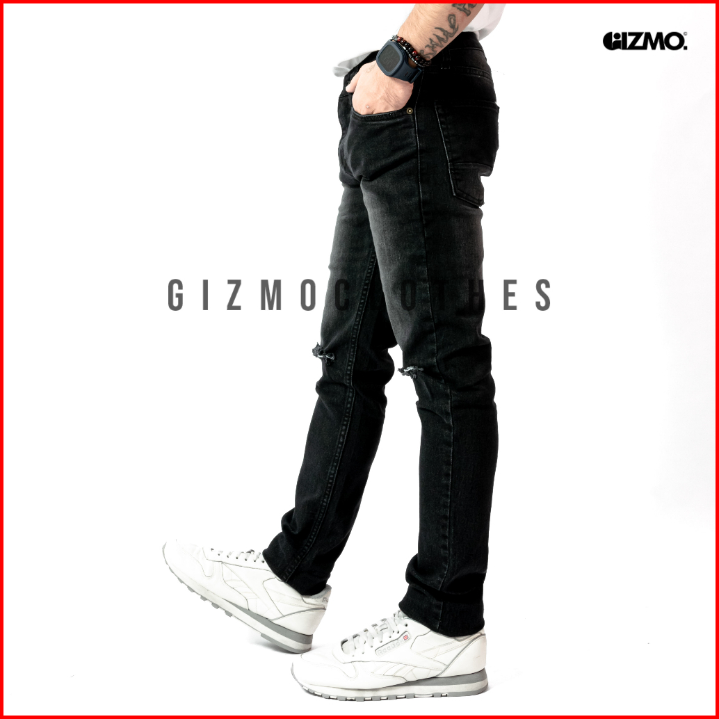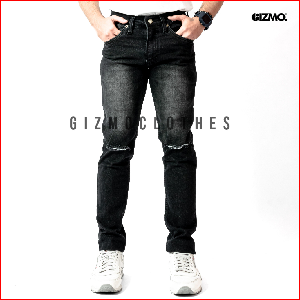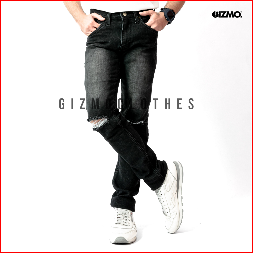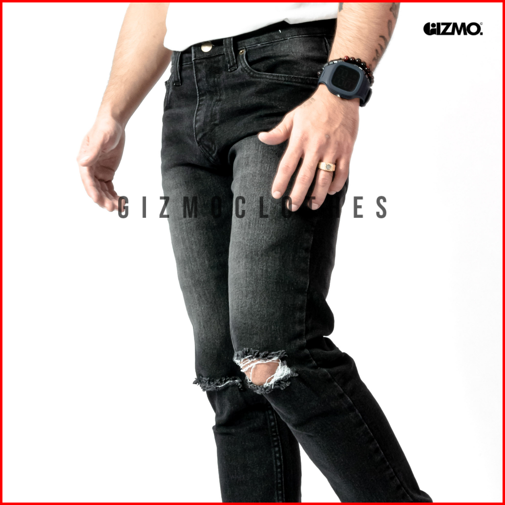 Gizmo - Celana Sobek Pria Black Jazz Ripped Jeans Robek Lutut Soft Denim Strech Skinny Fit Hitam Ripped