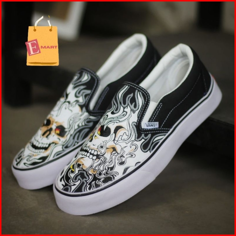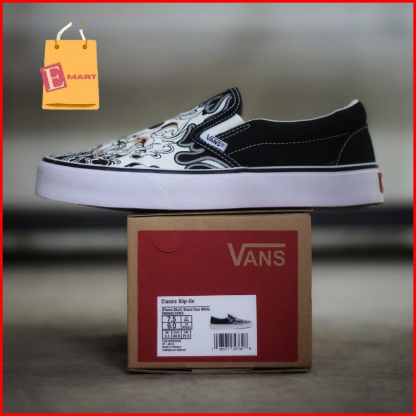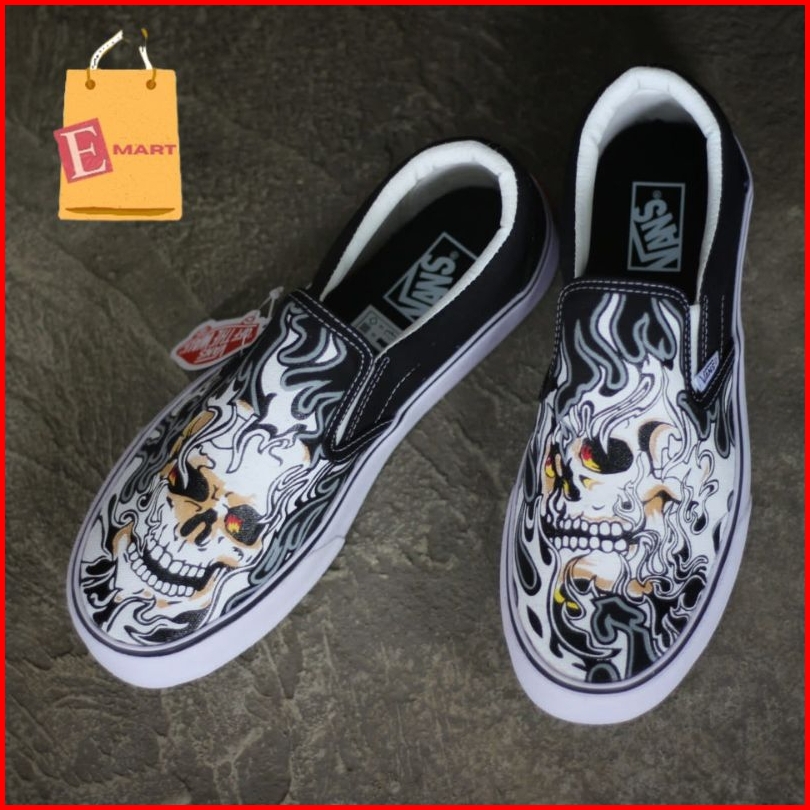 Promo Sepatu Casual Pria Dan Wanita Sneakers Slip On Flame Skull Black True White Premium Import Quality Tag Made In Vie