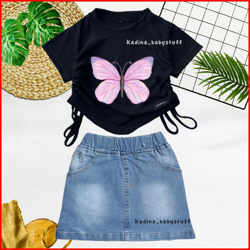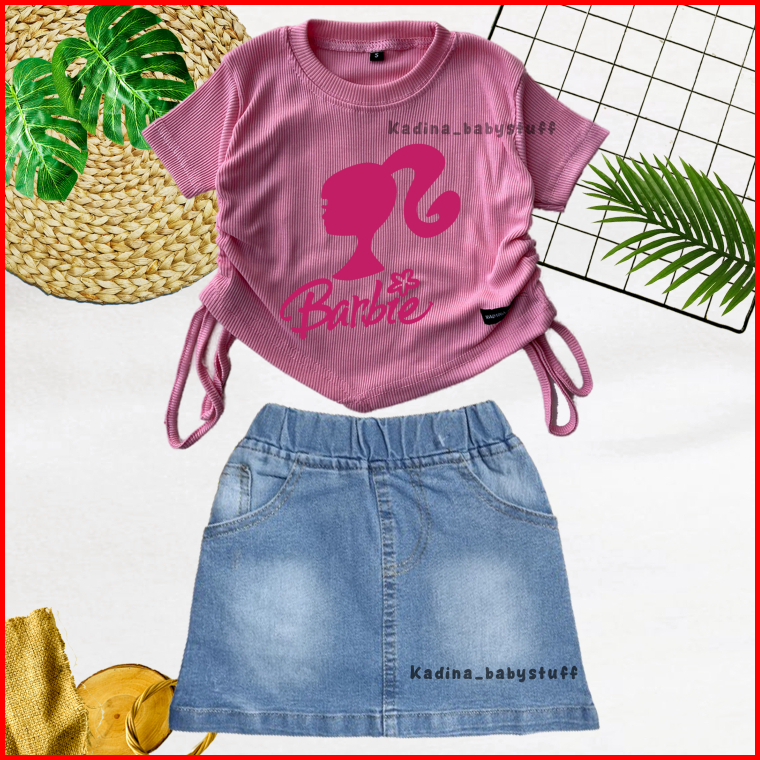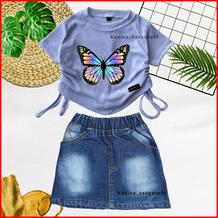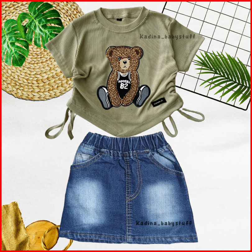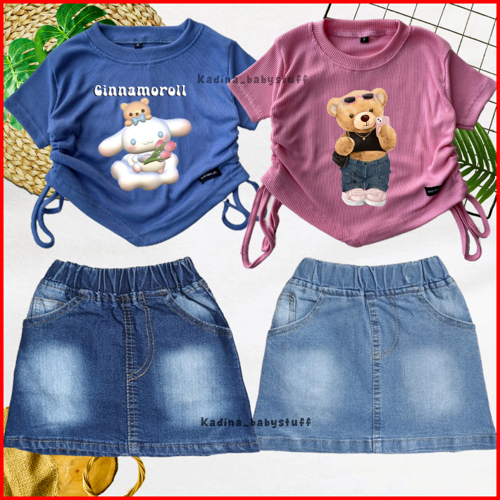 Setelan Anak Perempuan Rok Pendek Jeans Sand Wash Croptop Motif Sablon Karakter Lucu Anak Usia 1-8 Tahun