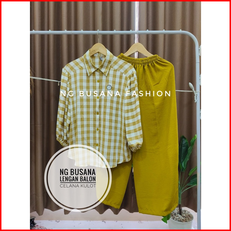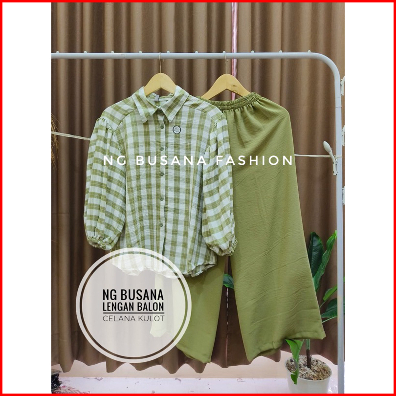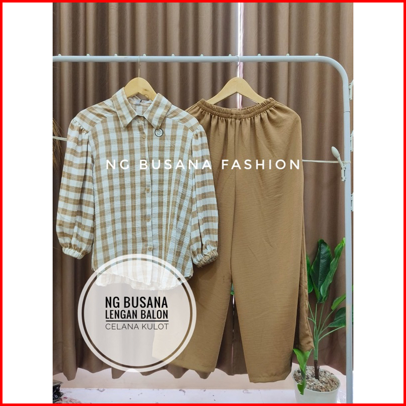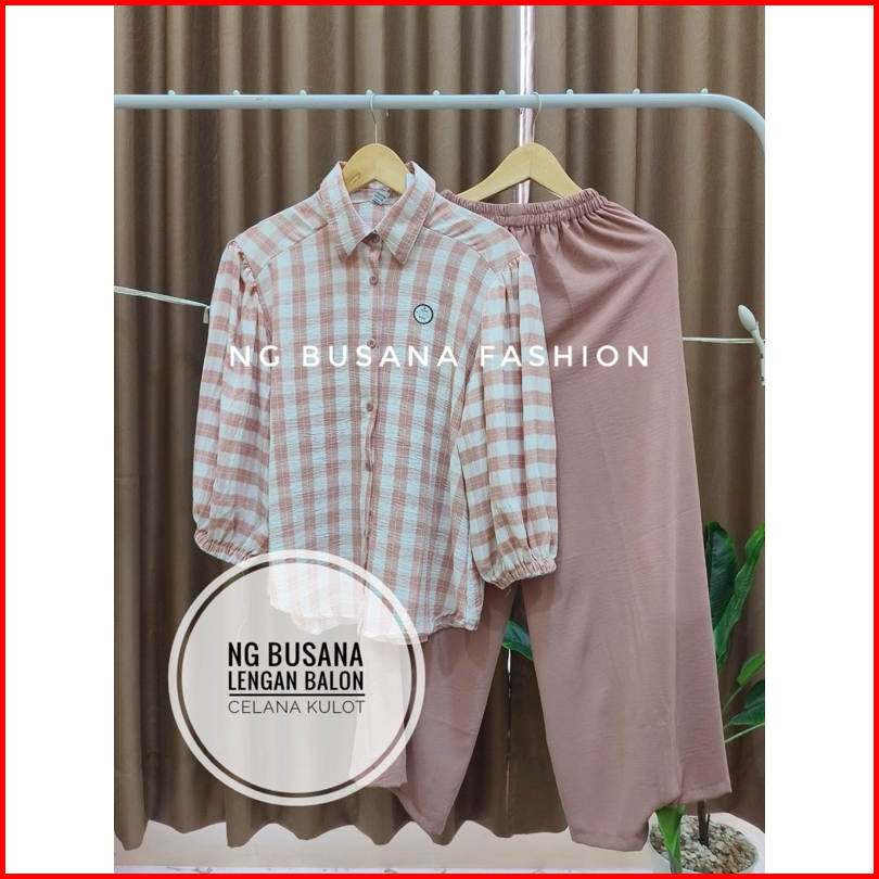 Setelan Wanita Terbaru Kombinasi Kotak Lengan Balon Crinkle Airflow Celana Kulot Wanita