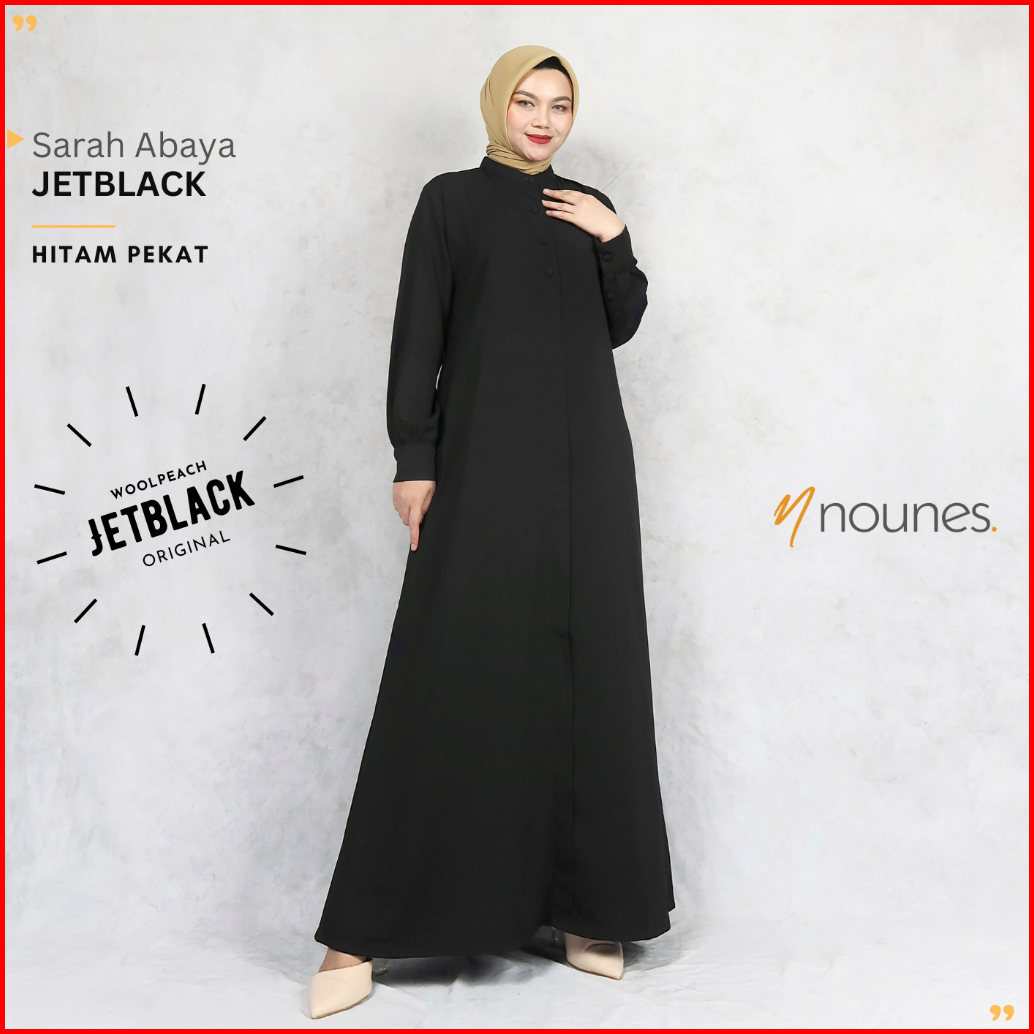 Jetblack Nounes Sarah Abaya Gamis Polos Syari Wanita Warna Hitam Pekat Manset Kancing