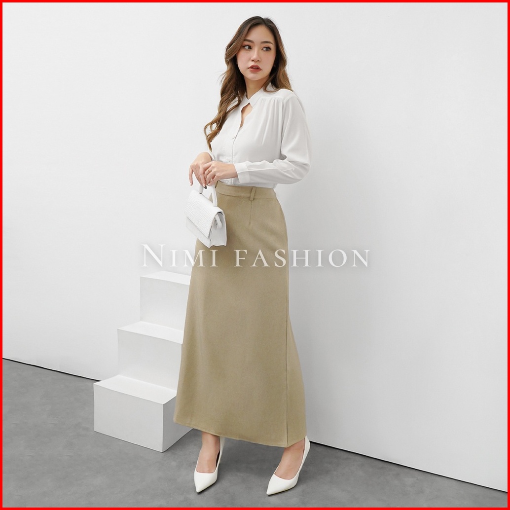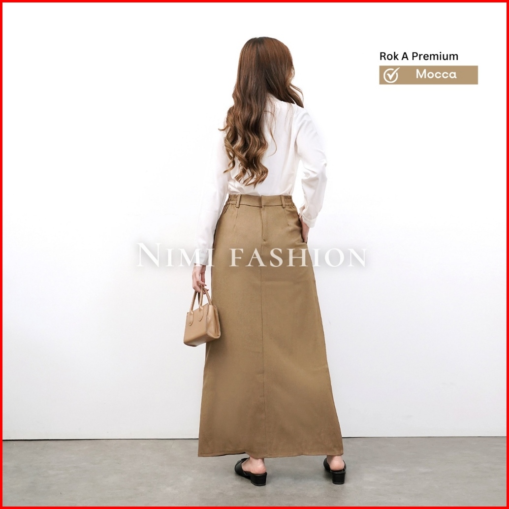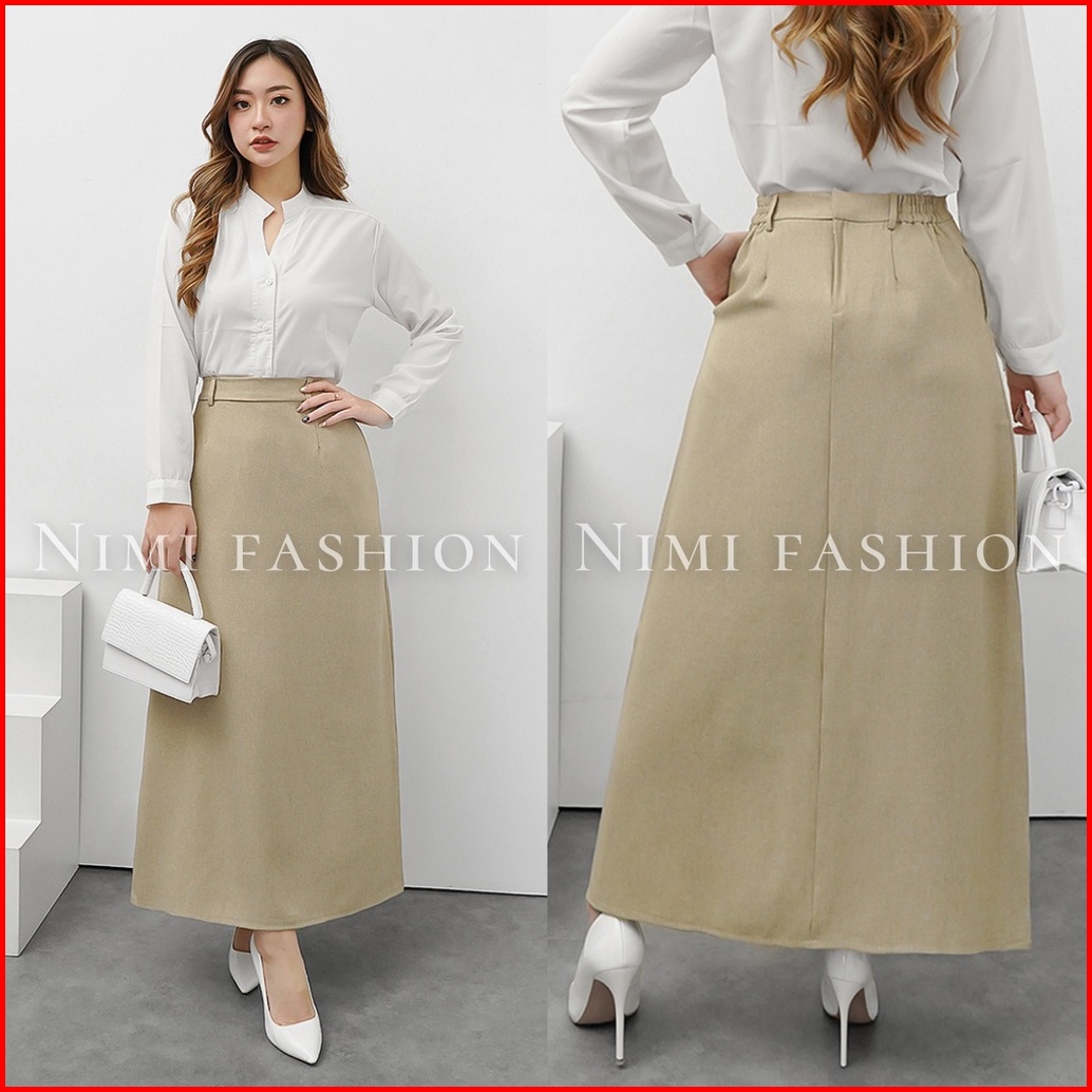 Nimi - Rok Kerja Wanita Panjang Rok A Line Formal Pinggang Karet Sisi Samping Kancing Kait Resleting Wanita