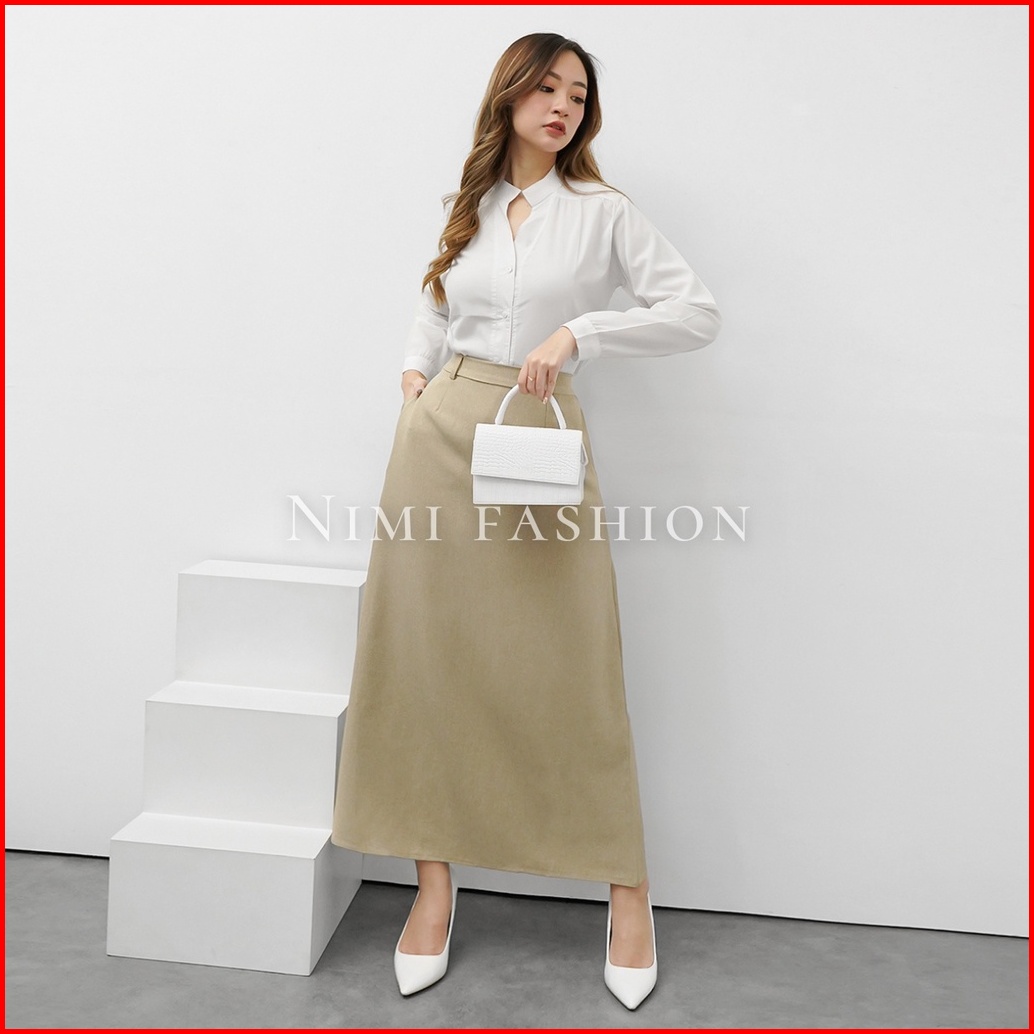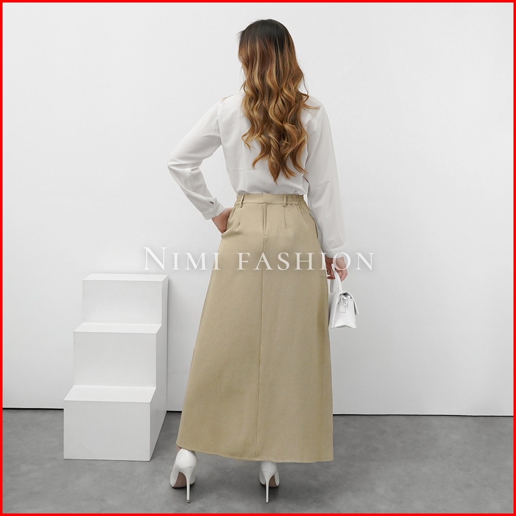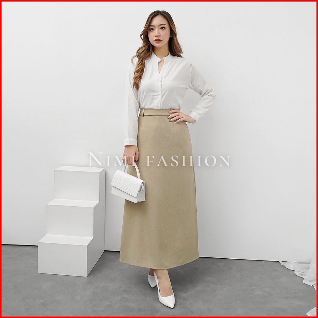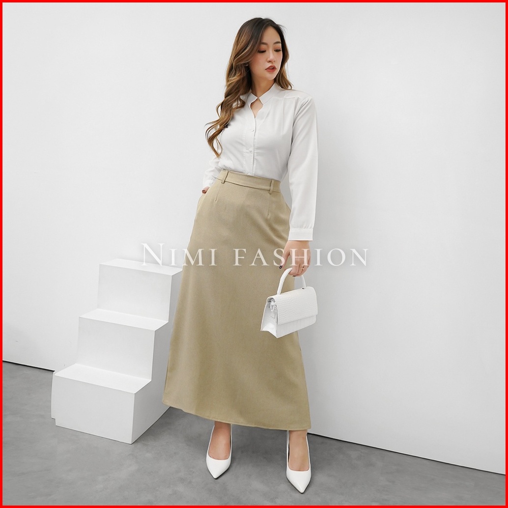 Nimi - Rok Kerja Wanita Panjang Rok A Line Formal Pinggang Karet Sisi Samping Kancing Kait Resleting Wanita