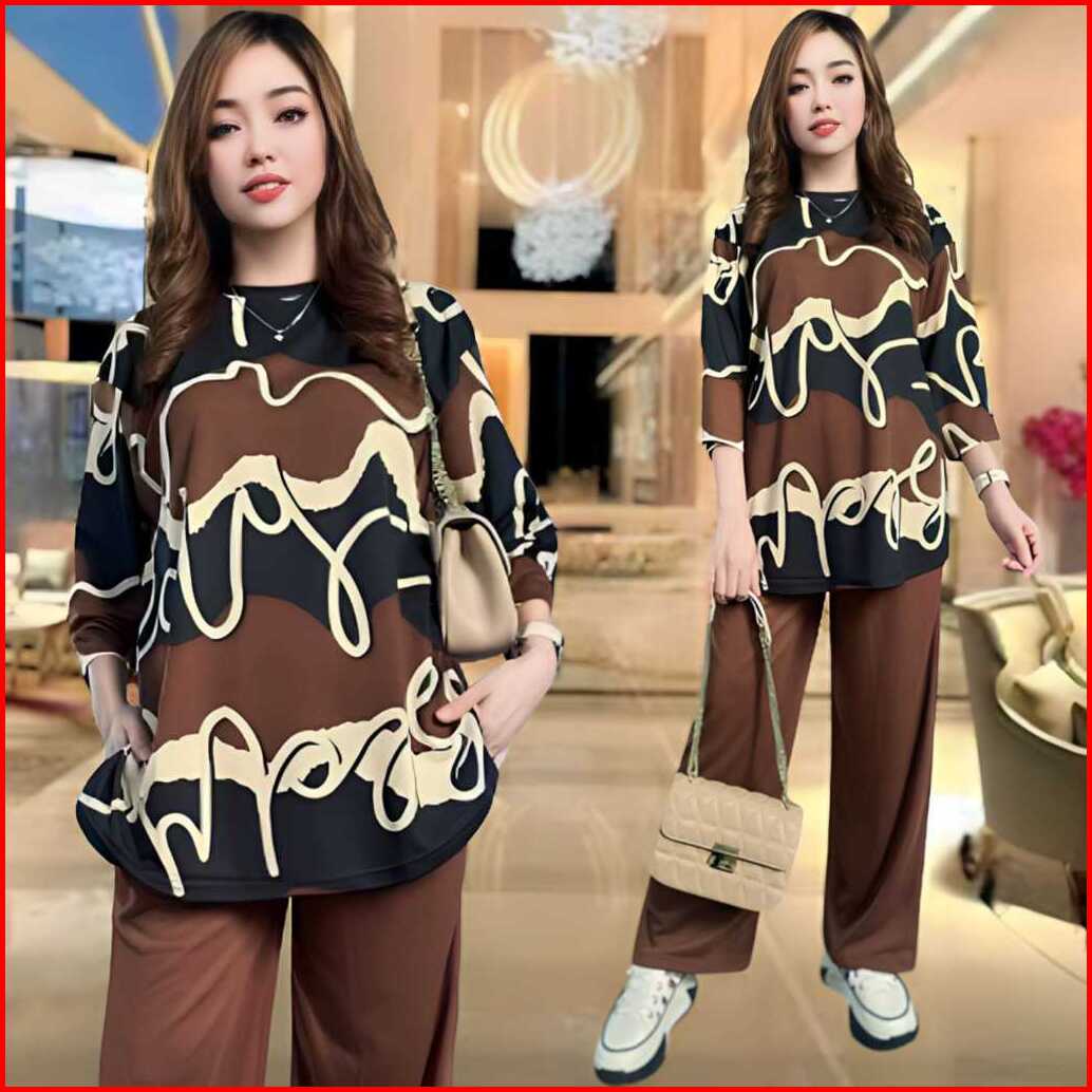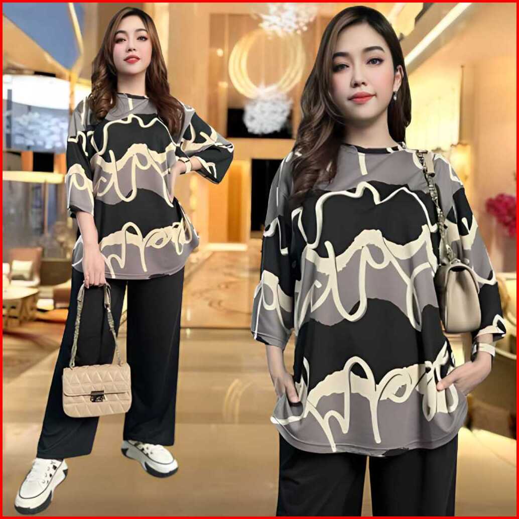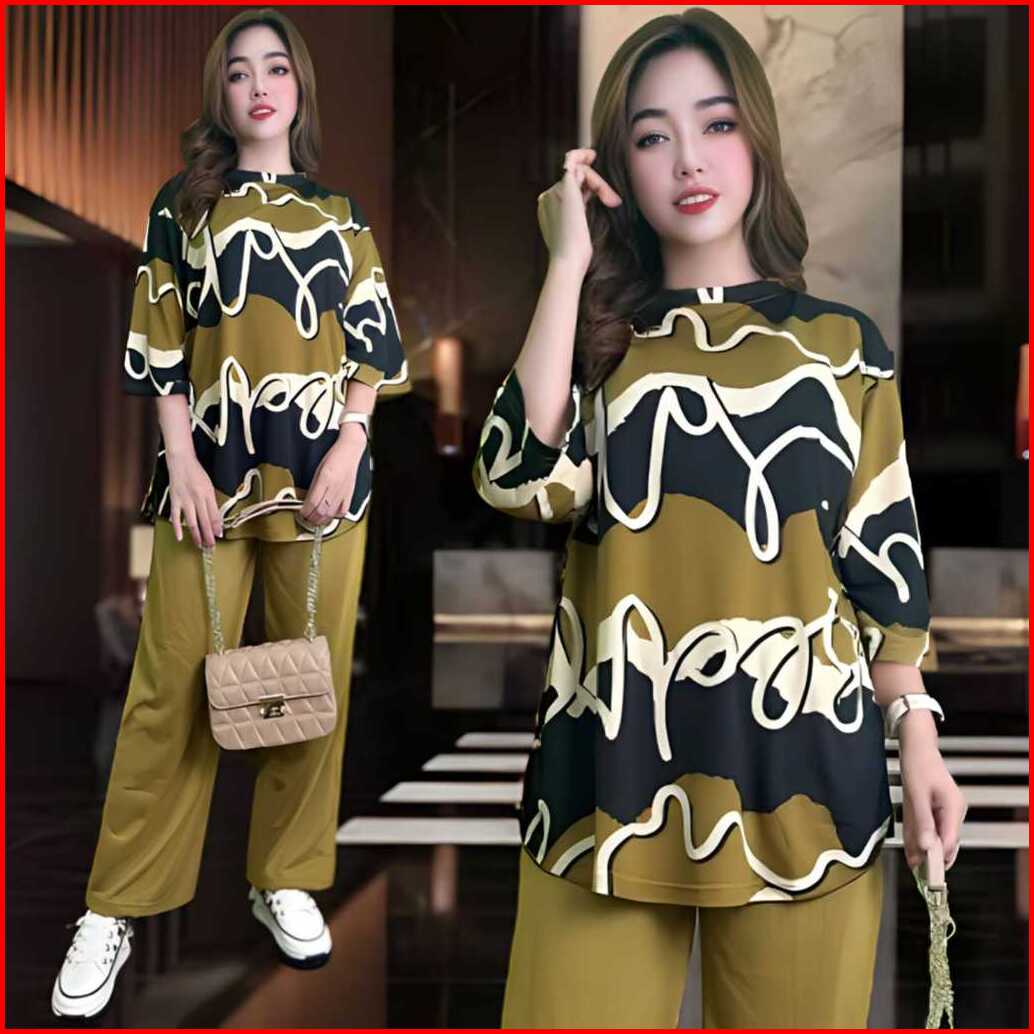 Shafza Setelan Wanita Ld 120 Celana Lurus Dan Atasan Oval Belahan Kiri Dan Kanan Oversize Wanita Celana Lurus Karet Kant