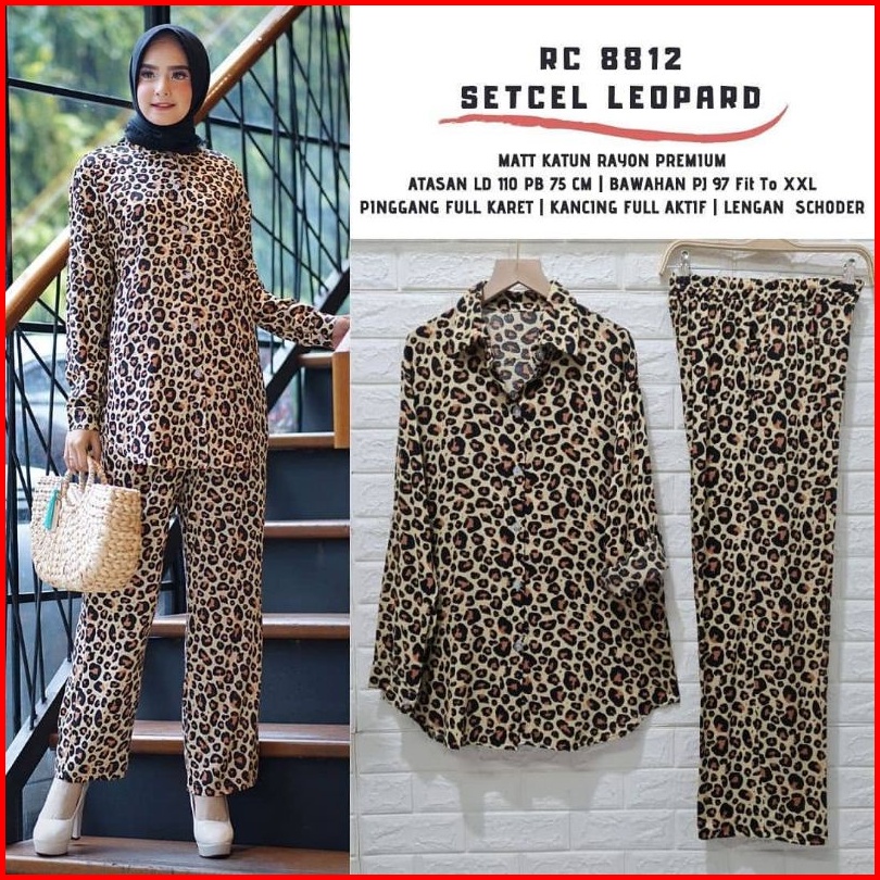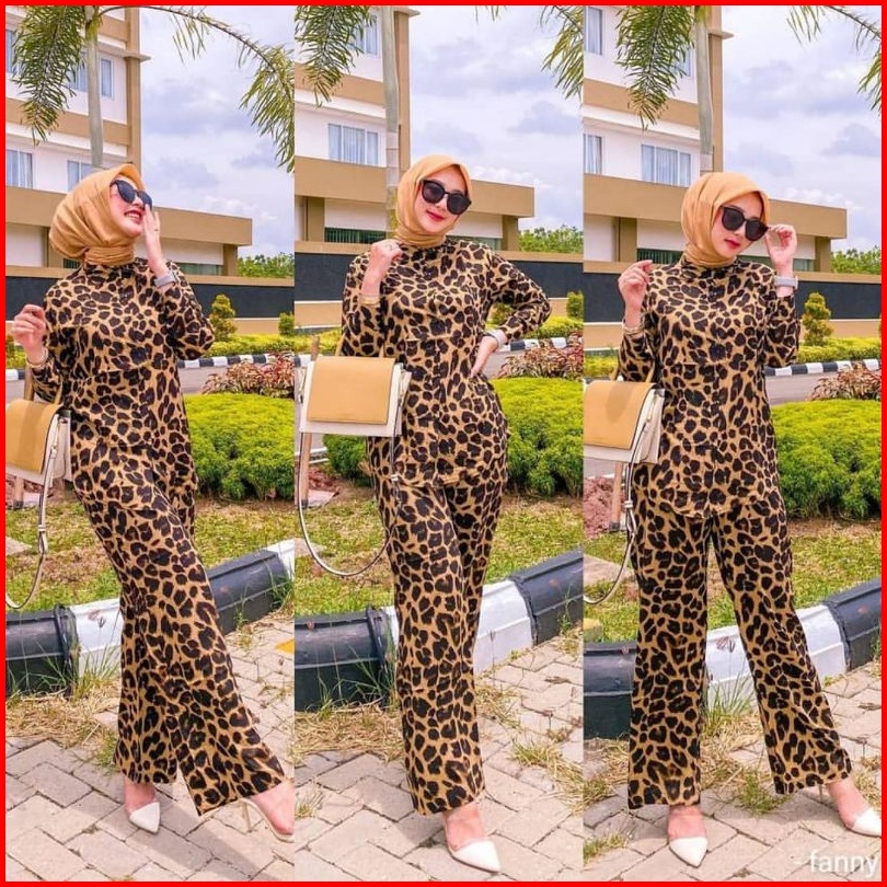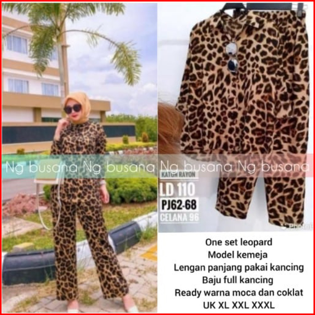 One Set Wanita Terbaru Motif Leopard Setelan Kemaja Macan Lengan Panjang Bahan Rayon Premium Adem Dan Tidak Luntur