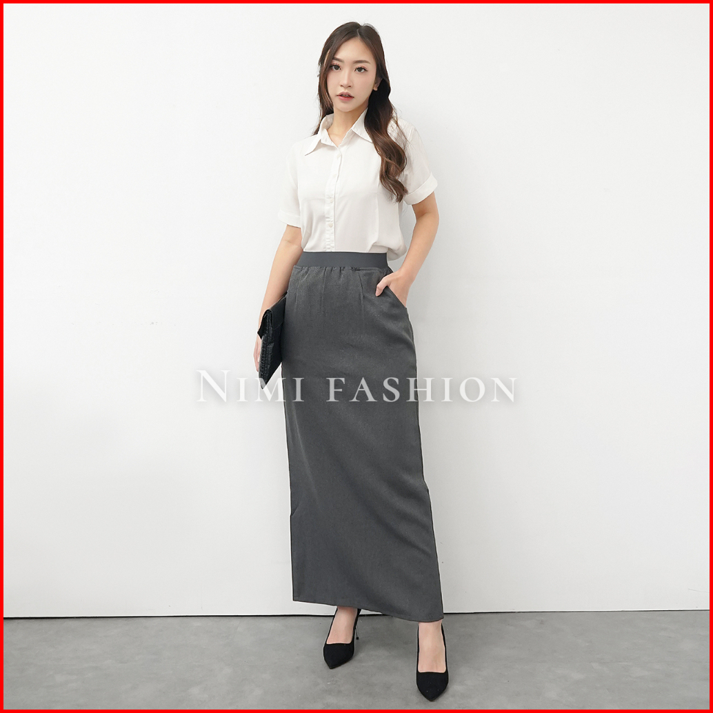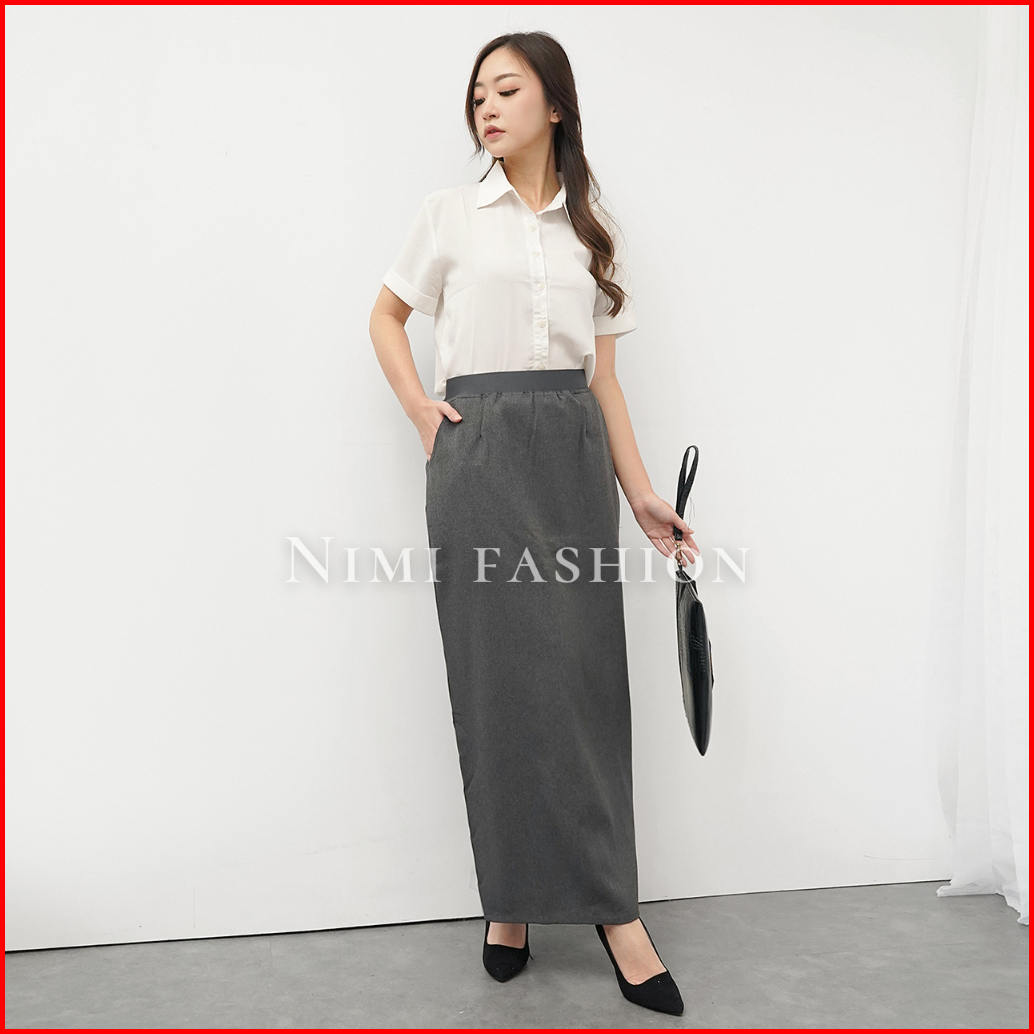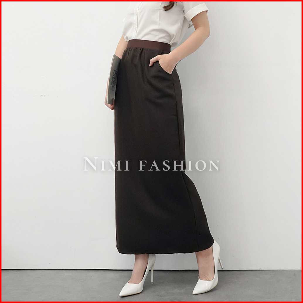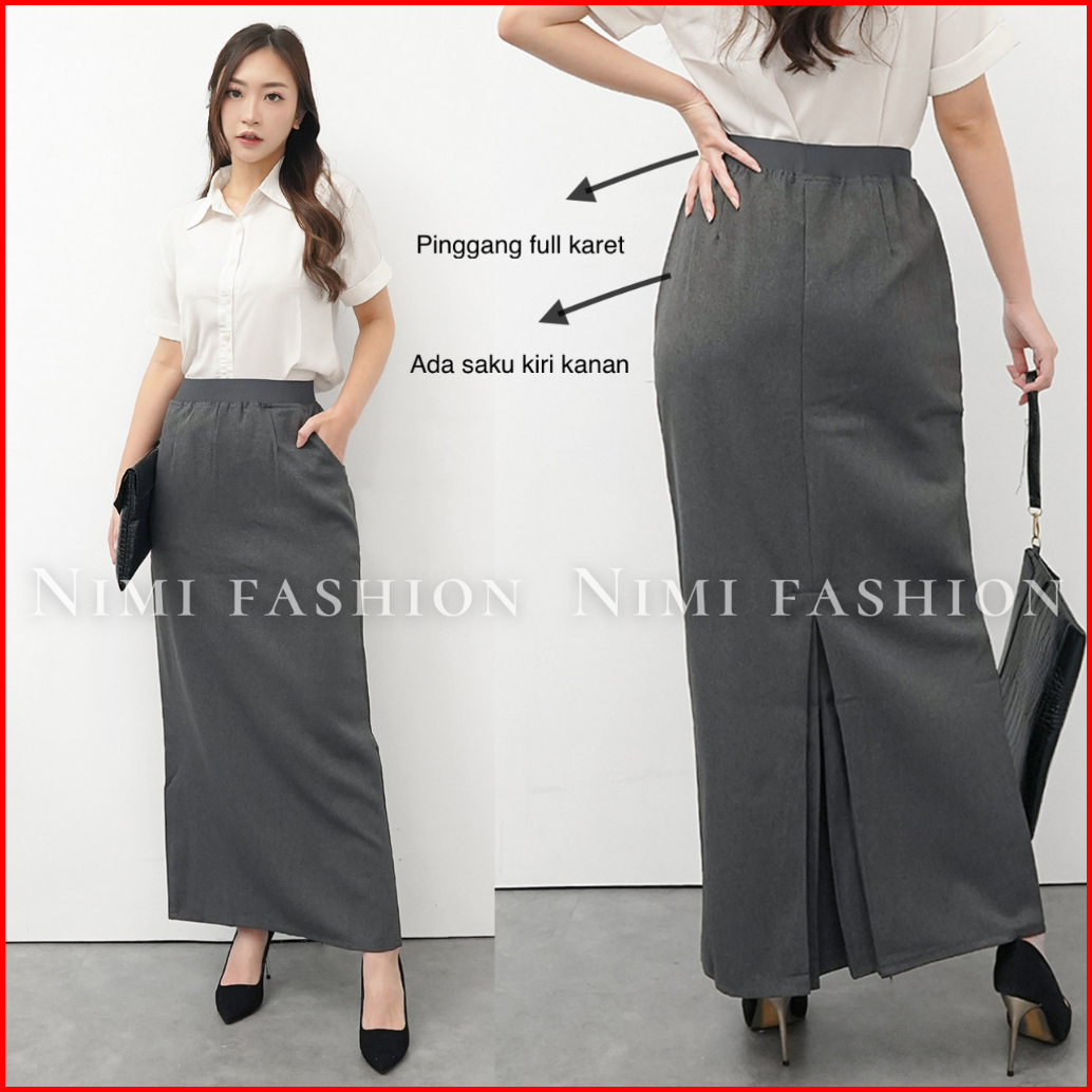 Nimi - Rok Kerja Panjang Span Rempel Belakang Pinggang Karet Bahan Kantor Formal Wanita