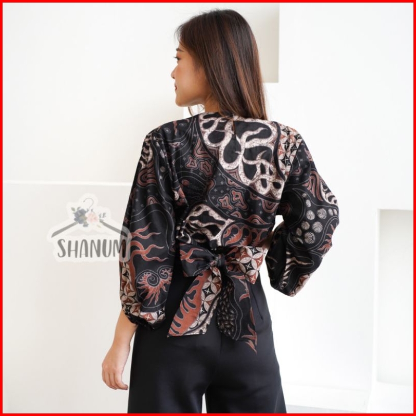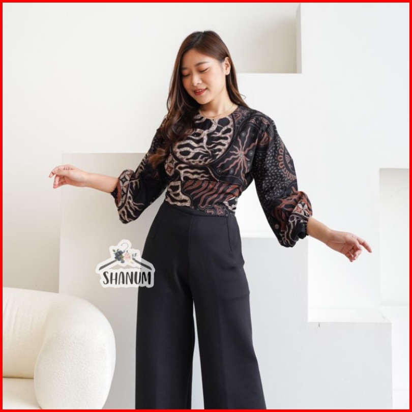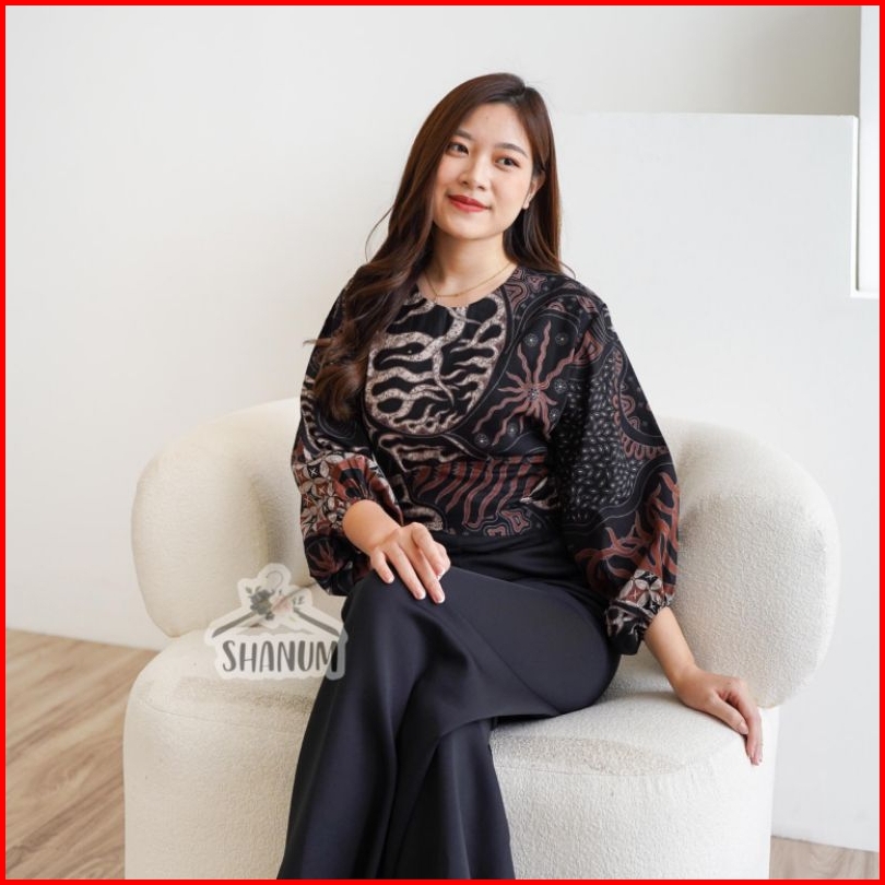 Atasan Blouse Batik Lengan Balon Atasan Wanita Lengan Plum Batik Motif Kawung Angkasa