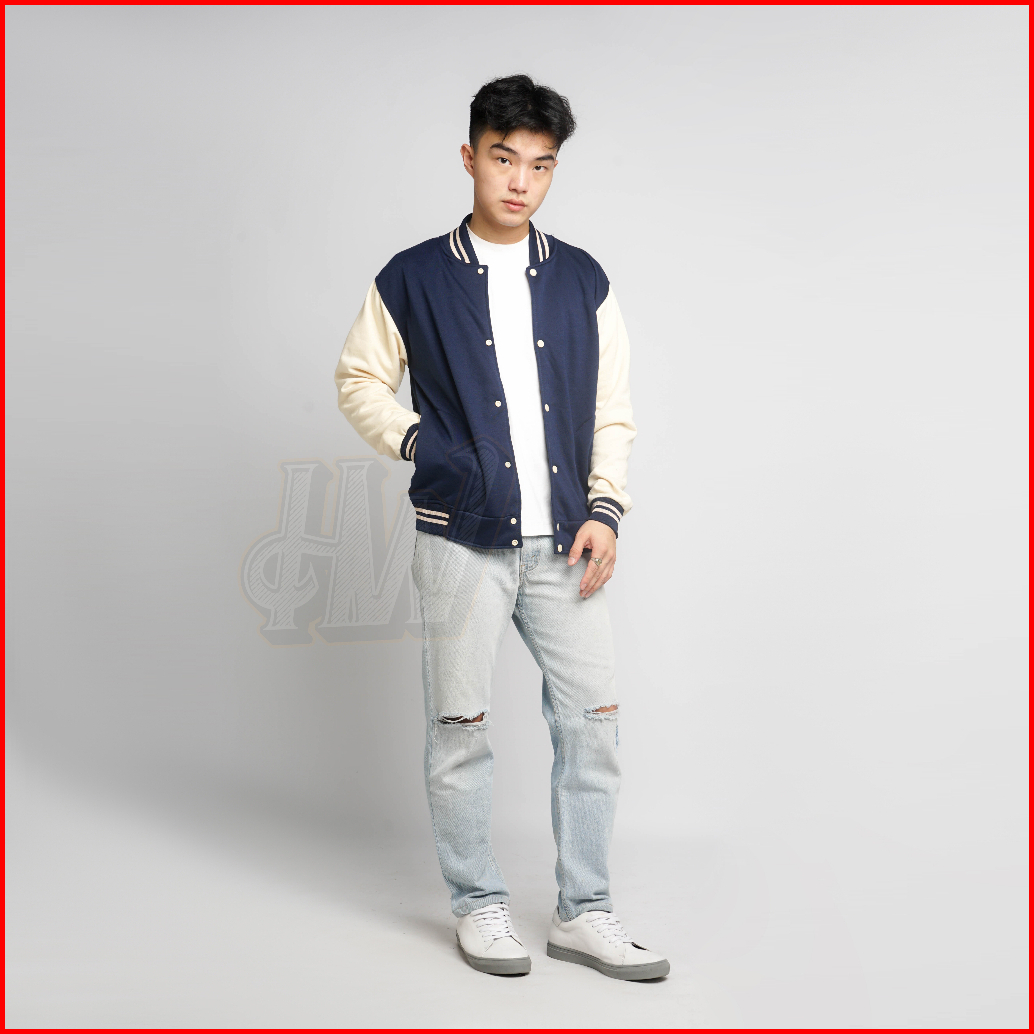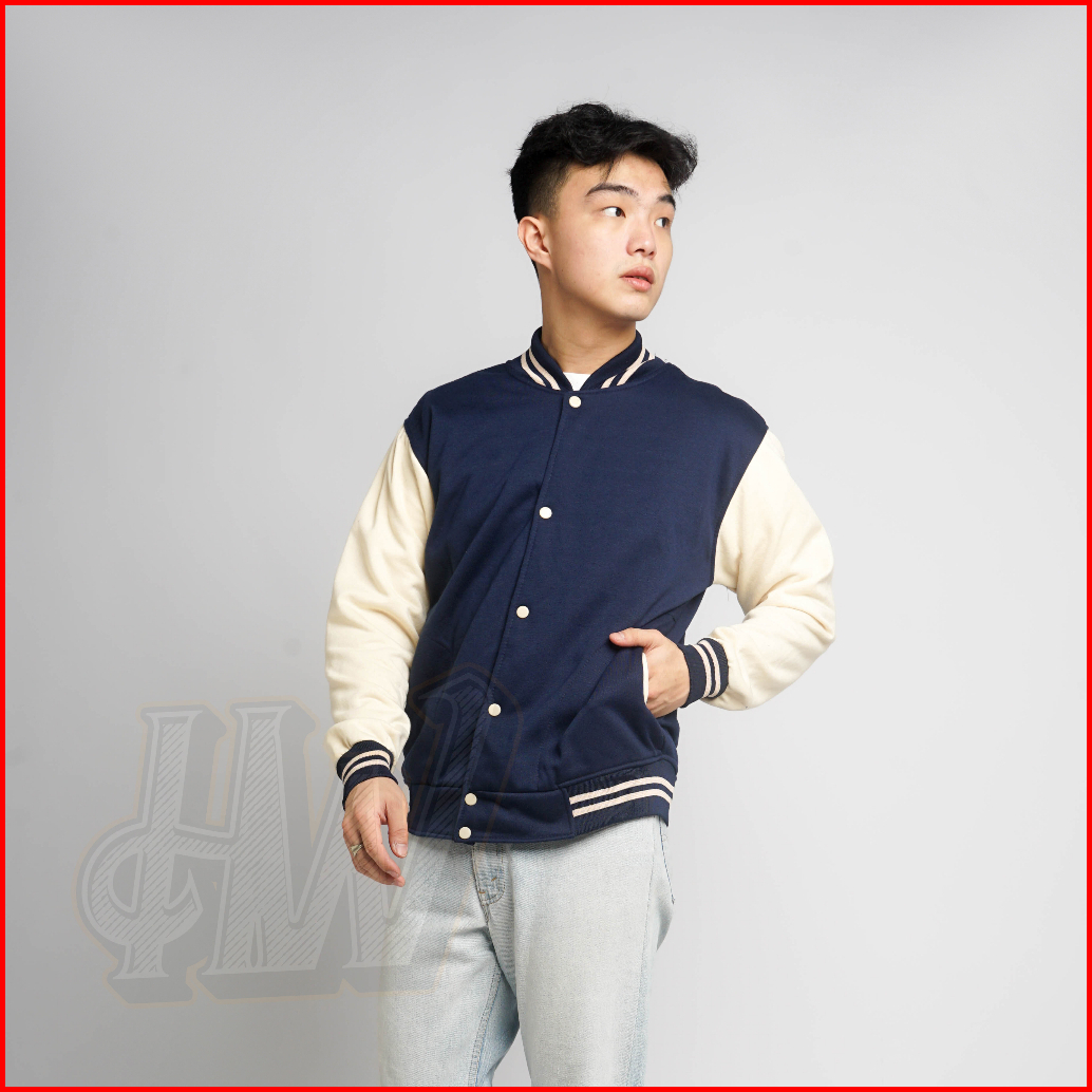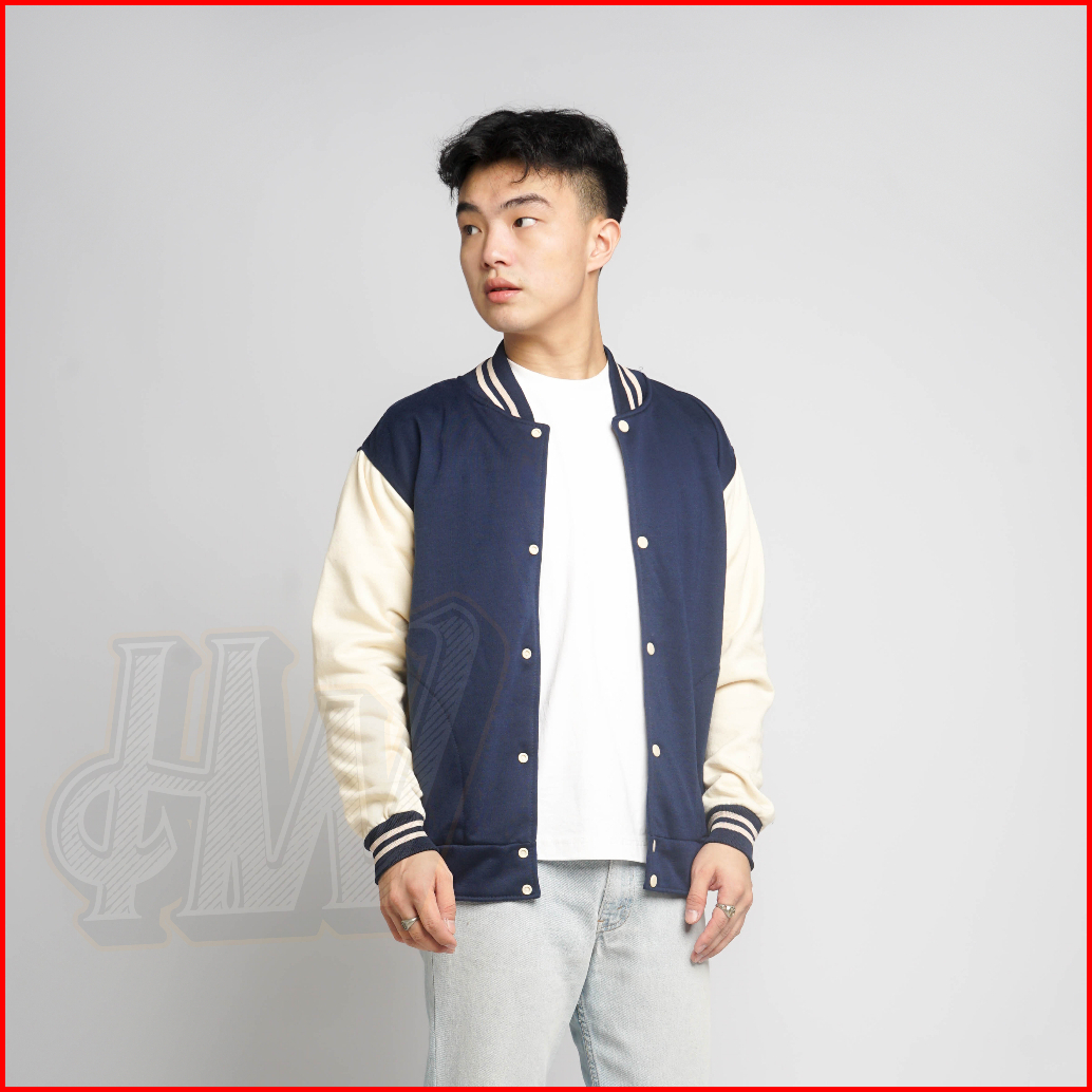 Jaket Basebal Varsity Kancing Navy Tangan Cream Polos Pria Dan Wanita Unisex M-xxl