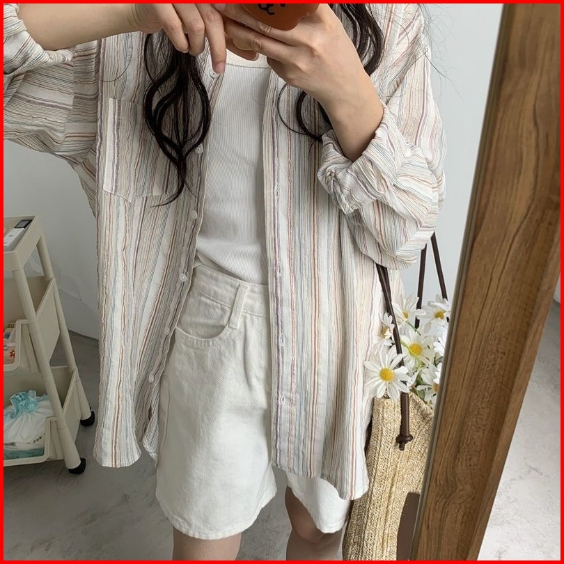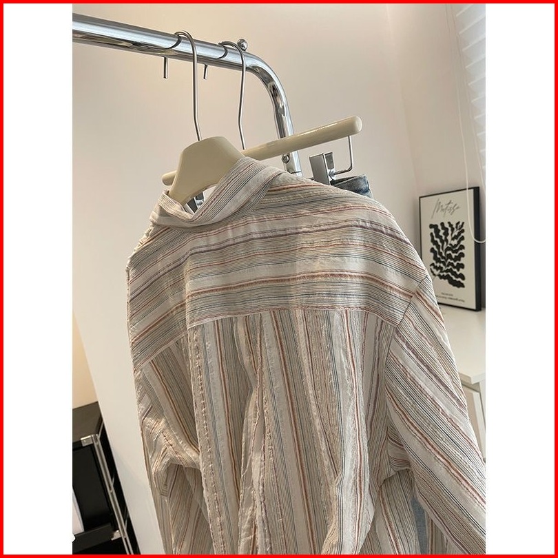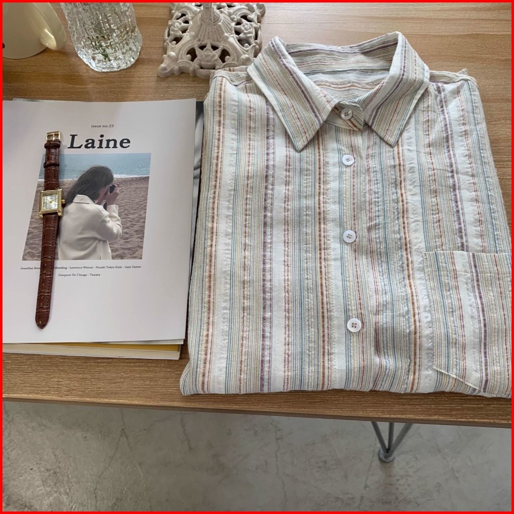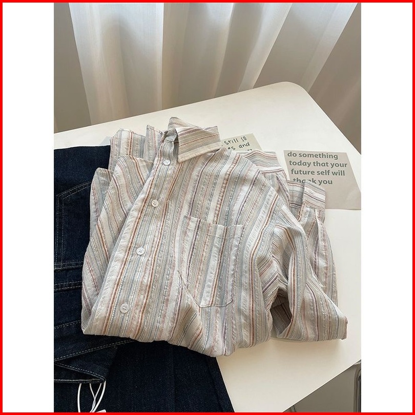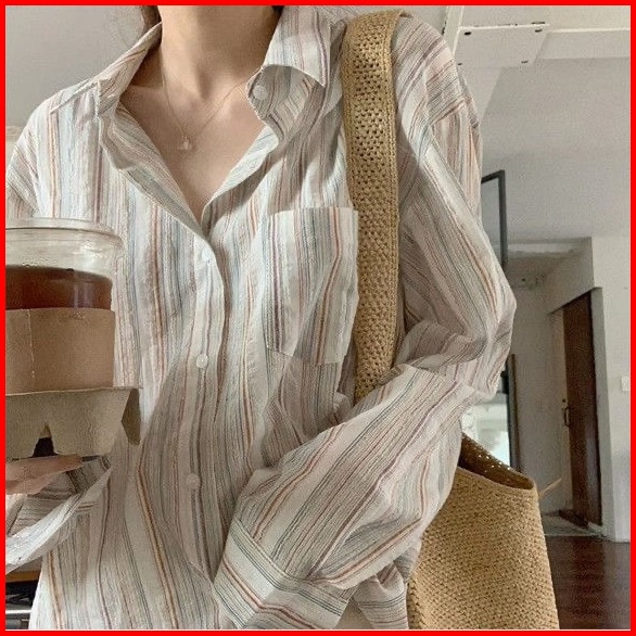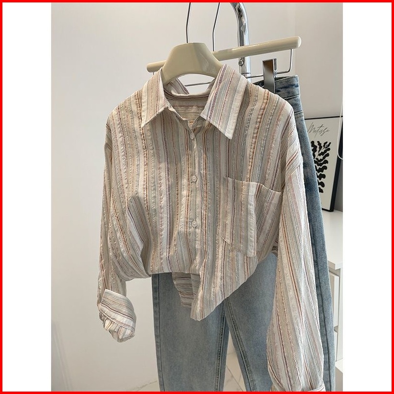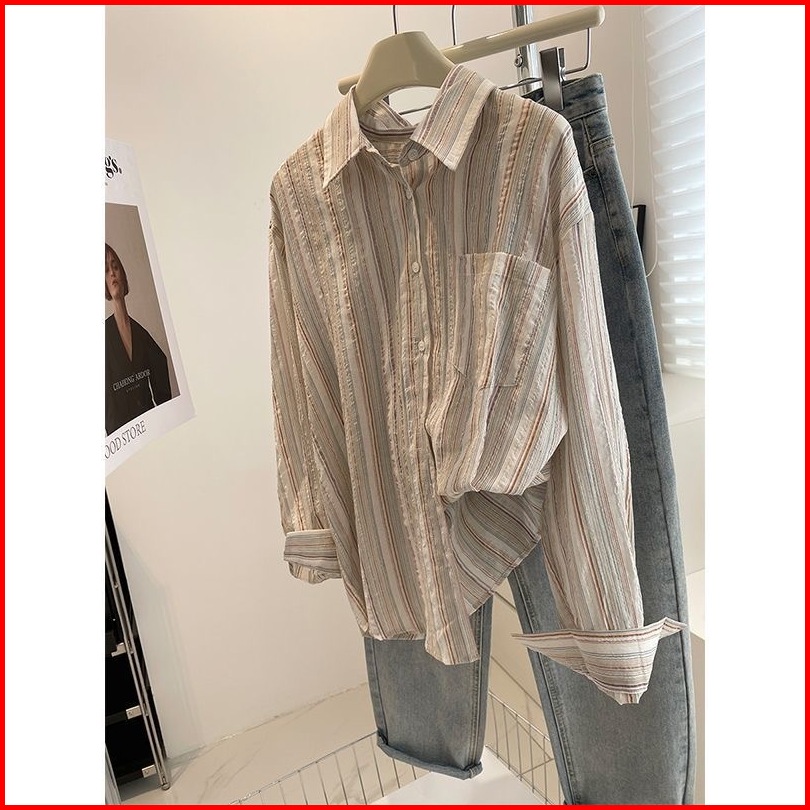 Xiaozhainv Full Katun Cotton Salur Casual Longgar Lengan Panjang Wanita Kemeja Bergaris Baju Atasan Wanita Kekinian Prem