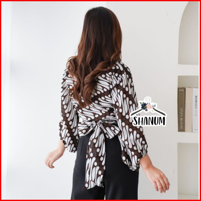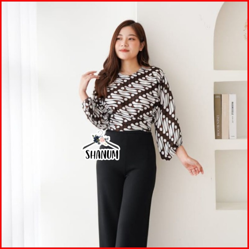 Blouse Batik Wanita Modern Atasan Batik Kerja Wanita Batik Pastel Seno Gajah Lengan Plum Balon
