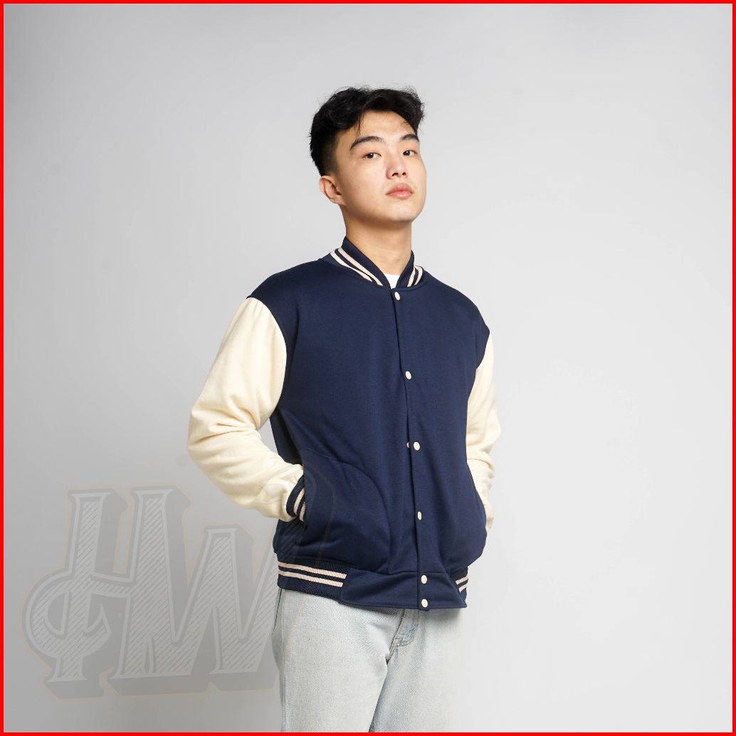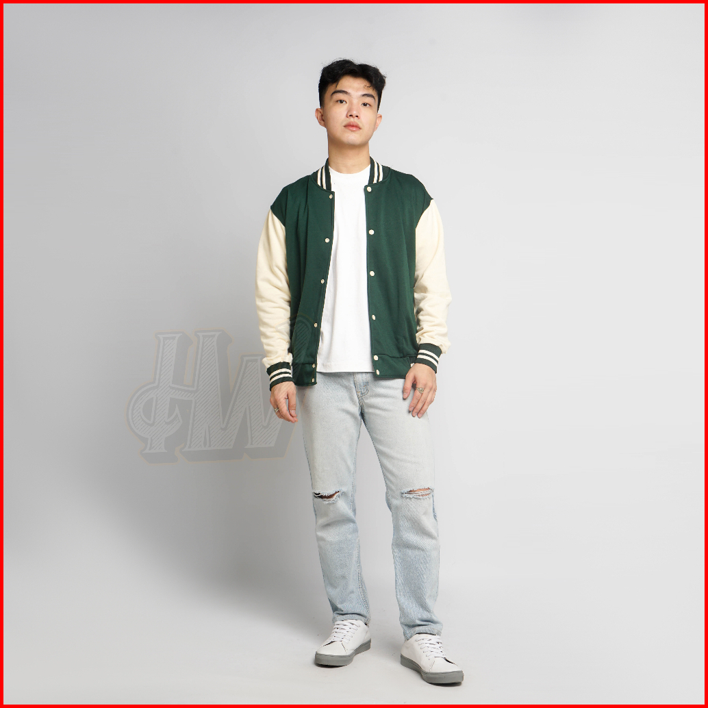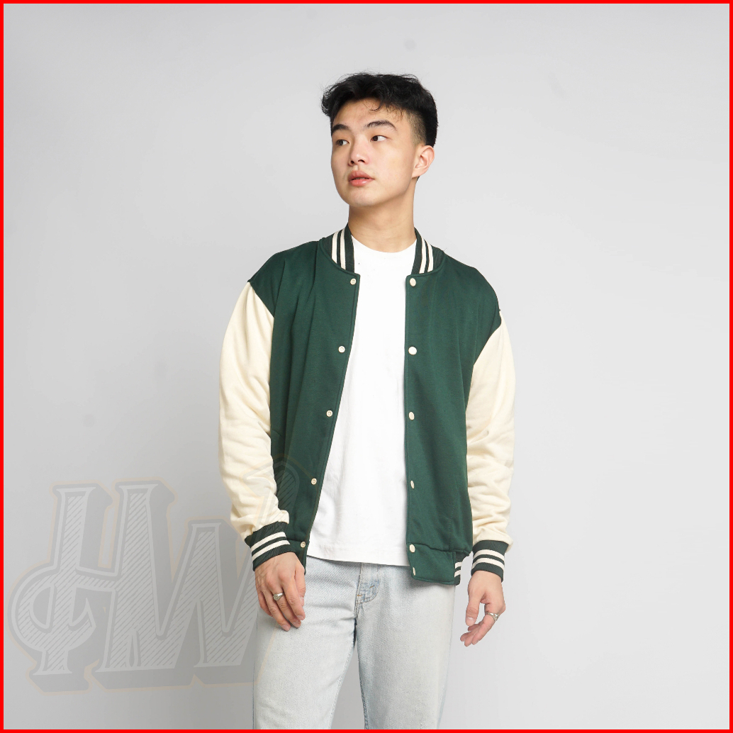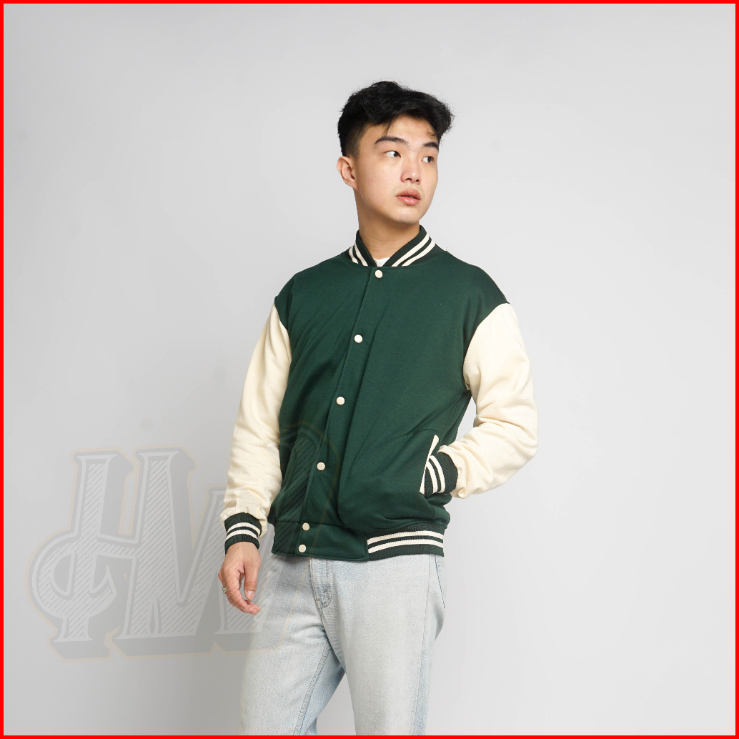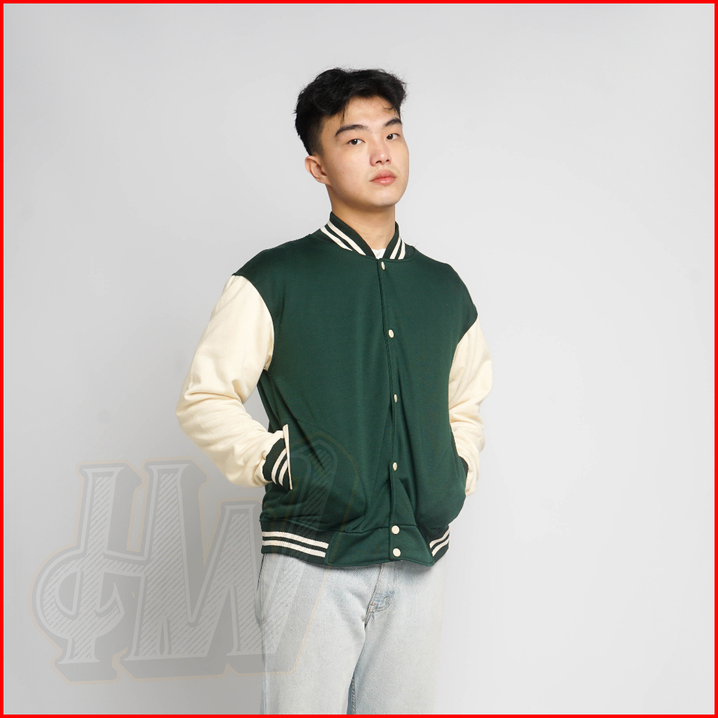 Jaket Basebal Varsity Kancing Hijau Tangan Cream Polos Pria Dan Wanita Unisex M-xxl