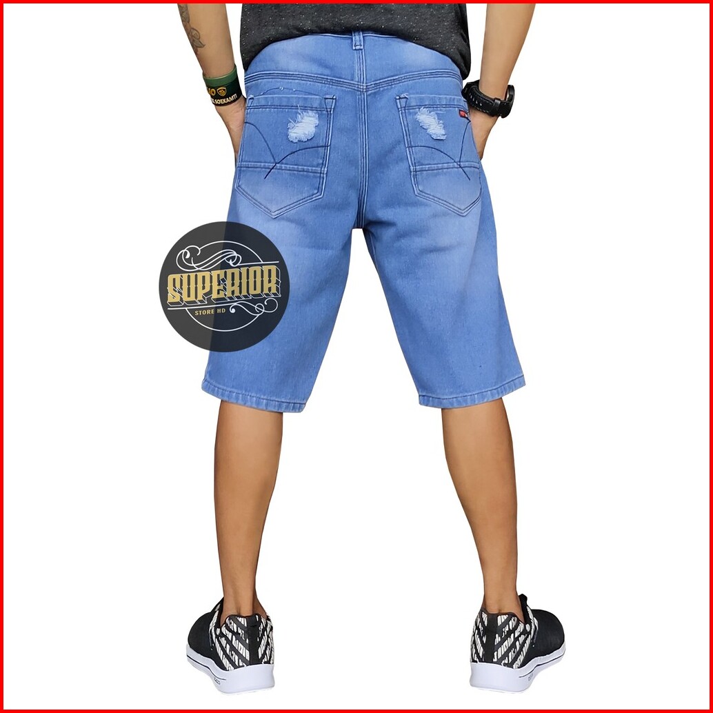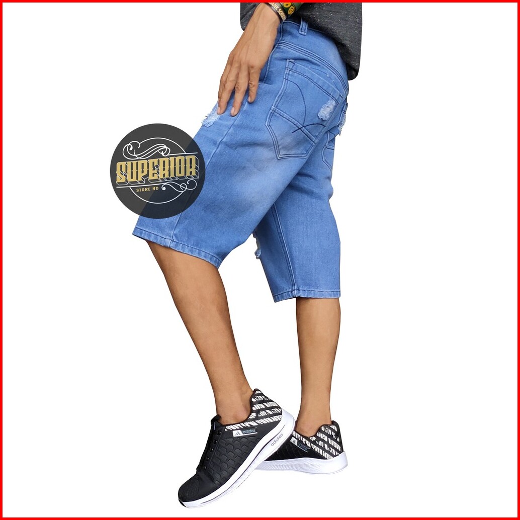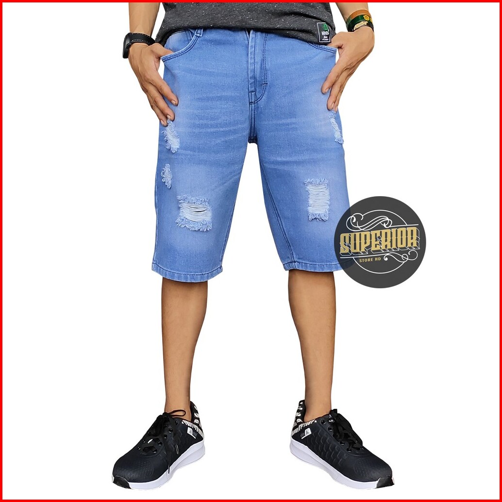 Celana Pendek Jeans Model Sobek Ripped Pria Biru Muda Size 27 - 38