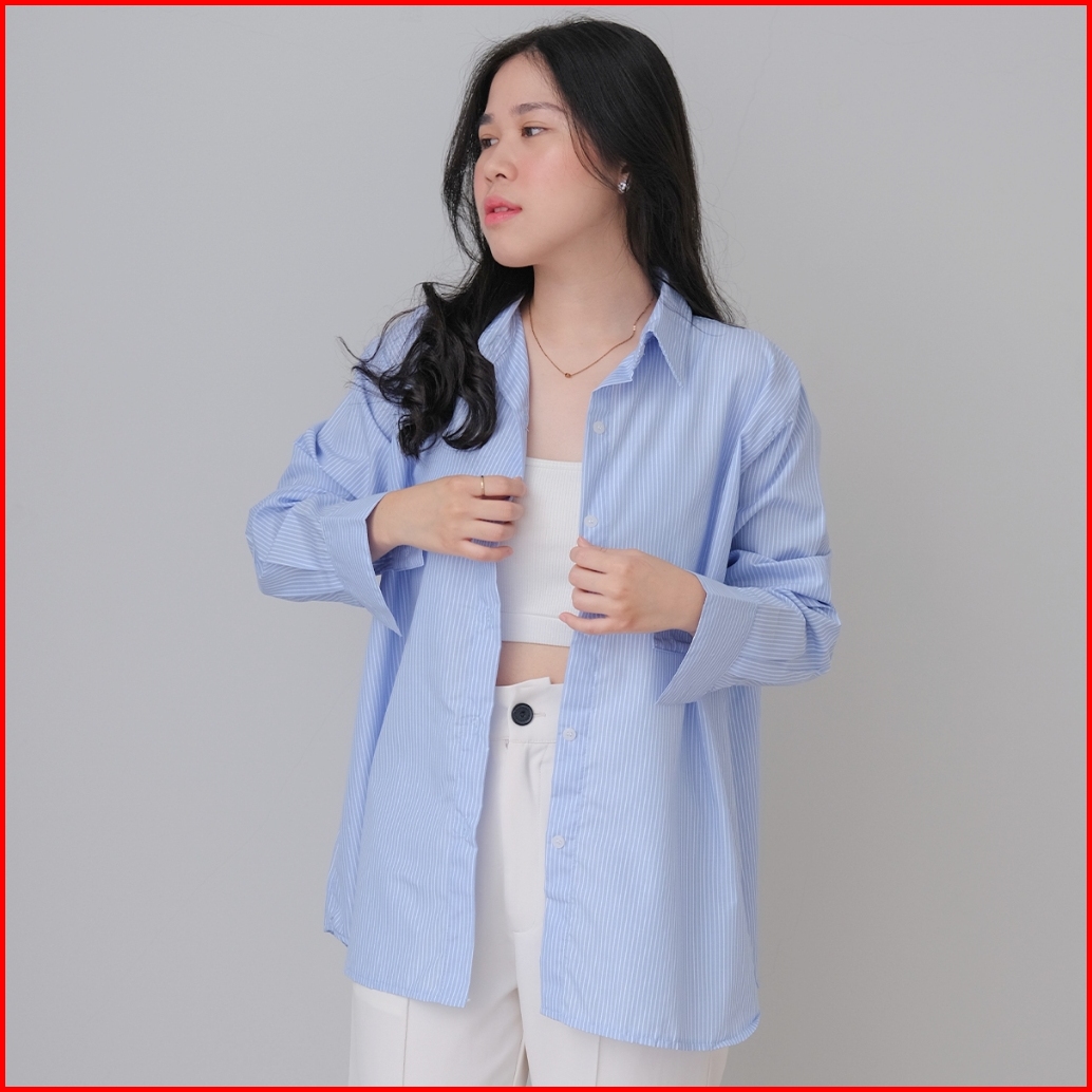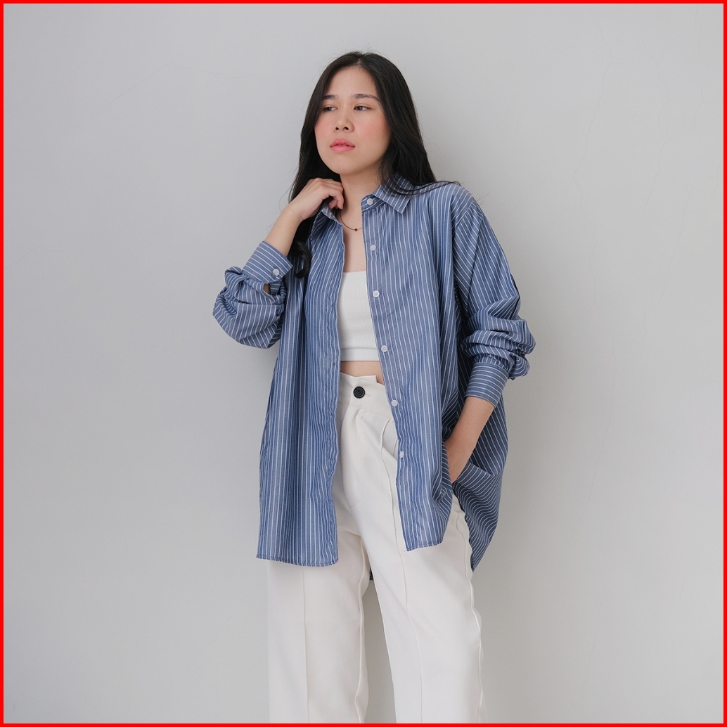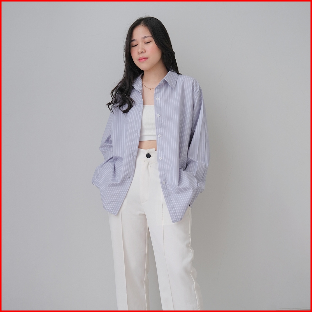 Flowing Stripes Editions Kemeja Basic Salur Wanita Lengan Panjang Kemeja Kerja Kantor Aesthetic