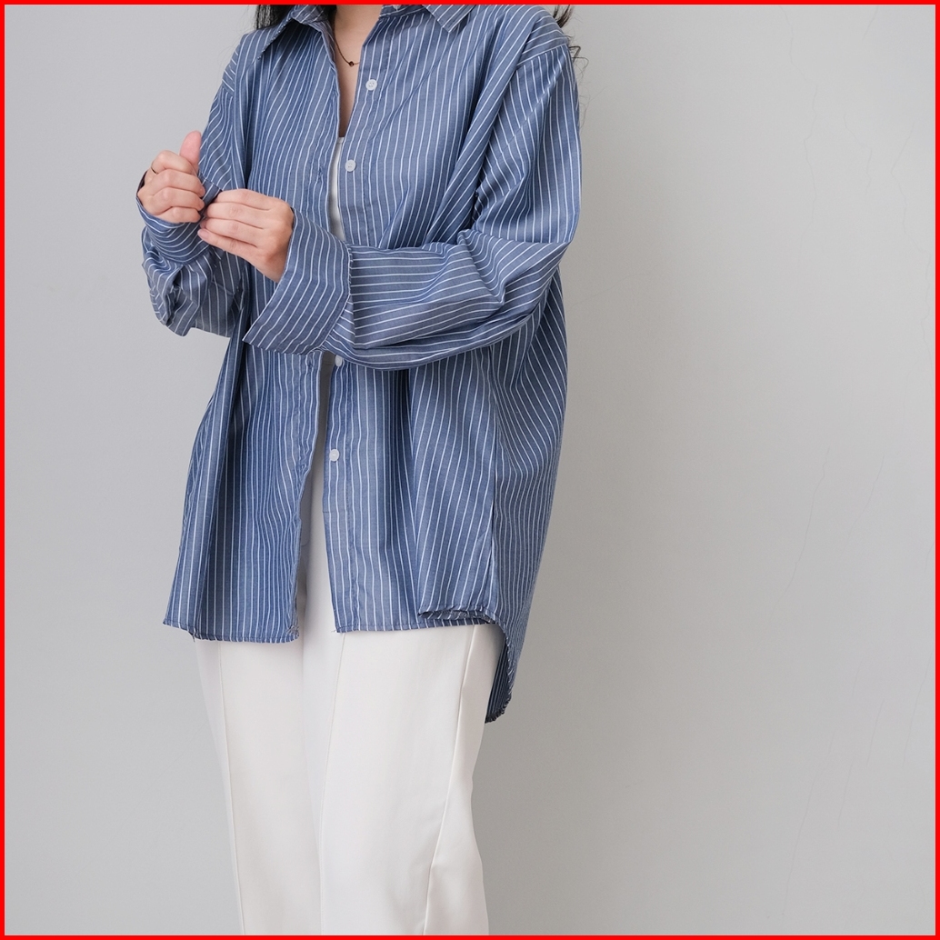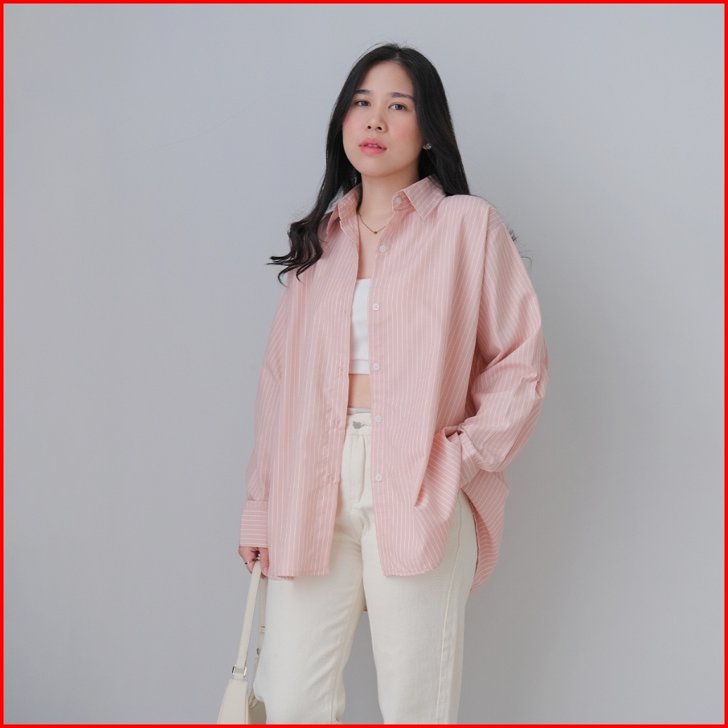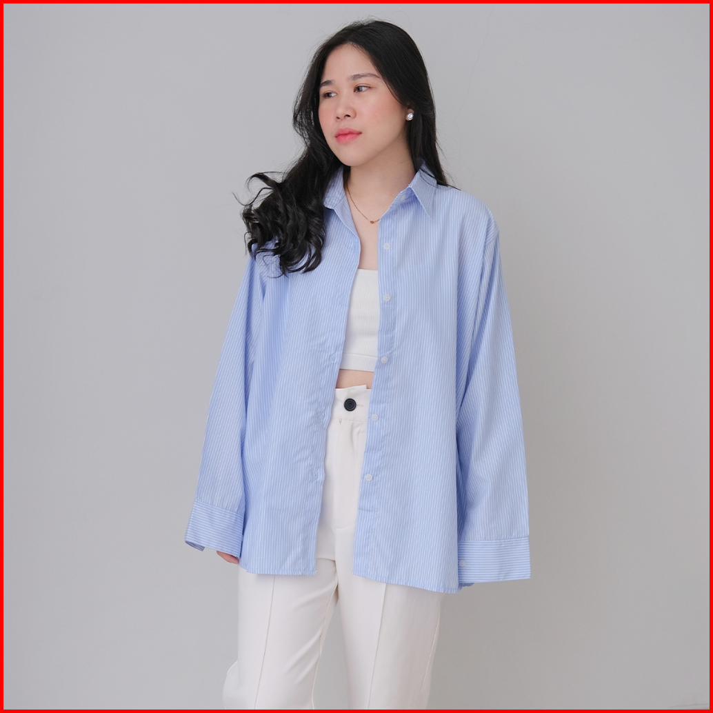 Flowing Stripes Editions Kemeja Basic Salur Wanita Lengan Panjang Kemeja Kerja Kantor Aesthetic
