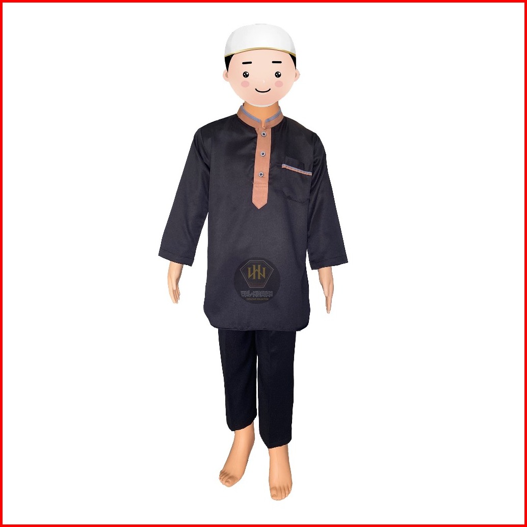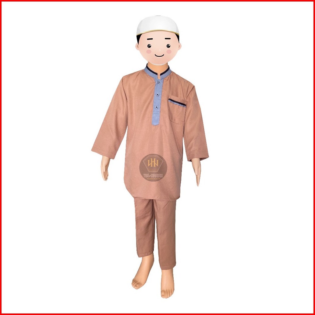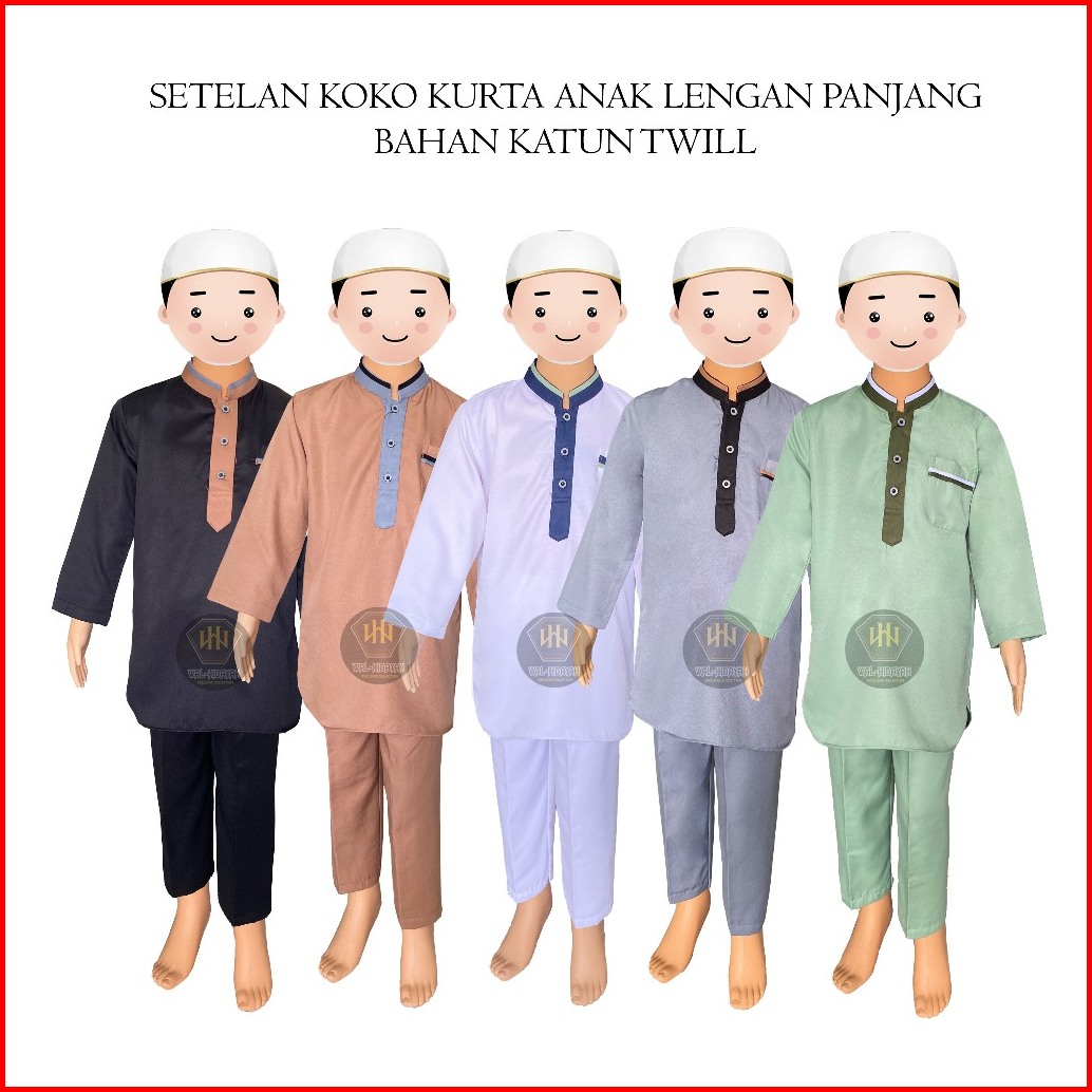 Koko Kurta Anak Laki-laki Lengan Panjang Bahan Katun Twill Setelan Baju Celana One Set Pakaian Muslim Anak Elegan