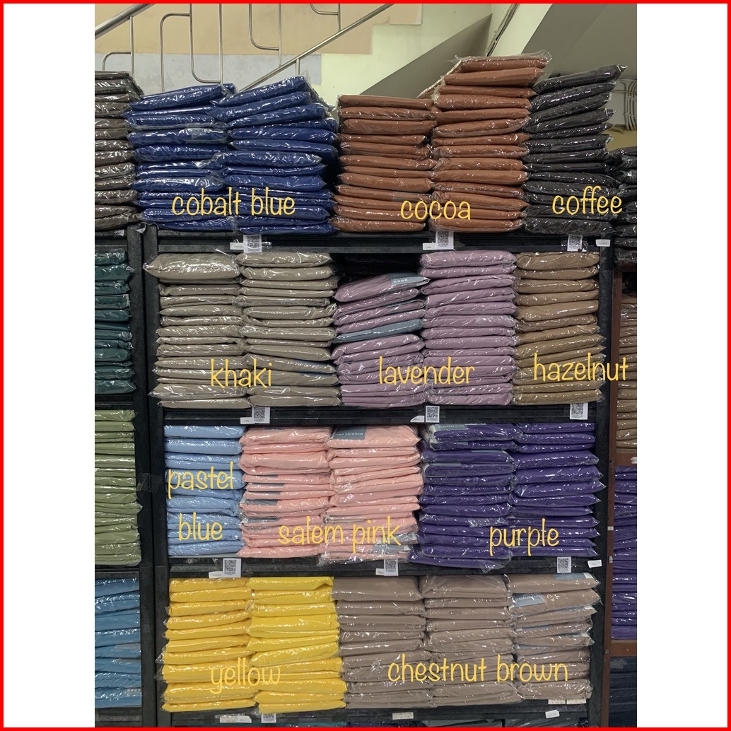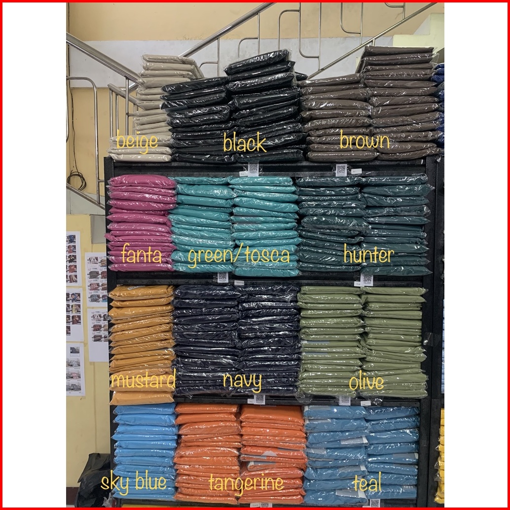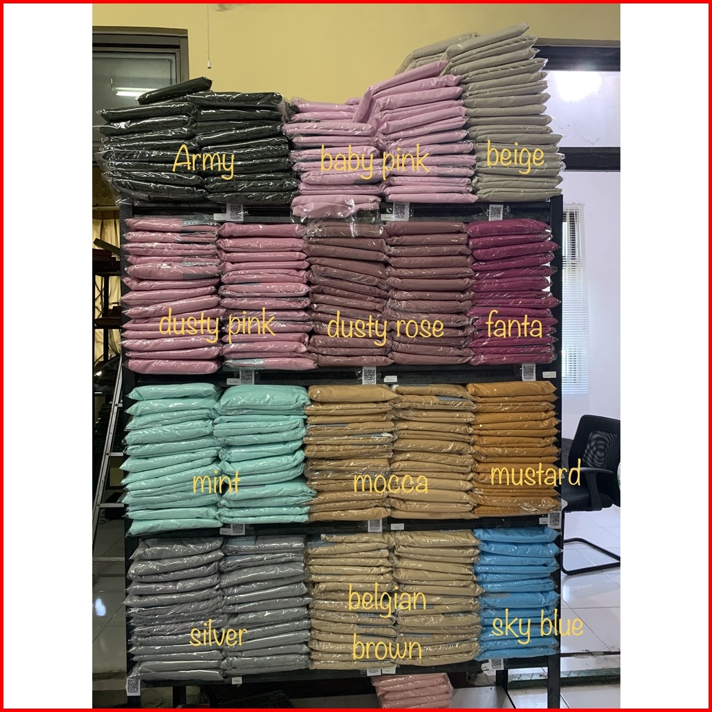 Baby Pink, Cocoa, Dark Grey, Coffee, Dusty Lime, Green / Tosca, Hunter, Khaki, Lilac, Hazelnut Brown, Mint, Mocca, Mustard, Olive, Pastel Blue, Putih, Royal Blue, Sage Green, Silver, Belgian Brown, Sky Blue, Tangerine, Minion Yellow☀️, Salem Pink, Chestnut Brown, Dusty Cream, Marigold, Mango Sunshine, Pacific Blue, Peach, Space Navy, Emerald Green, Coral Peach