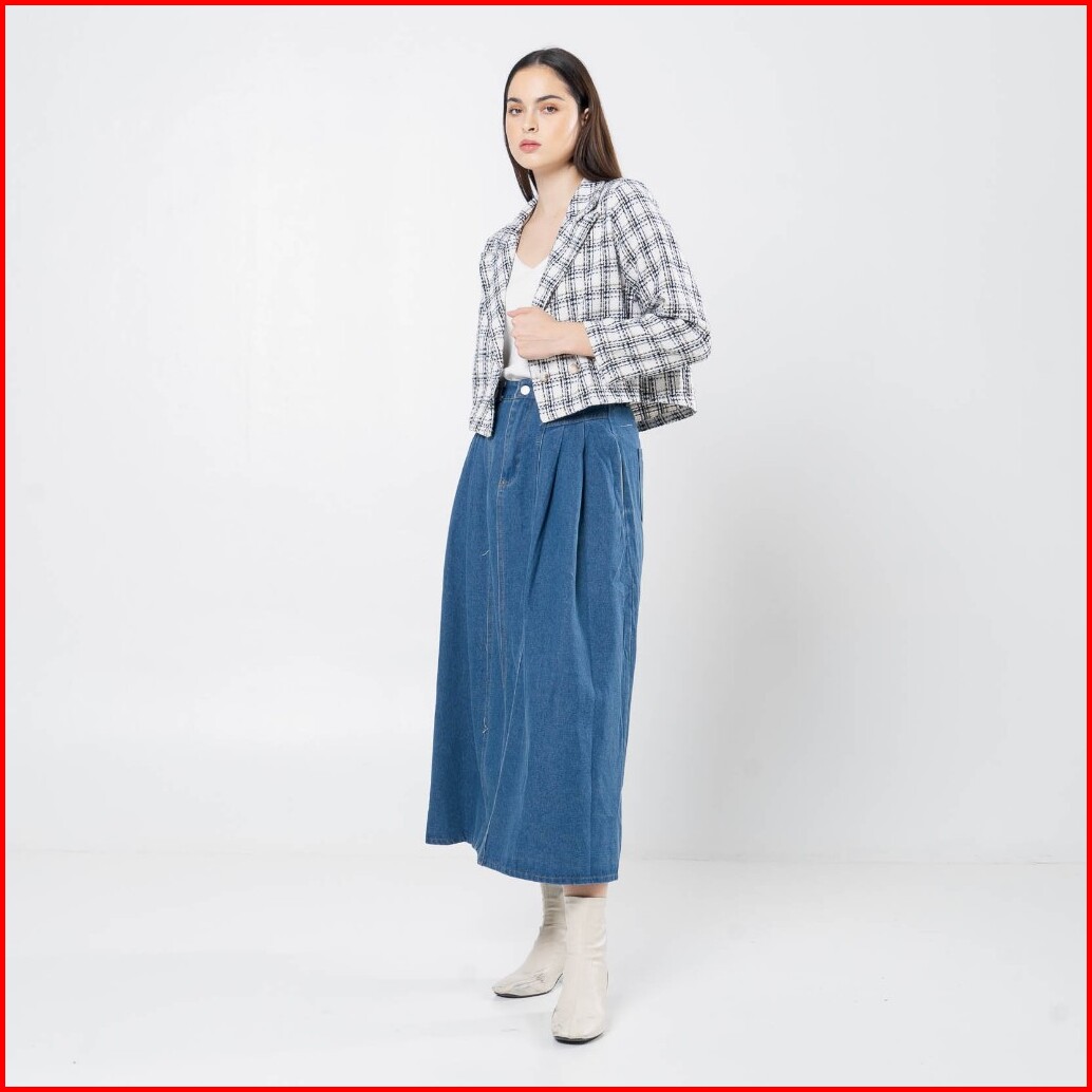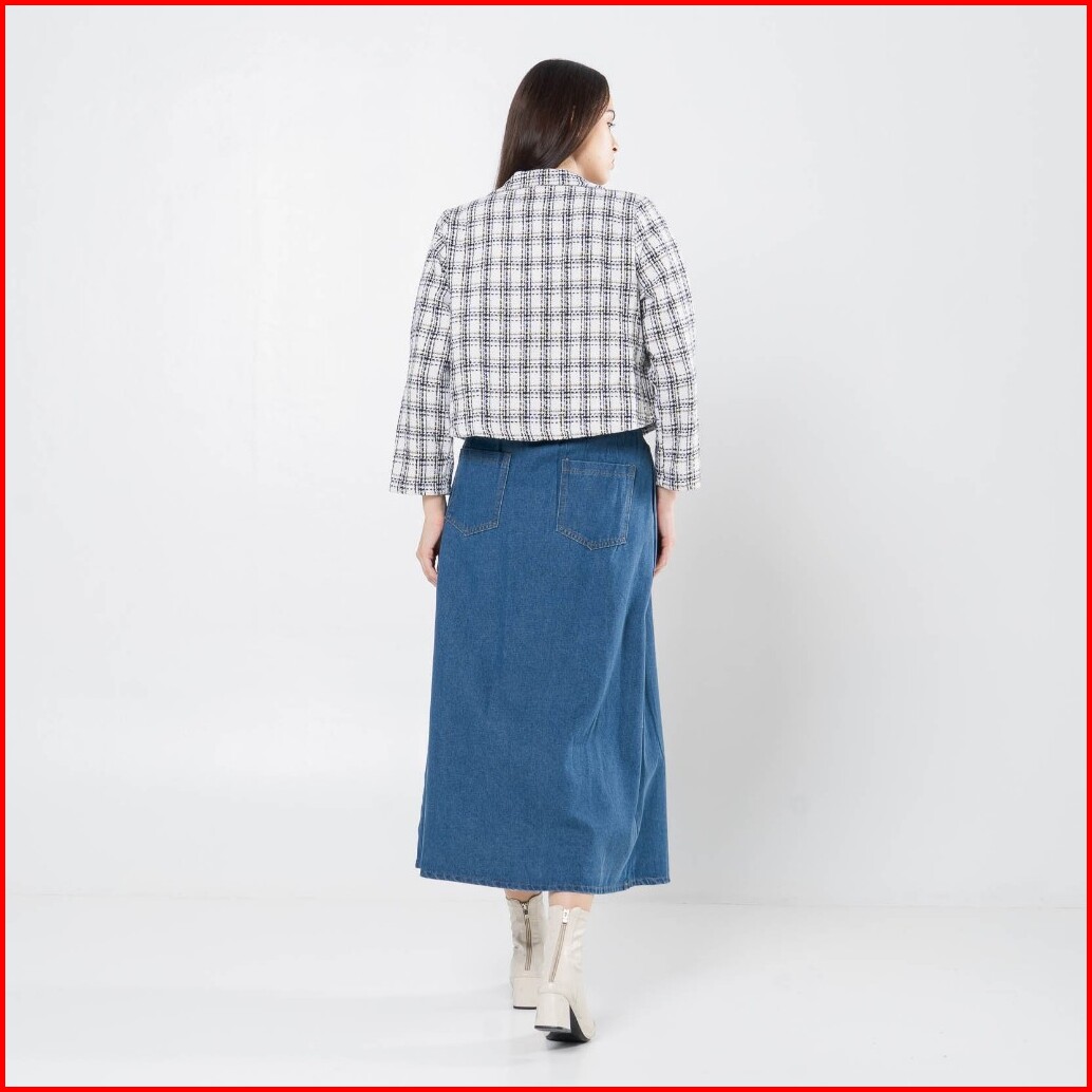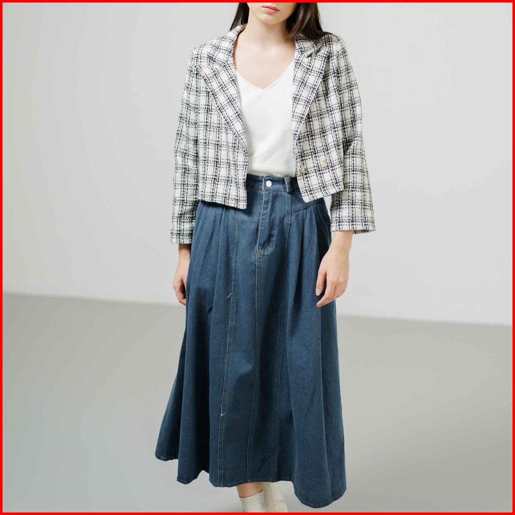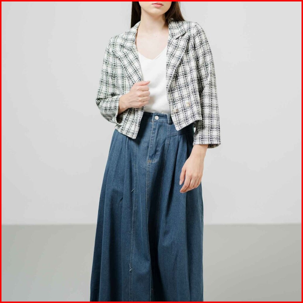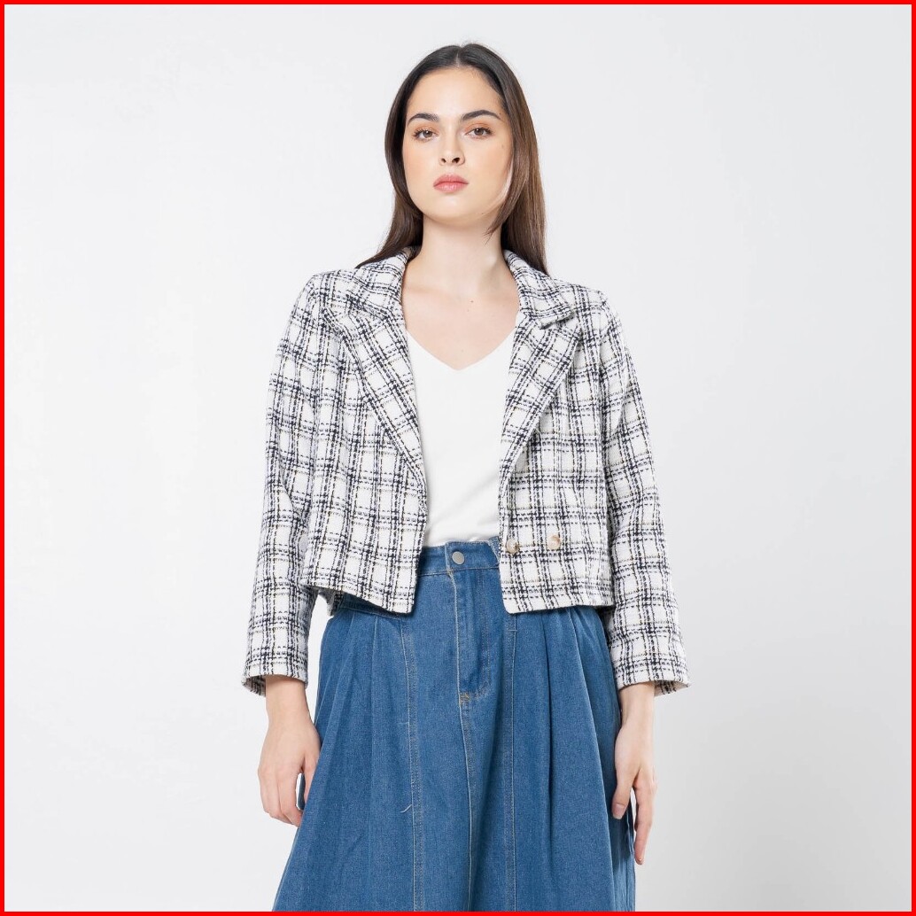 This Is April Blazer Crop Tweed Outer Wanita Kekinian Lengan Panjang Aleza Top - White Black