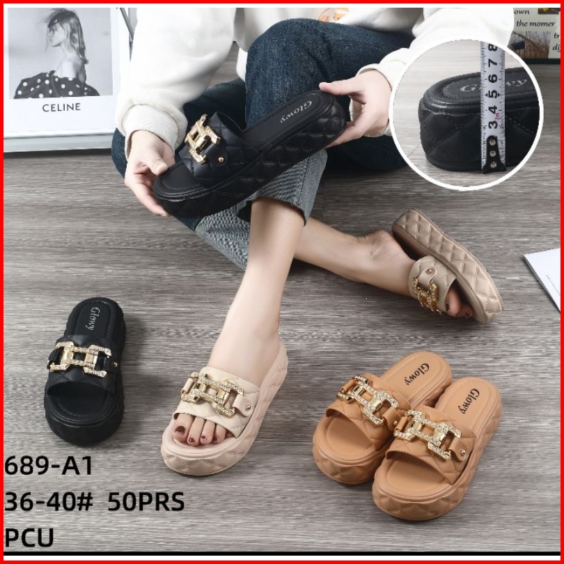 Sandal Wedges Slop Import Muka Kulit Sintetis Variasi Ring Kotak Kotak Sol.bermotif Alina 689