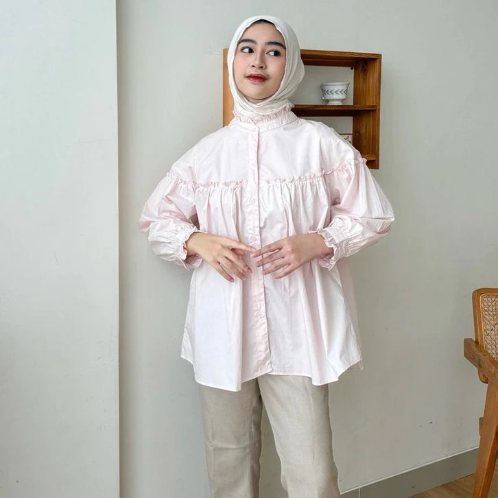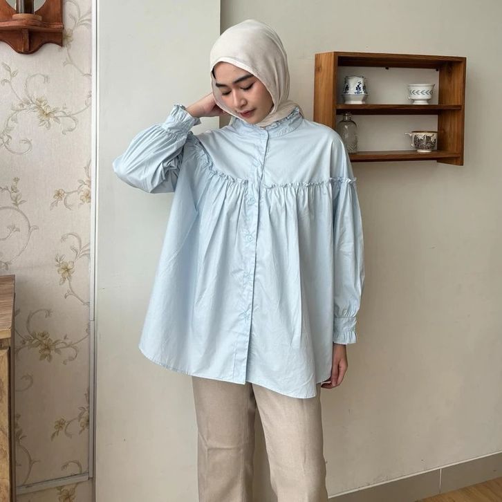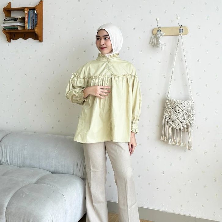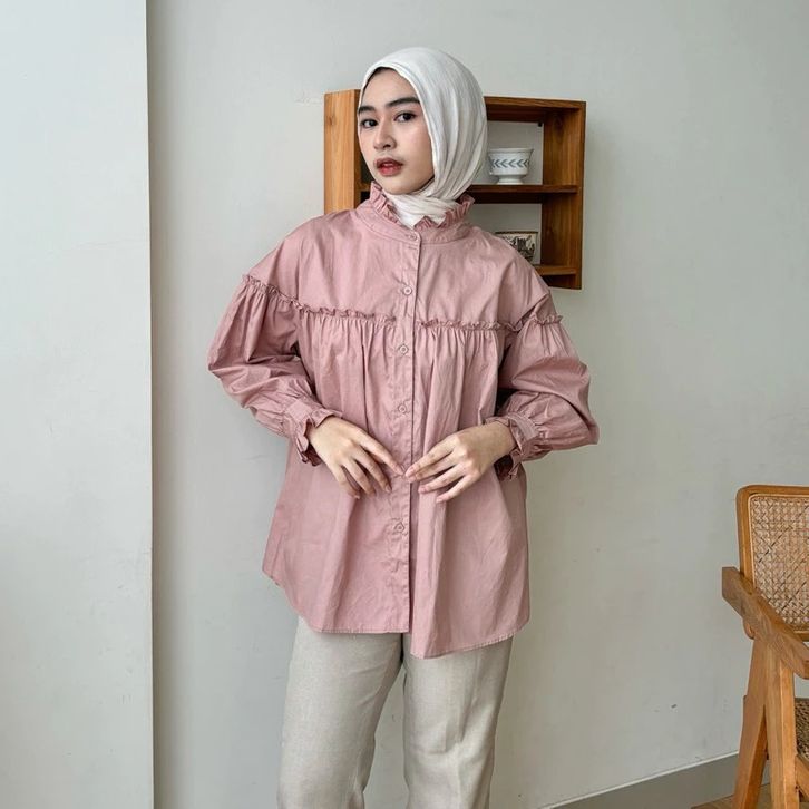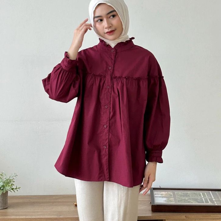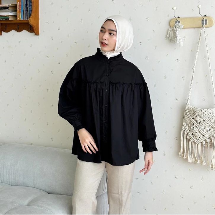 ATASAN WANITA KEKINIAN BAJU WANITA DEWASA KATUN BASIC CASUAL BLOUSE WANITA RUFFLE SABRINA KEMEJA KERJA CASUA