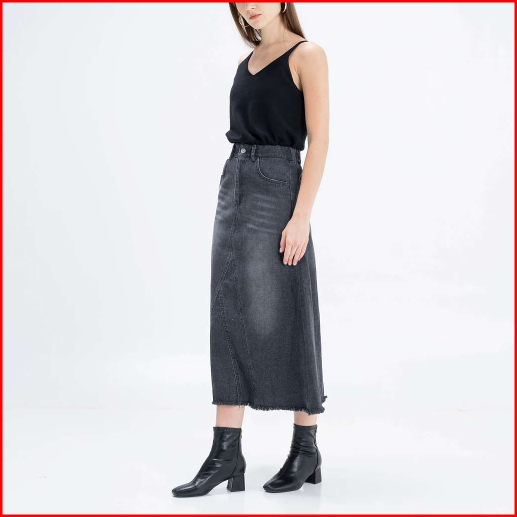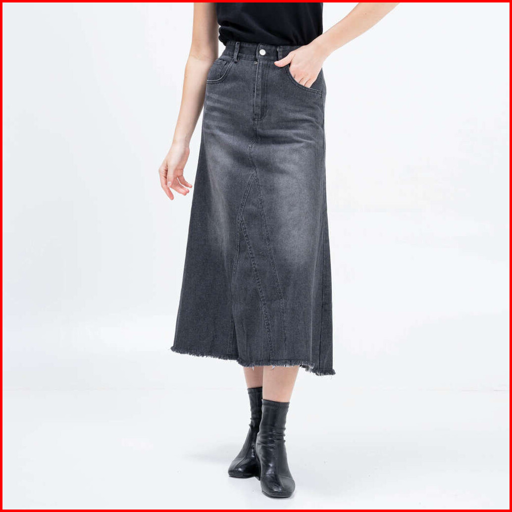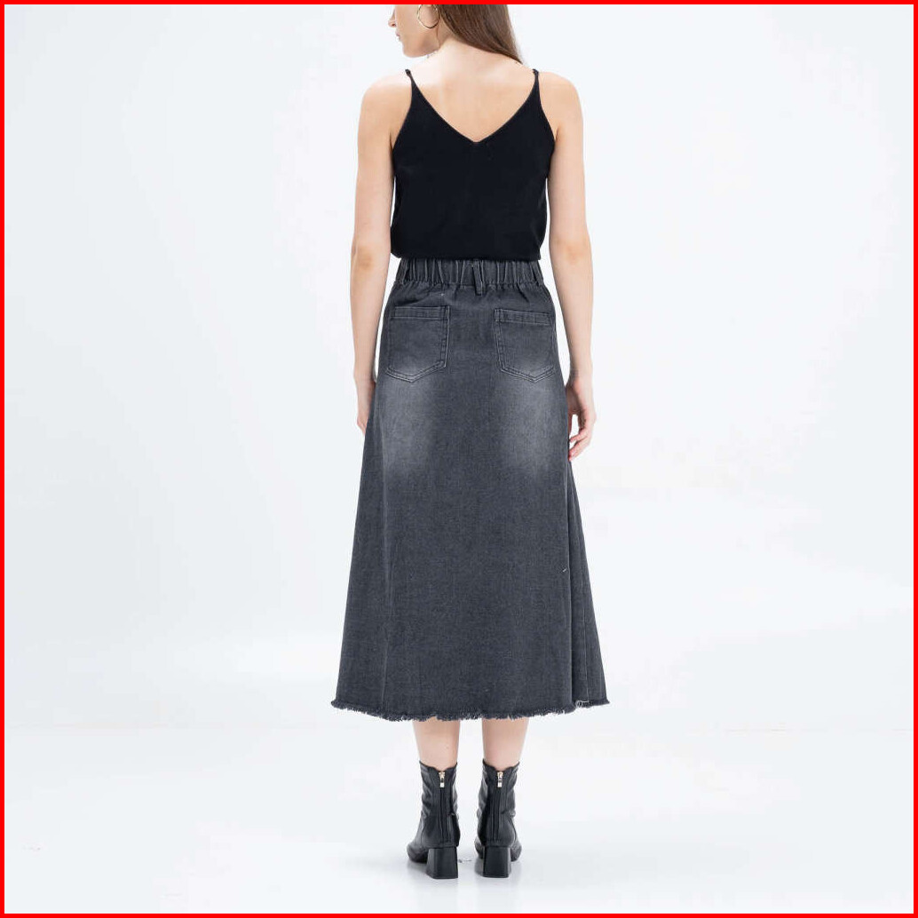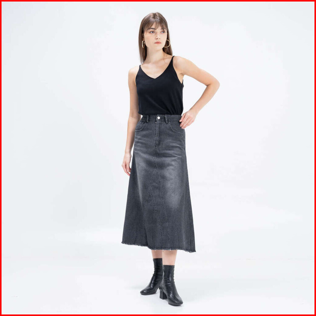This Is April Rok Midi Wanita Kekinian Jeans A-line Rylee Skirt Black Denim