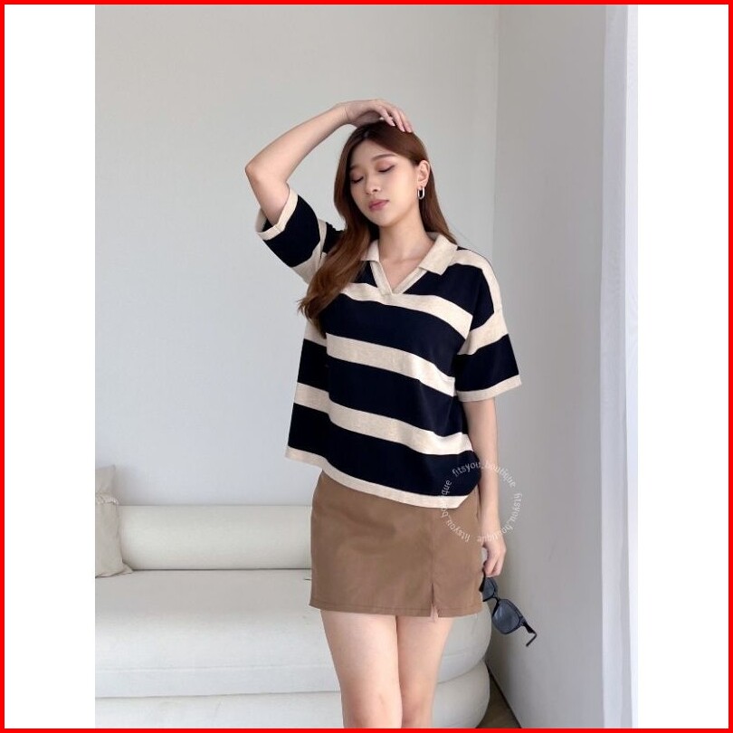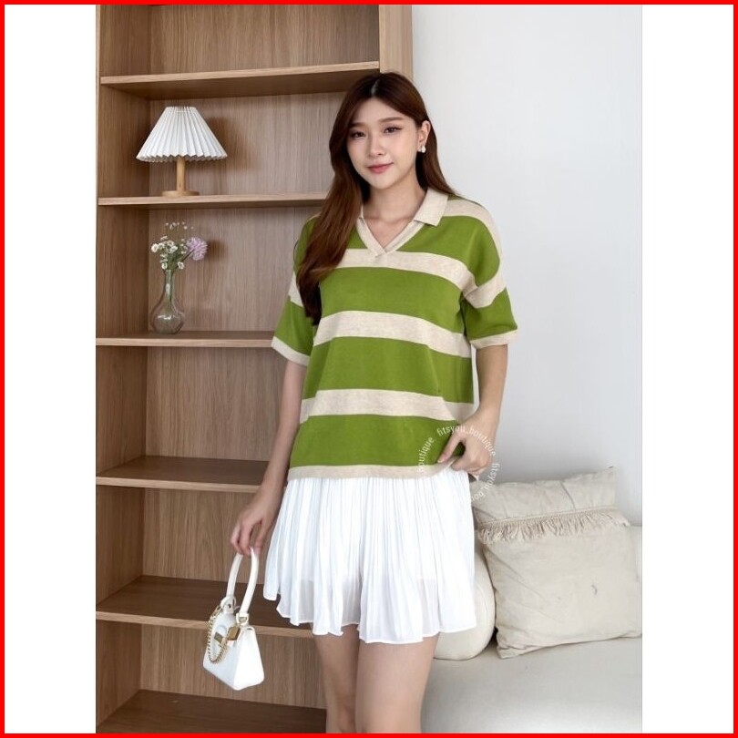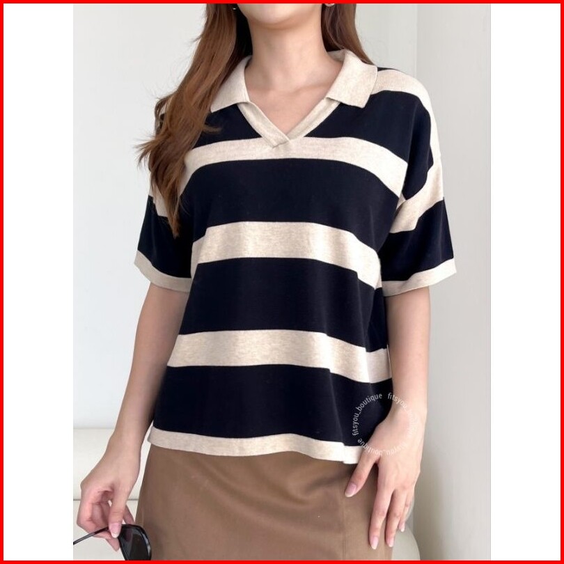 Jasmine Knit Tops Baju Atasan Rajut Wanita Katun Halus Adem Tangan Pendek Kerah Garis
