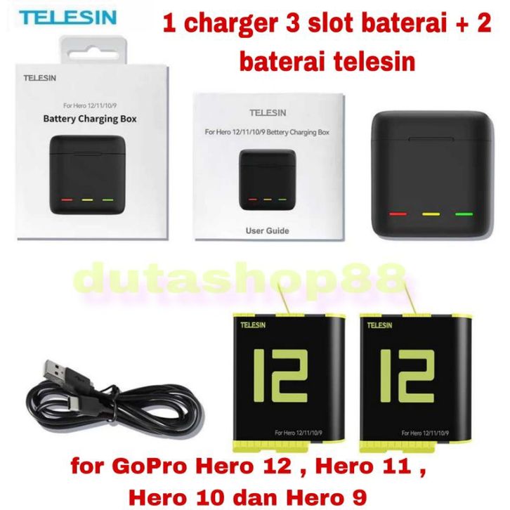 telesin triple charger box + baterai telesin for GoPro HERO 12 / HERO 11 / HERO 10 / HERO 9