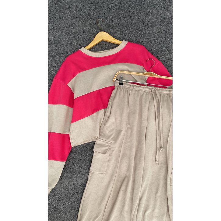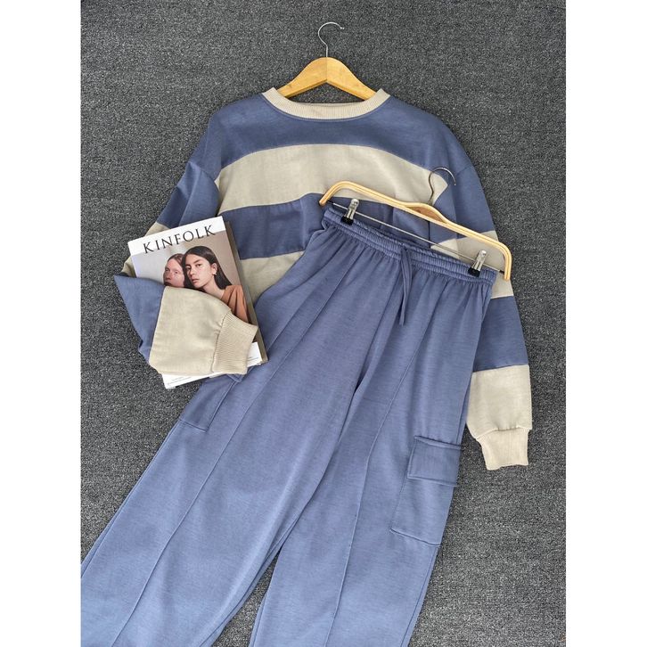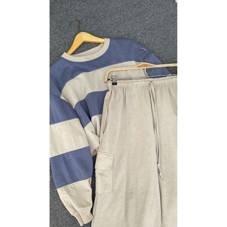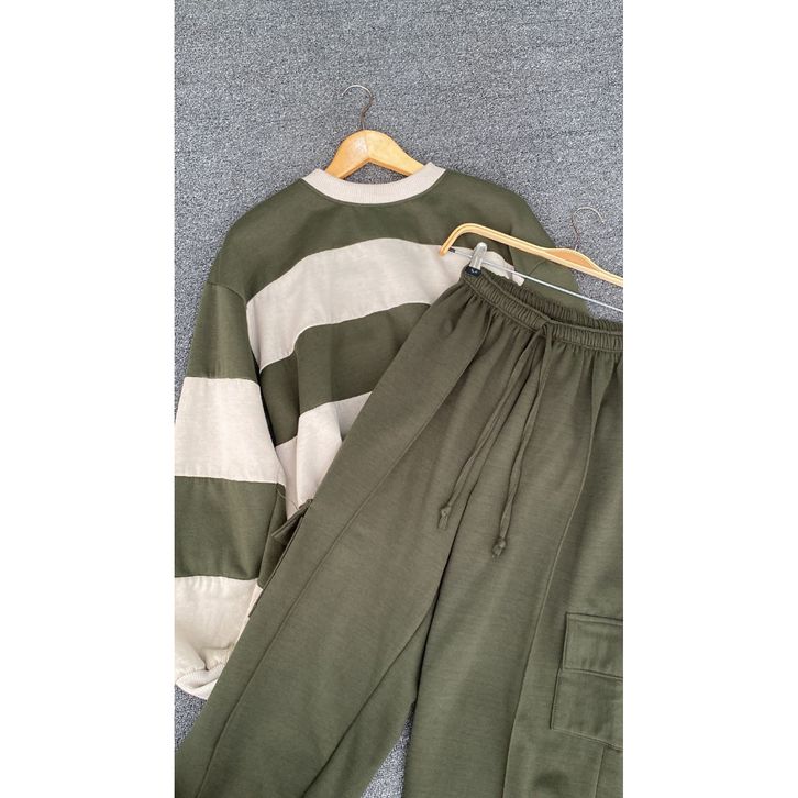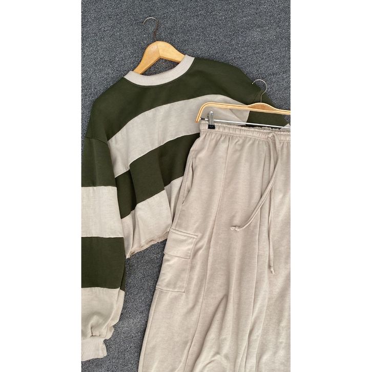 Setelan Wanita Terbaru Sweater Crop mix Jolly Pants - Pakaian Wanita Terbaru Crewneck Combi mix Cargo Pants
