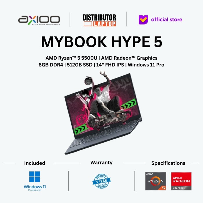 AXIOO MYBOOK HYPE 5 AMD RYZEN 5 5500U RAM 8GB 512GB SSD 14" FHD WIN11 - BLUE 8/256GB, DOS