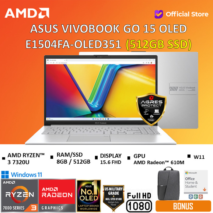 ASUS VIVOBOOK GO 15 OLED E1504FA RYZEN 3 7320U 8GB 610M 15"FHD W11 OHS - GREENGREY/512GB, TANPA ANTIGORES