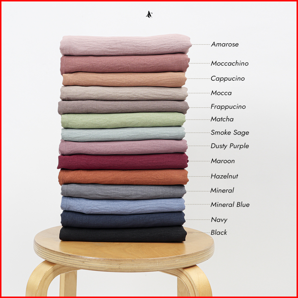 Amarose, Army, Black, Broken White, Cappucino, Dusty Purple, Frappucino, Garden View, Hazelnut, Heavenly Blue, Latte, Maroon, Matcha, Mineral, Mineral Blue, Mocca, Moccachino, Navy, Smoke Sage