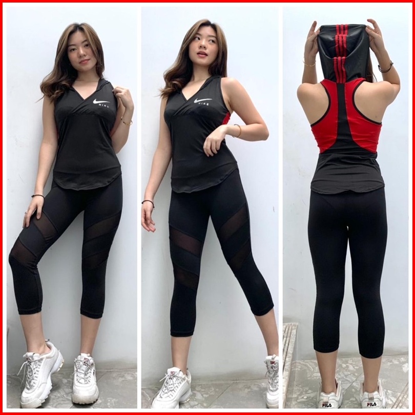 Setelan Senam Aerobik Zumba Yoga Gym Fitness Model Tanktop Hoodie Nk-legging Plat Samping 3 4