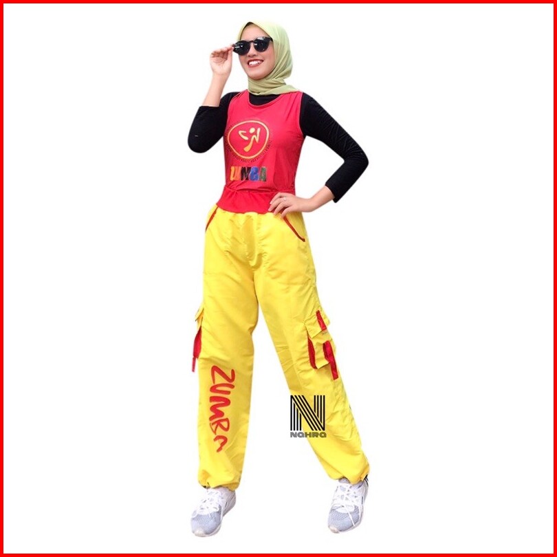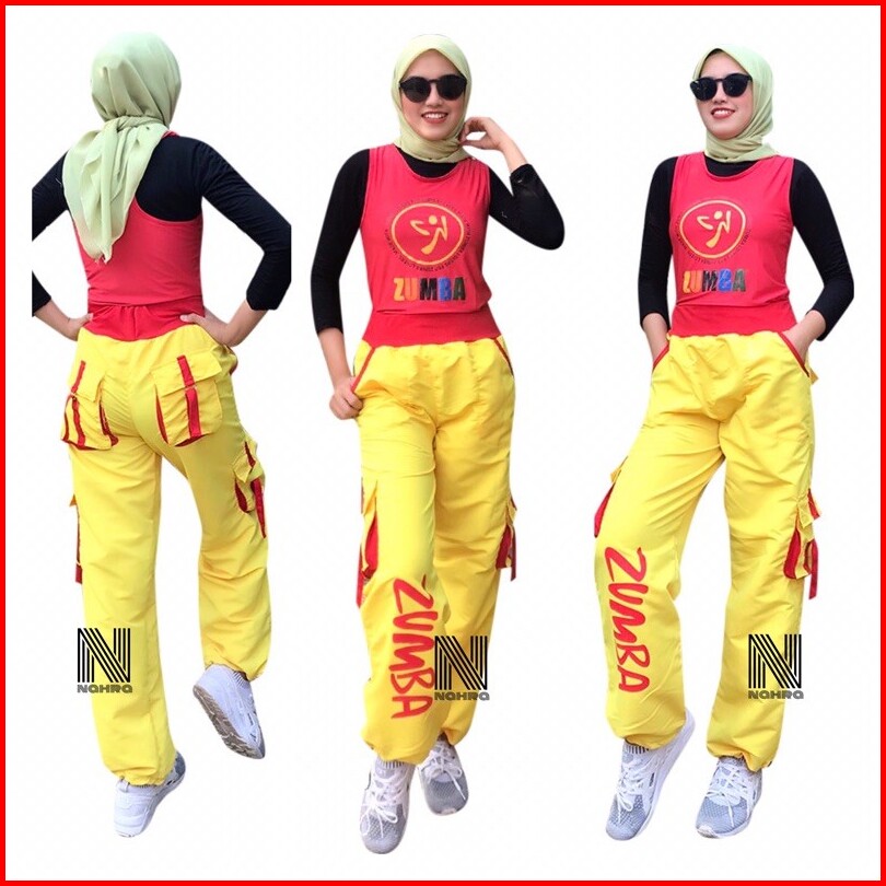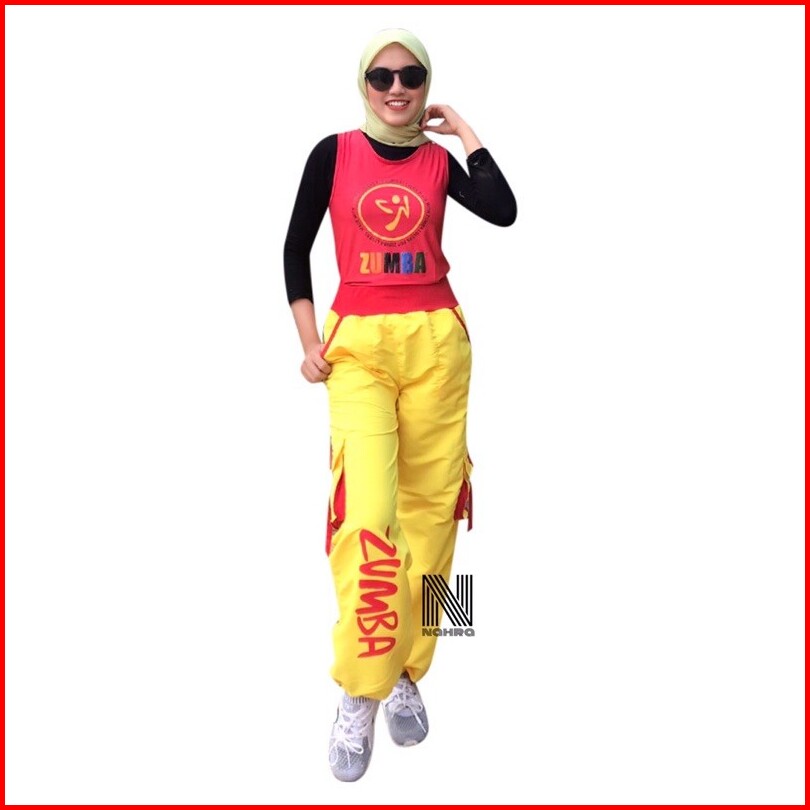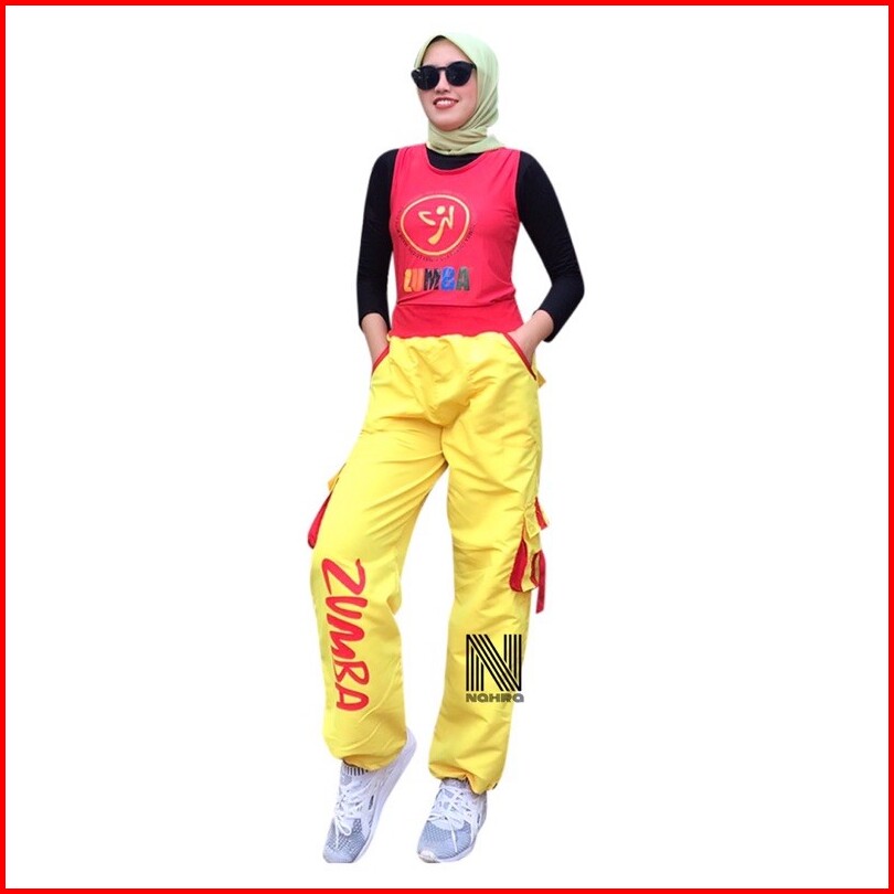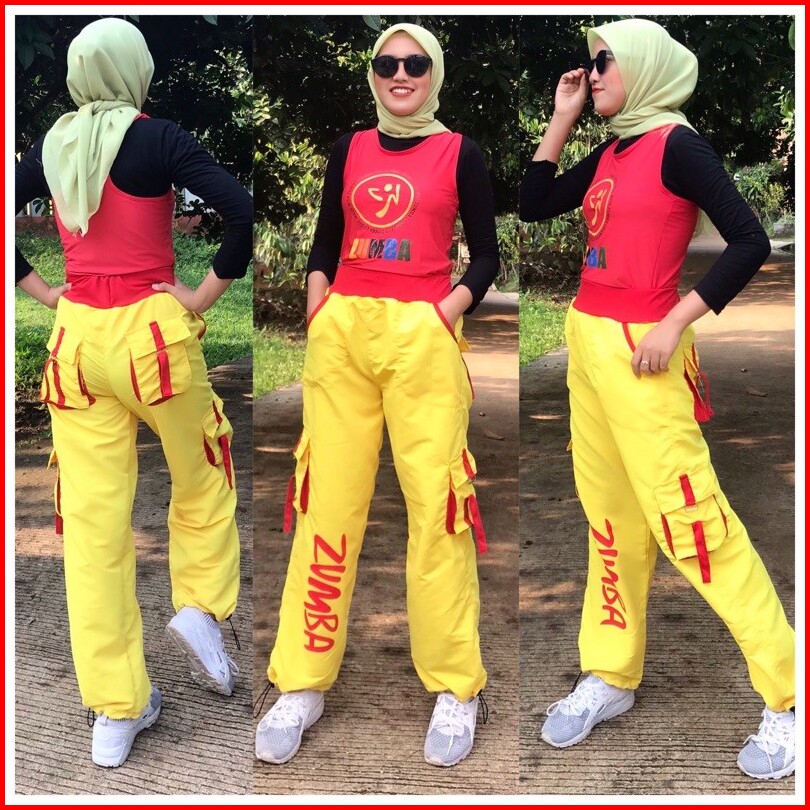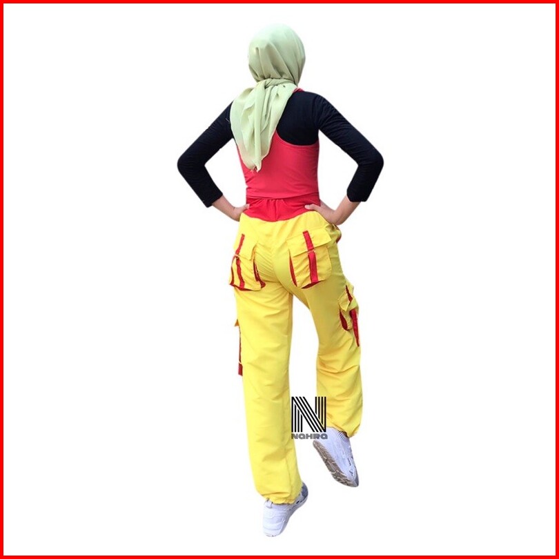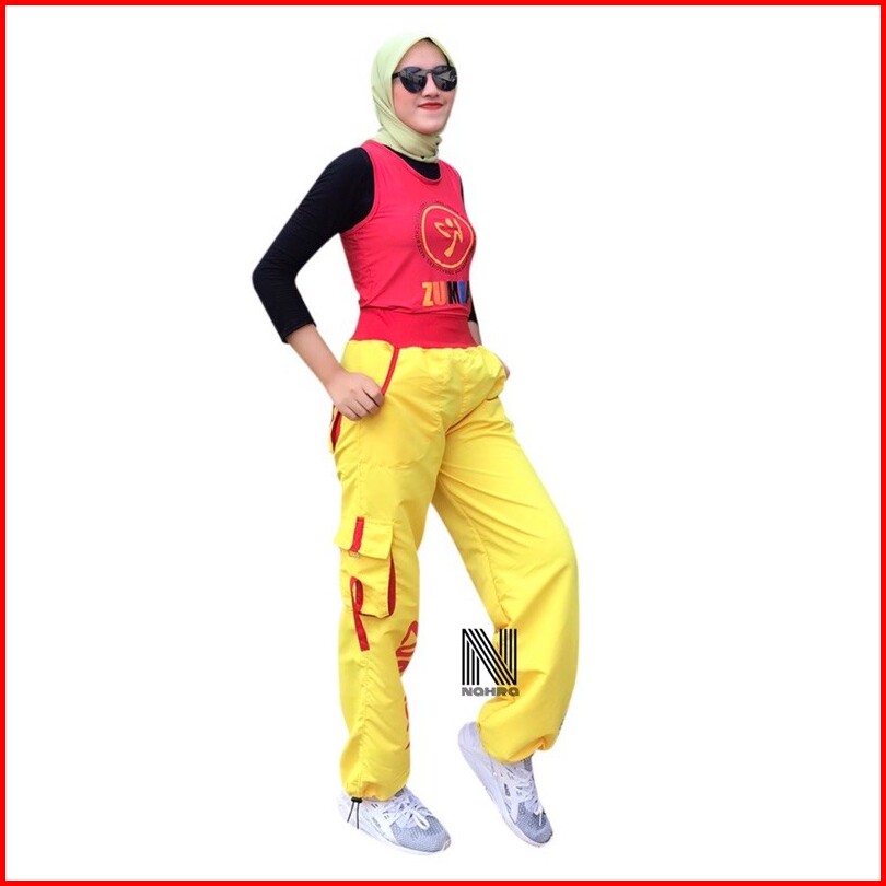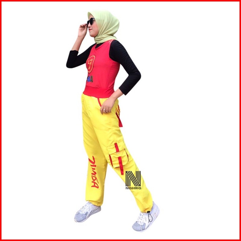 Cargo Training Parasut Zumba Kuning Sablon Merah Celana Senam Cargo Gym Fitness Aerobik Cycling