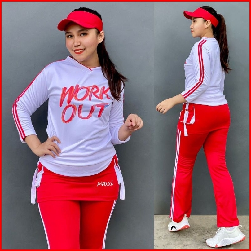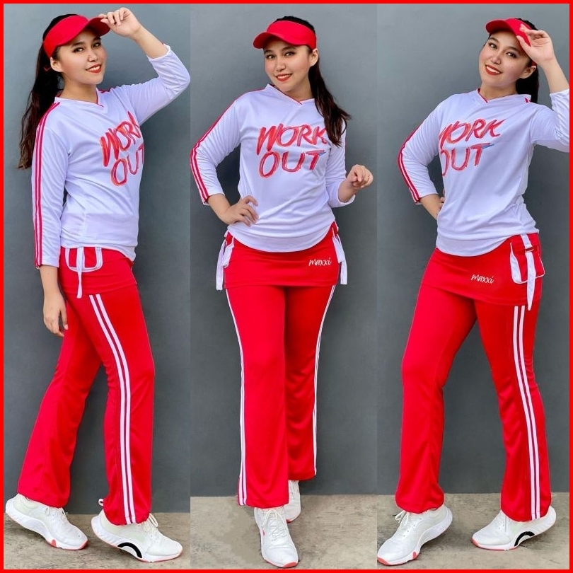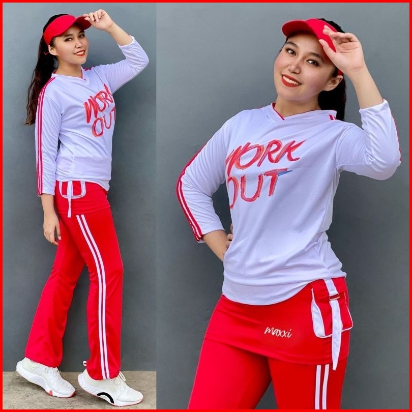 Baru Stelan Baju Senam Workout Rok Series Indoor Outdoor Serie Putih Merah