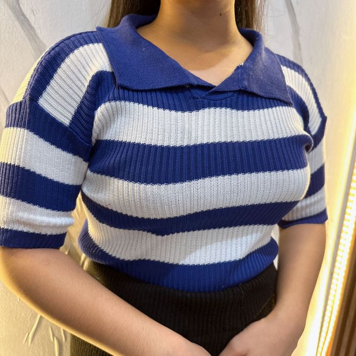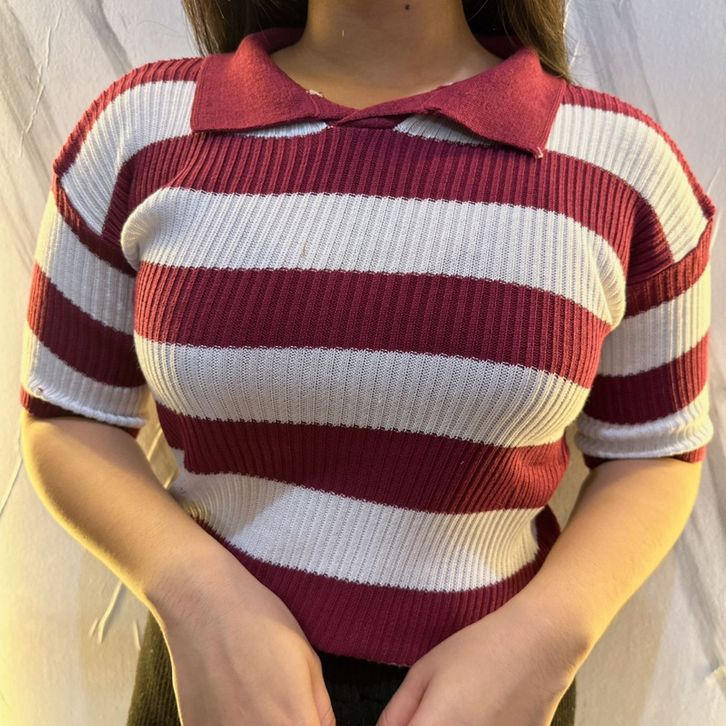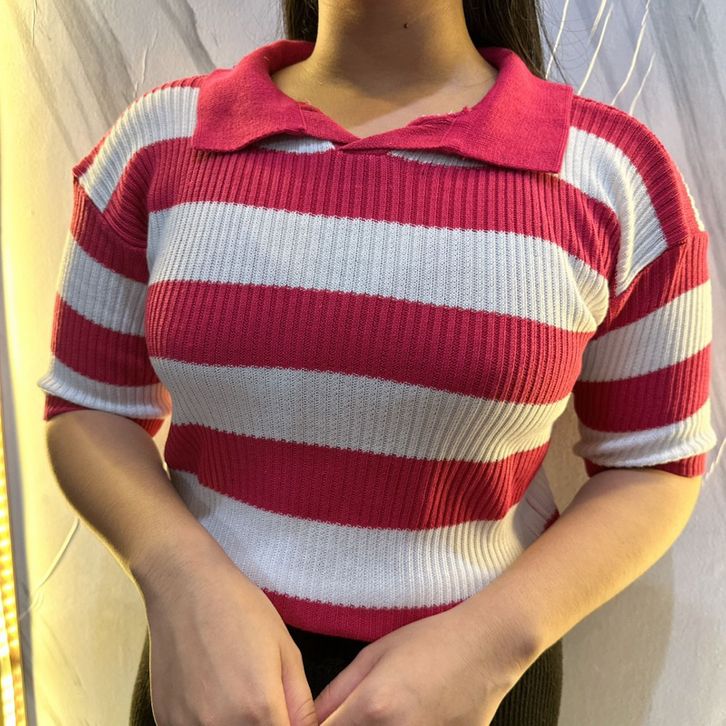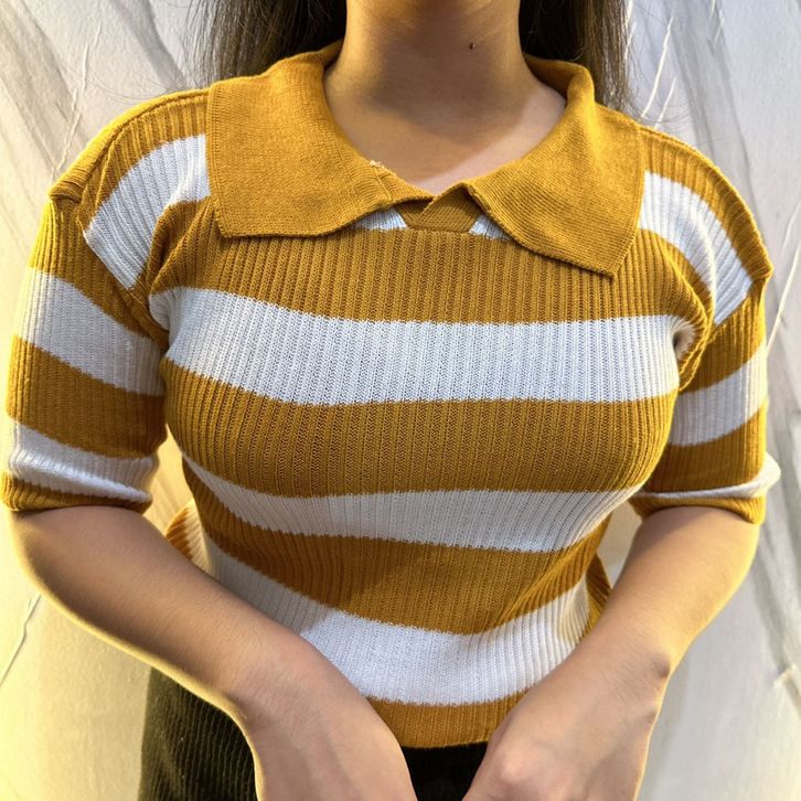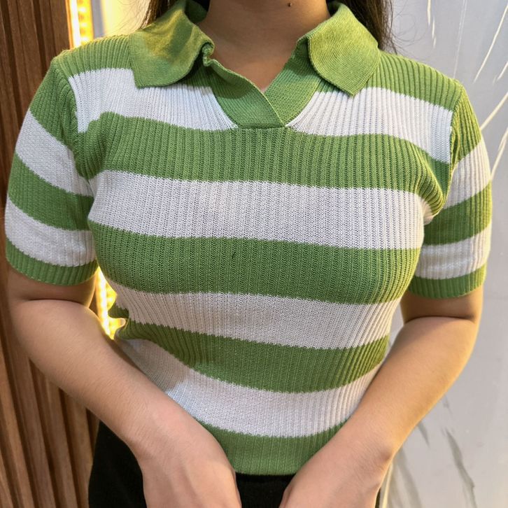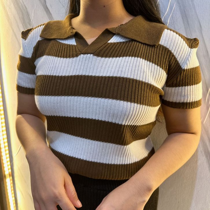 Atasan Cewek Kerah Polo Rajut Stripe Vneck Crop Top Blouse Stripe Polo Shirt Atasan Wanita Korean Fashion Style