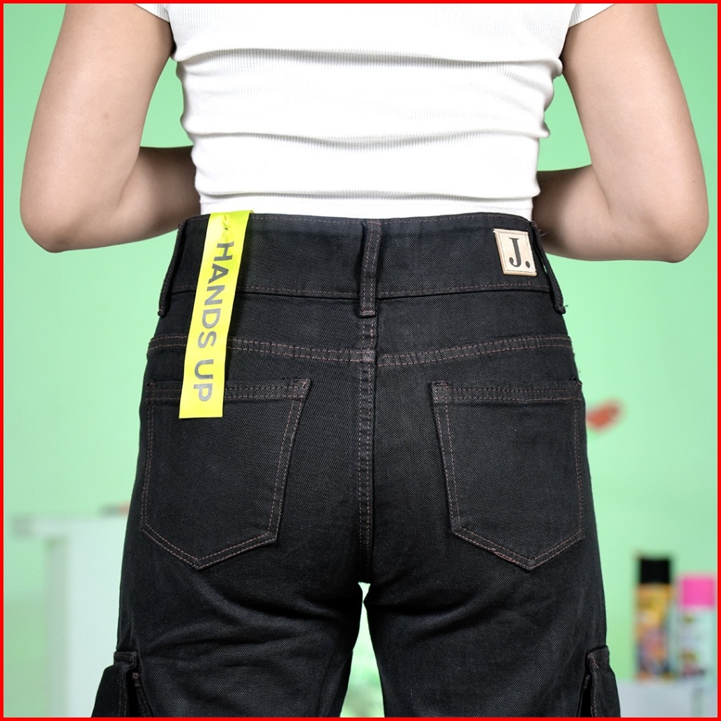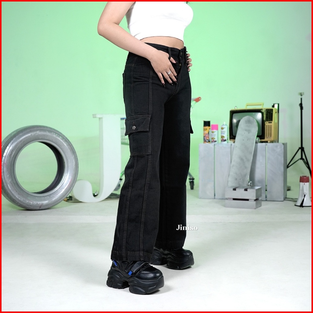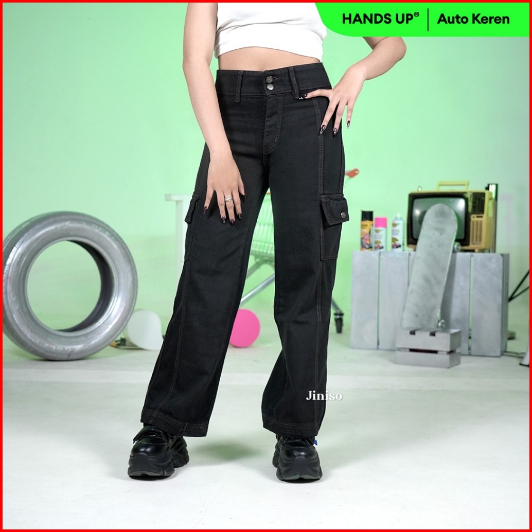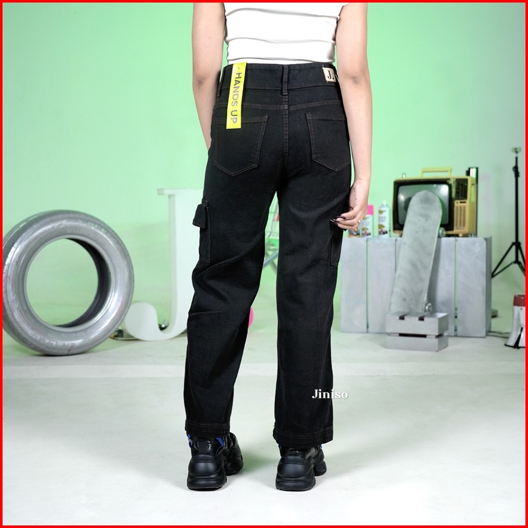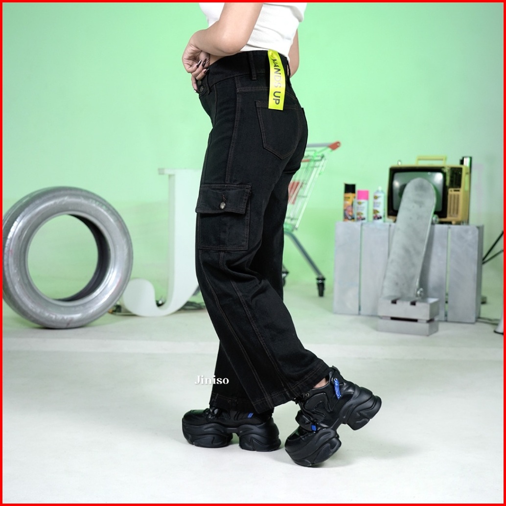 Jiniso - Highwaist Cargo Loose Jeans Wanita Black Choco 402 Hands Up