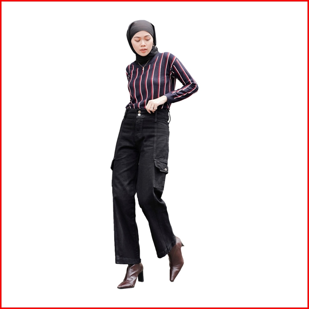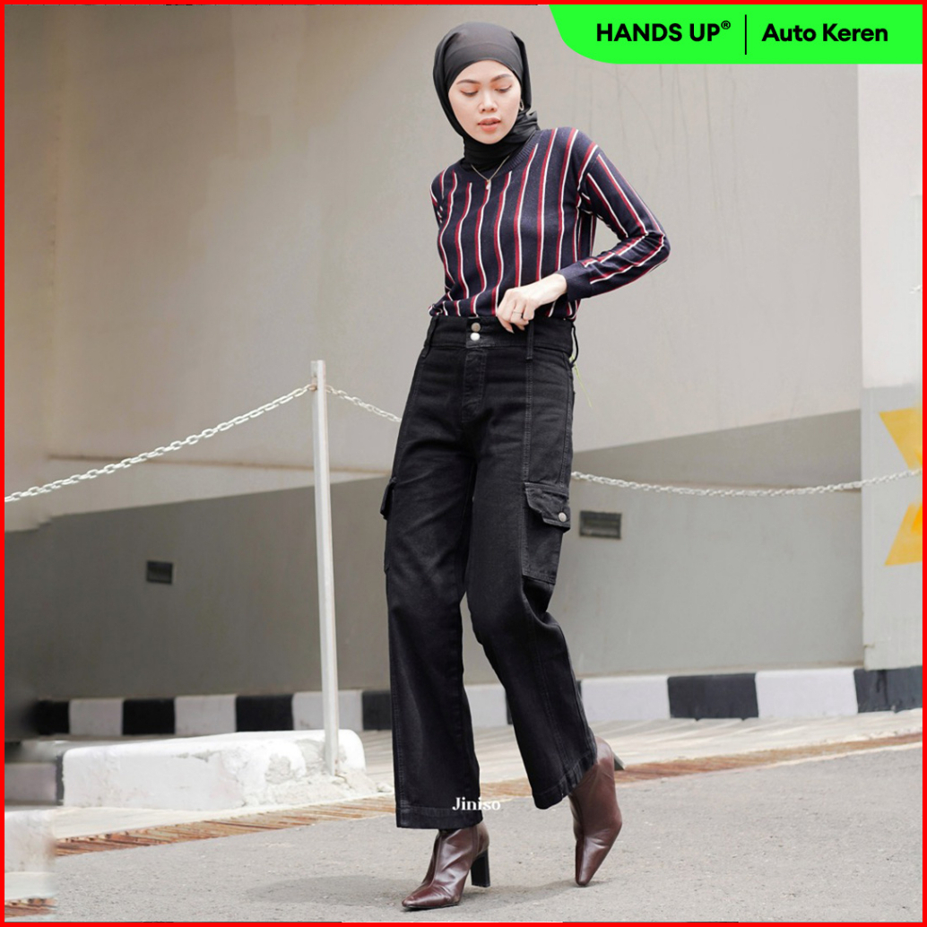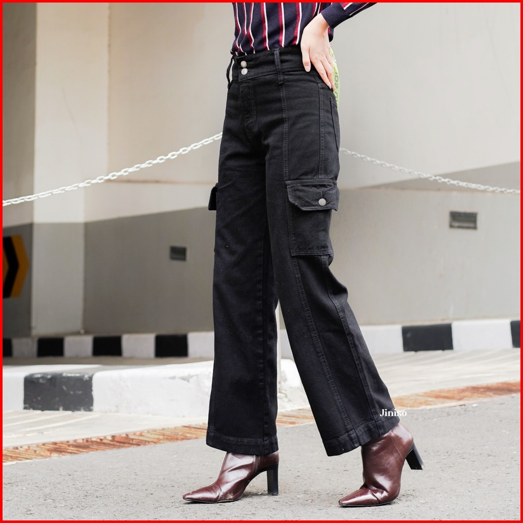 Jiniso - Highwaist Cargo Loose Jeans Black 406 Hands Up