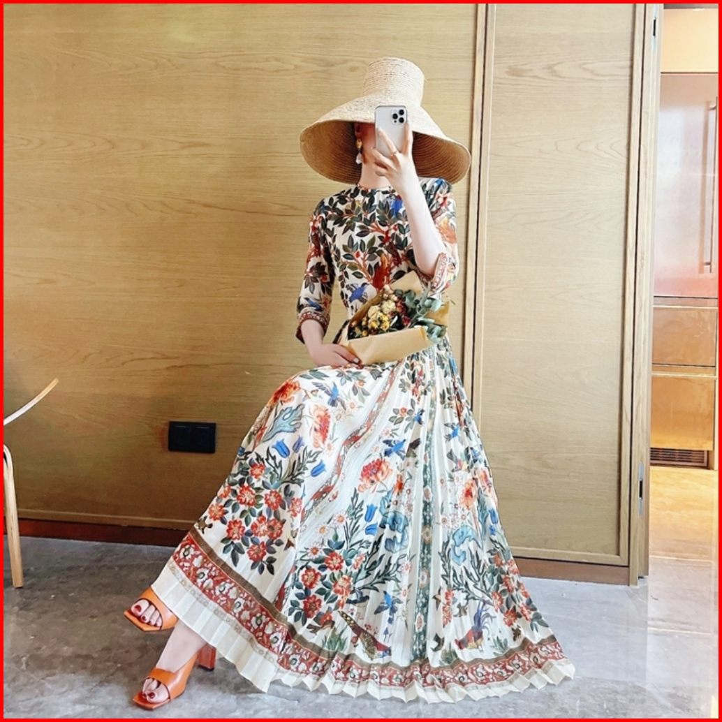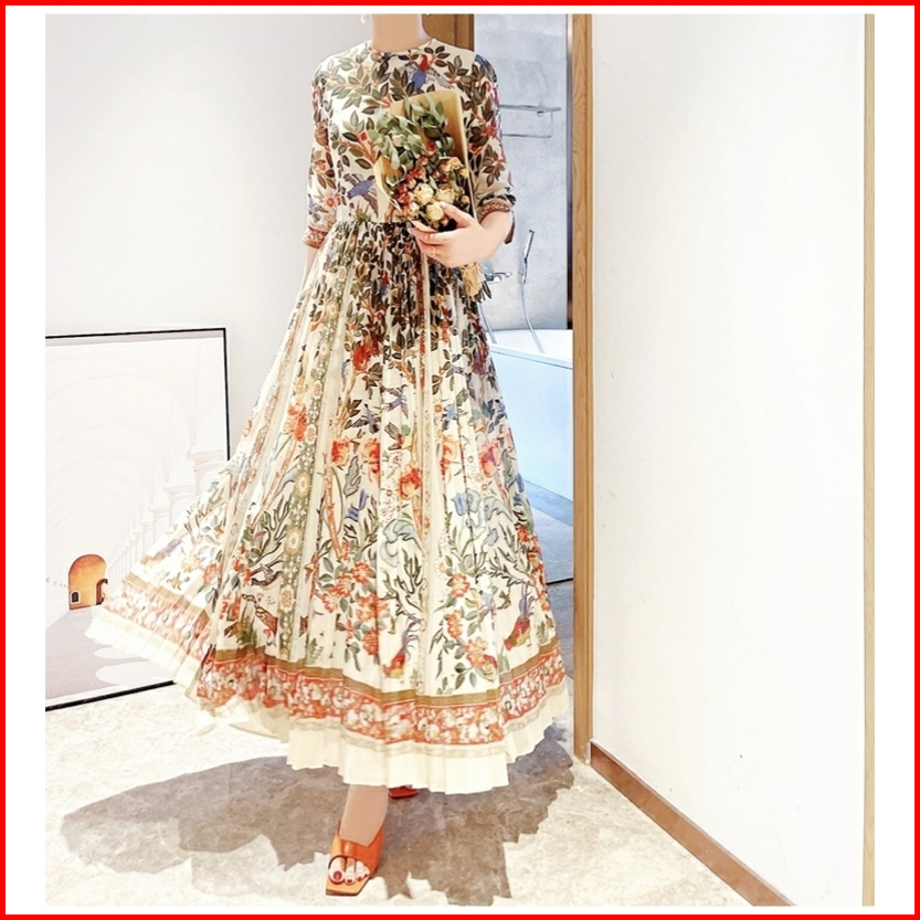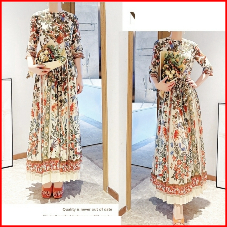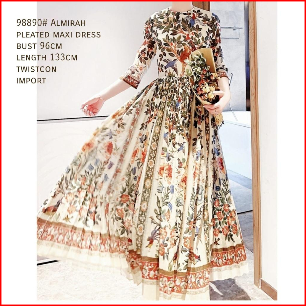 Tm 98890 Dress Maxi Almirah Pleated Bunga-bunga Import