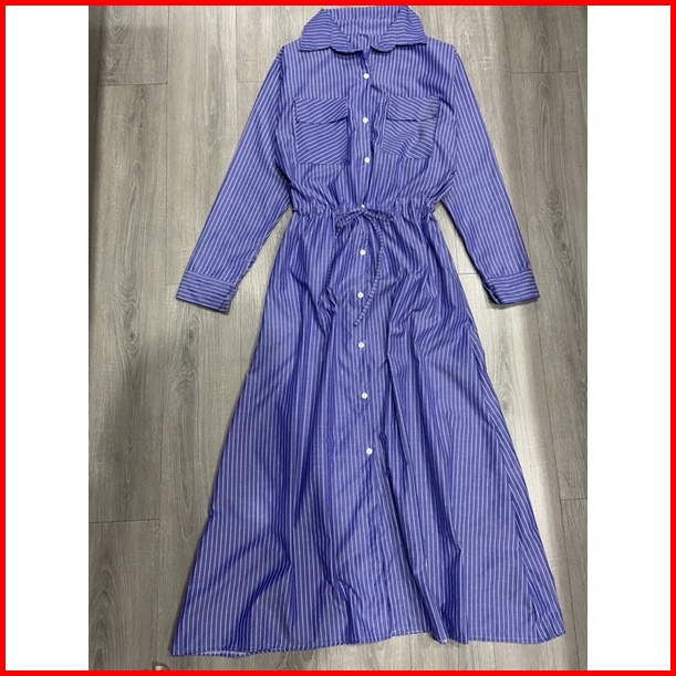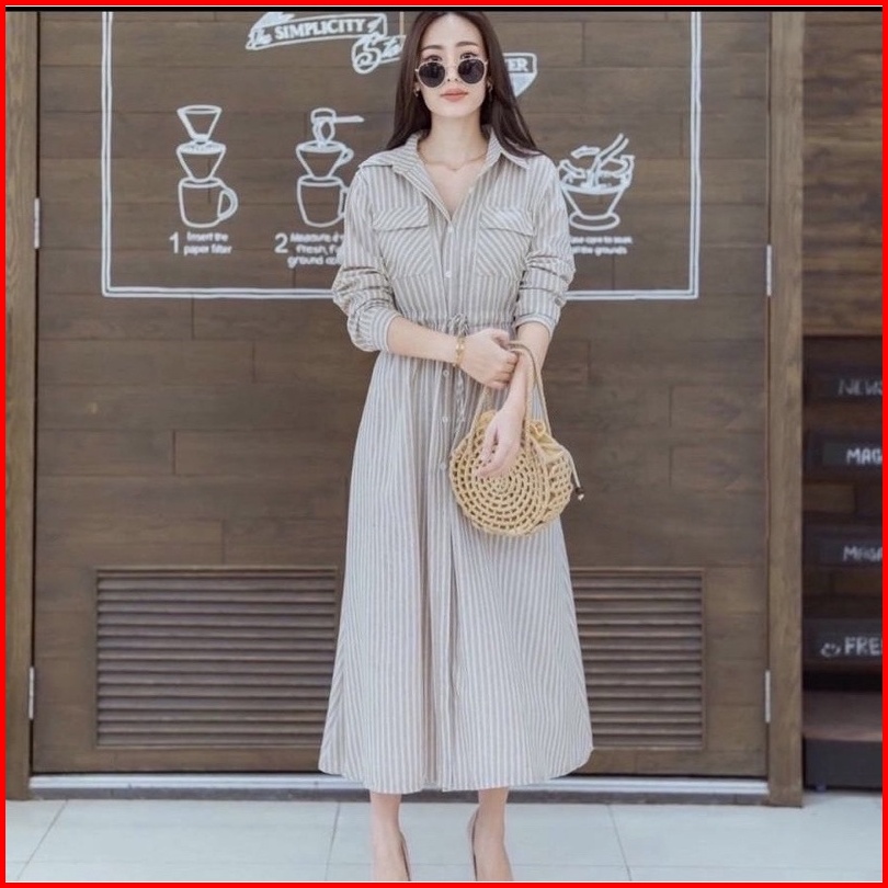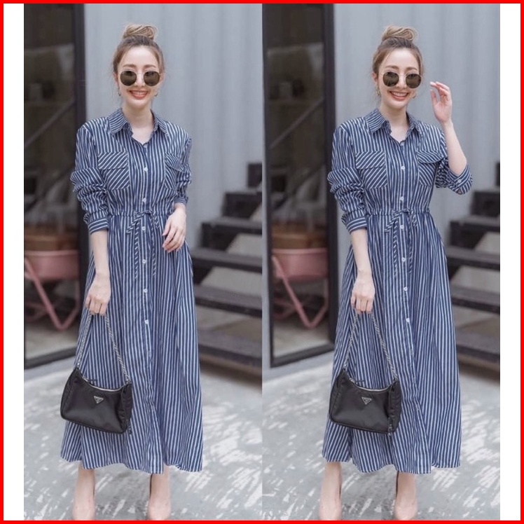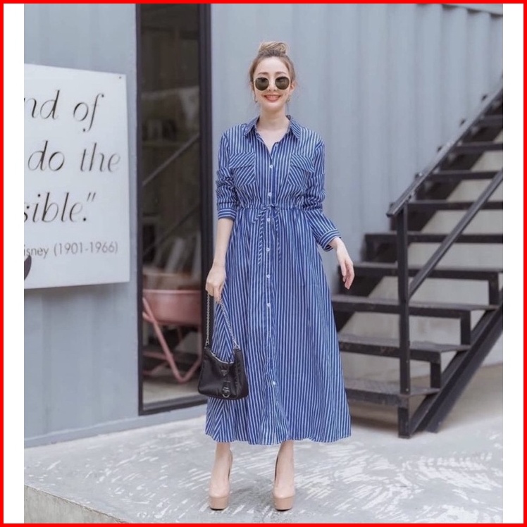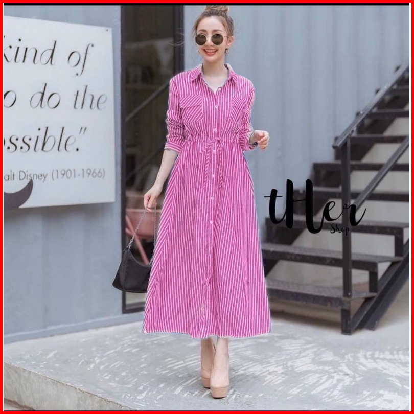 Maxi Dress Shirt Stripe Korean Design Maxy Fashion Salur