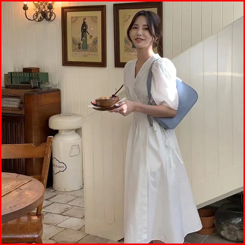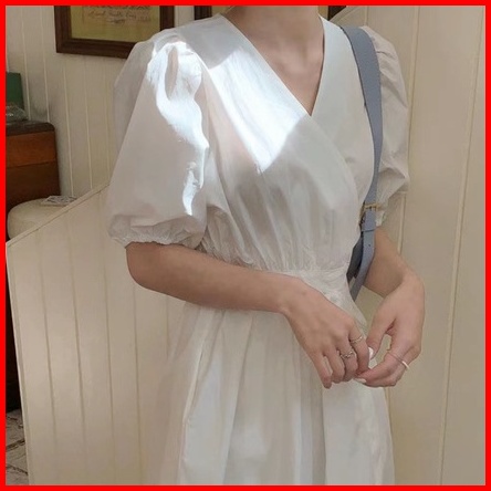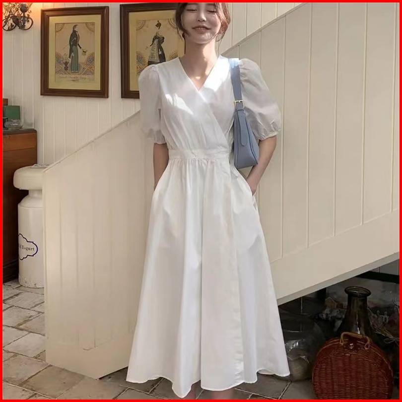 Bahasa Perancis Gaun Putih Wanita Musim Panas Puff Lengan One Piece V Leher Pinggang Tipis Temperamen Di Atas Lutut Rok