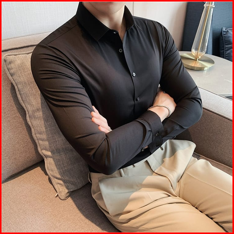 Streetwear - Kemeja Pria Hitam Polos Lengan Panjang Lycra Shirt Kasual Super Stretch Slimfit Elastis