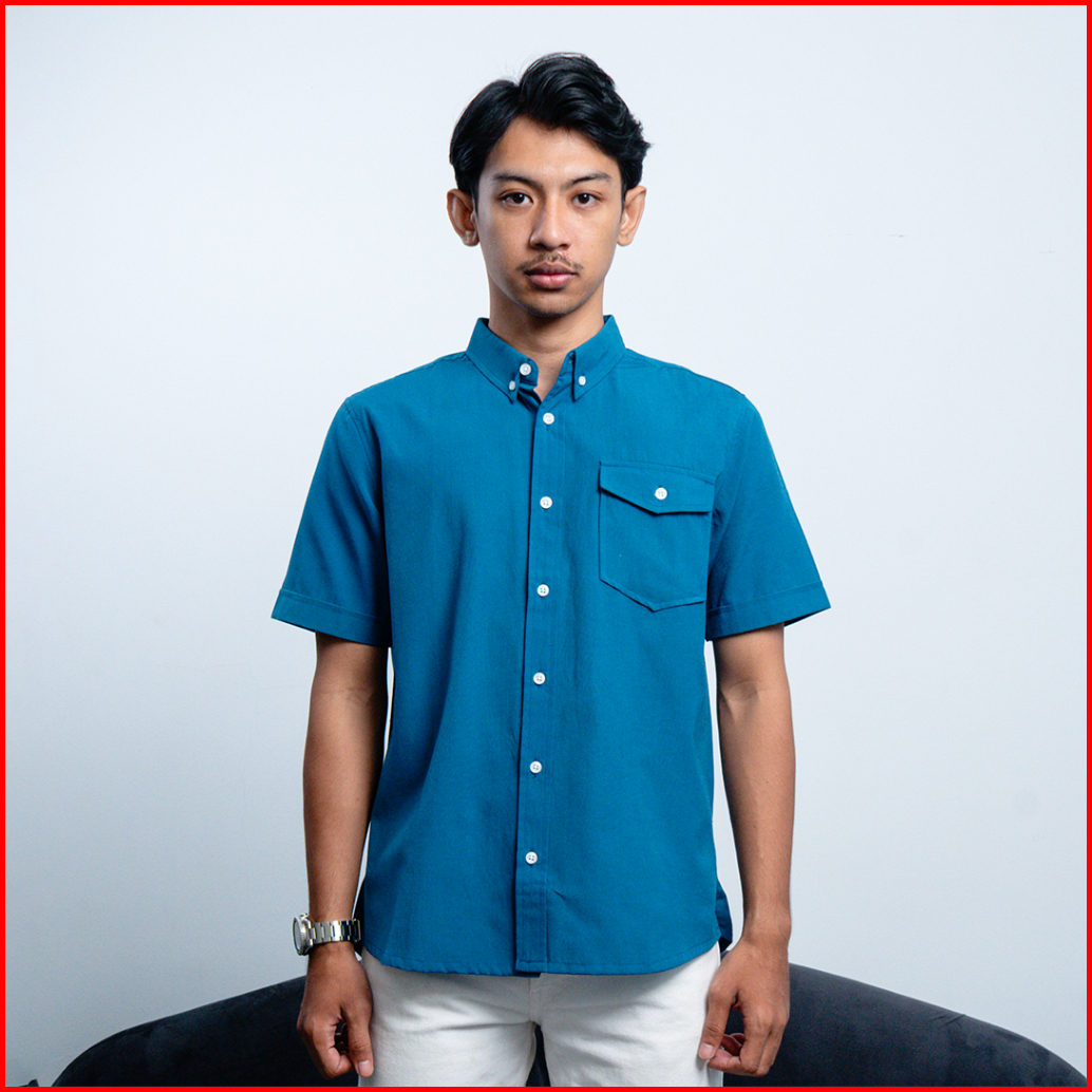 Mainworks Kemeja Pria Polos Biru Turqouise Cotton Oxford Lengan Pendek