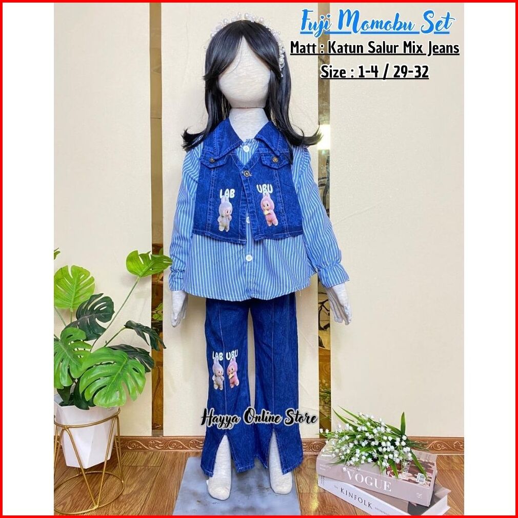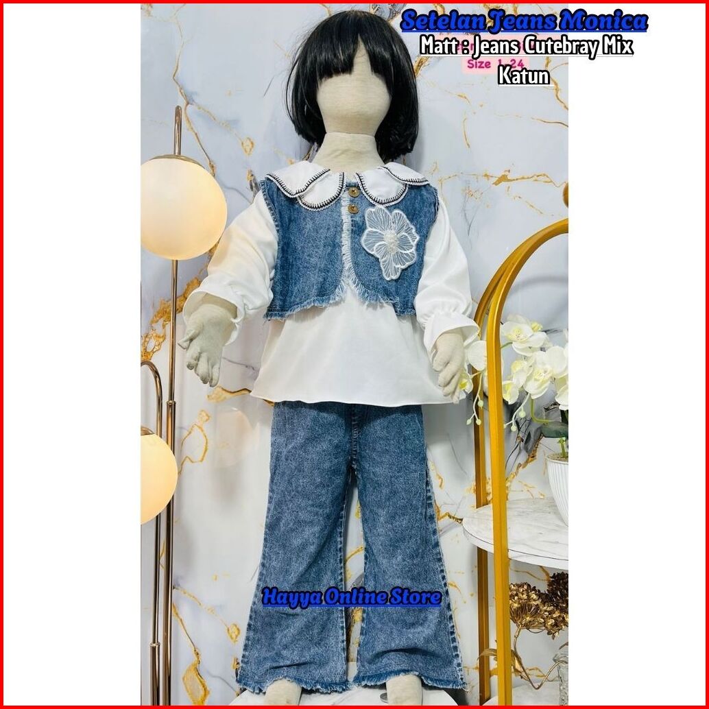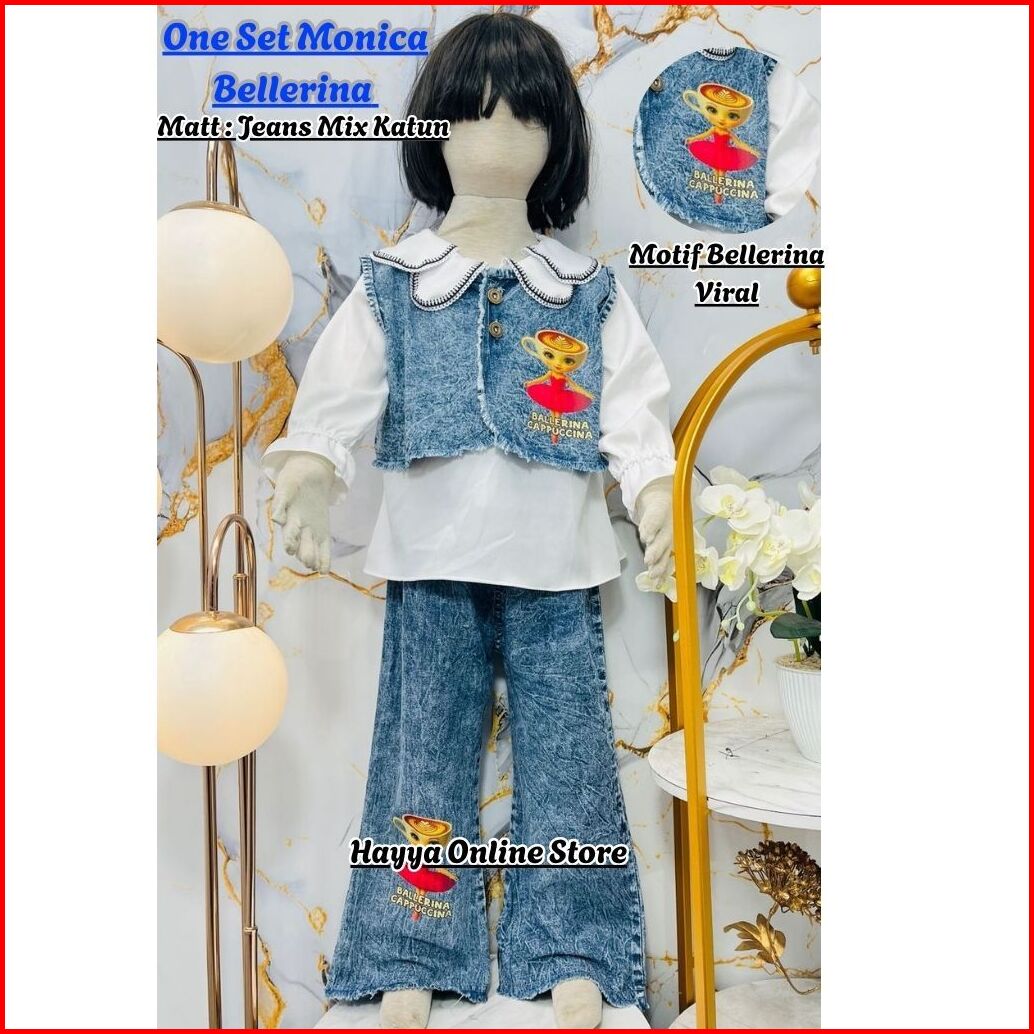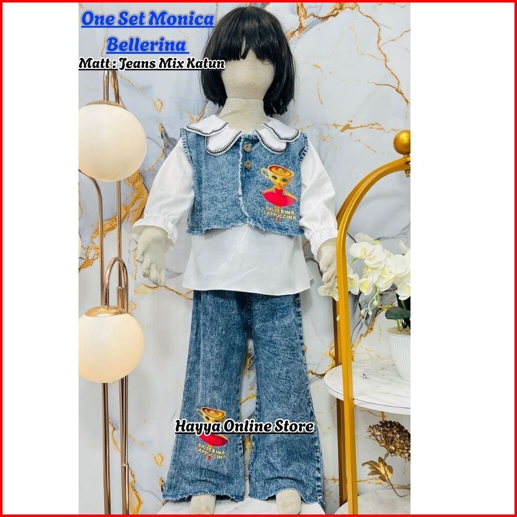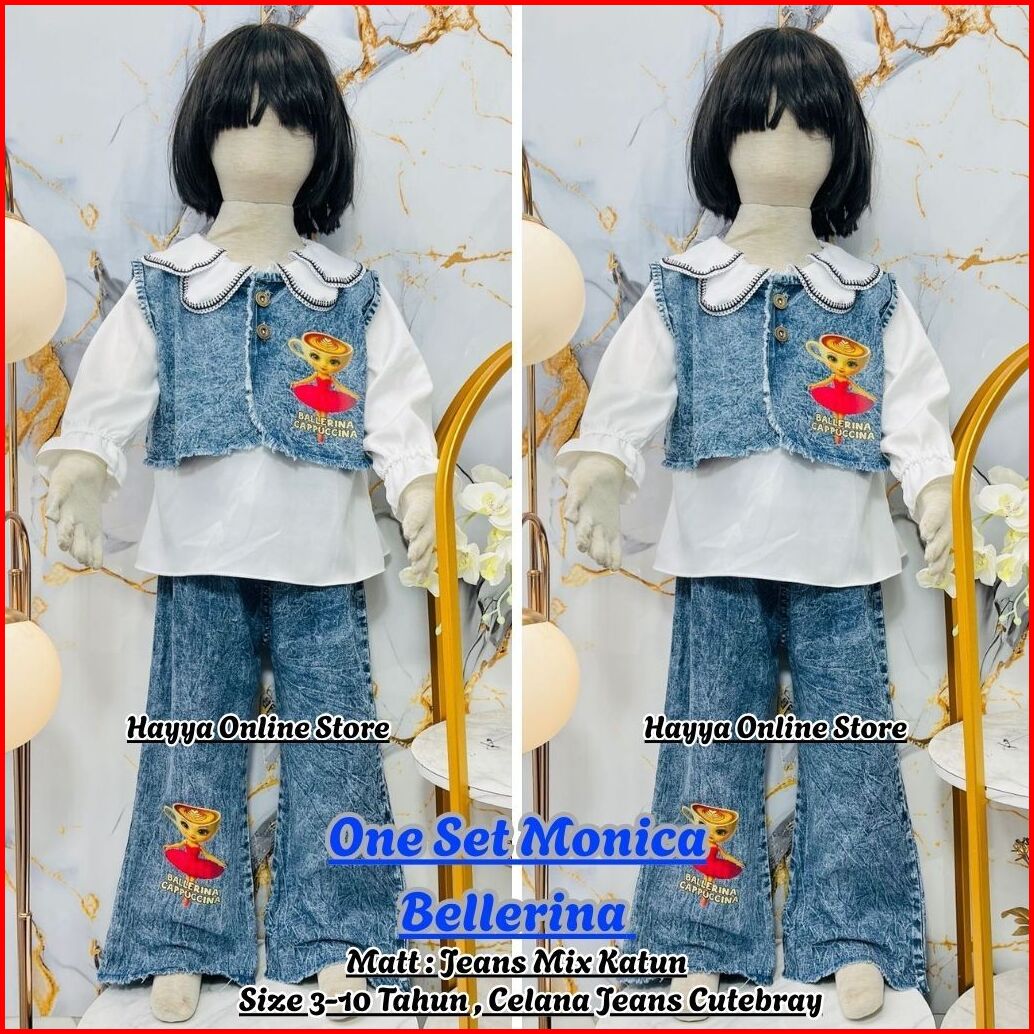 New Setelan Anak Monica Rompi Motif Ballerina Cappucina Virall Korean Style Celana Cutebray Usia 3-10 Tahun Bahan Jeans
