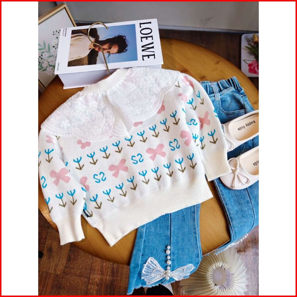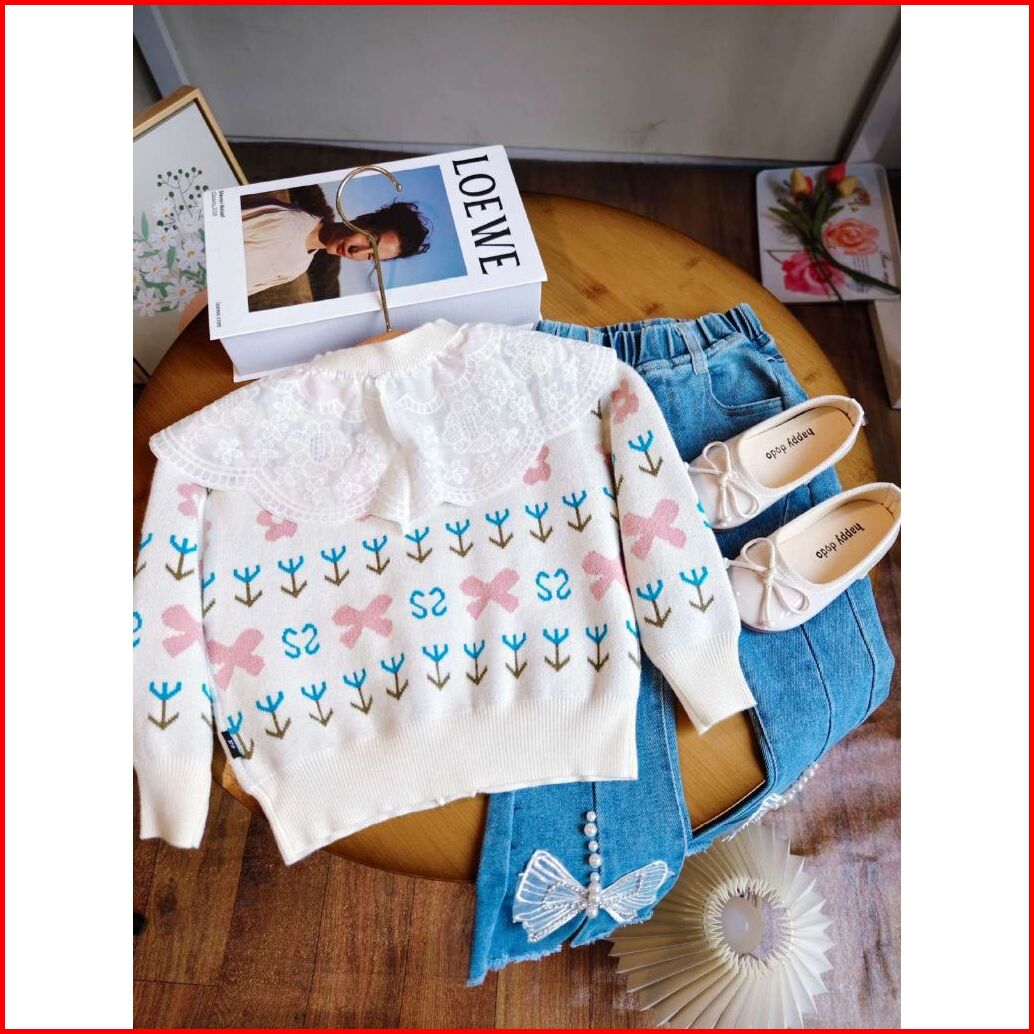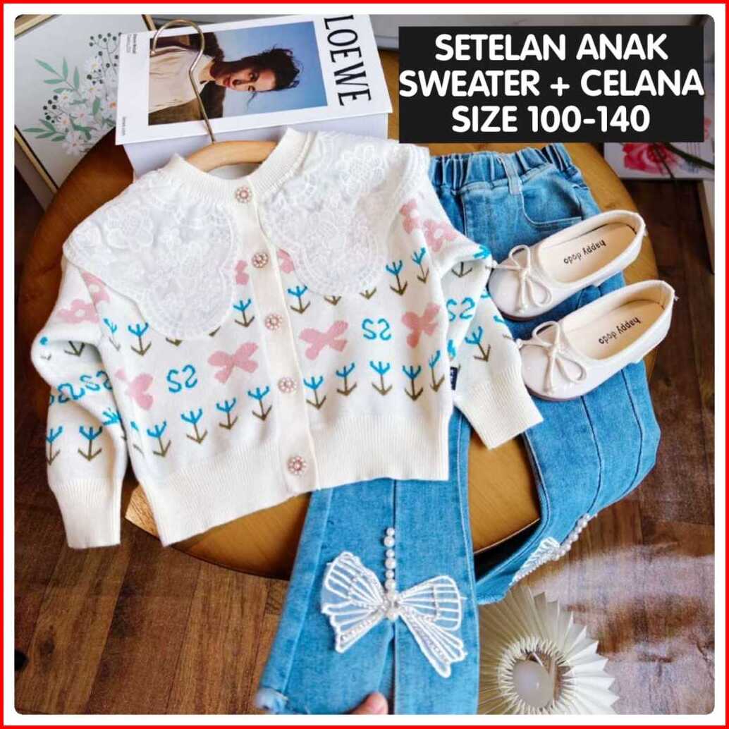 Loli-jkt Bs- 630 Setelan Anak Sweater Kerah Bordir Bunga Celana Jeans Pita Size 100-140