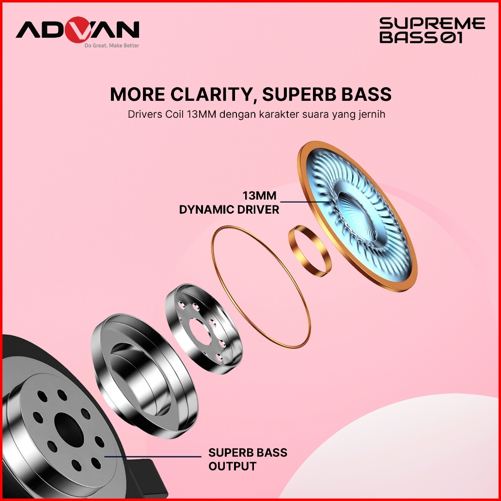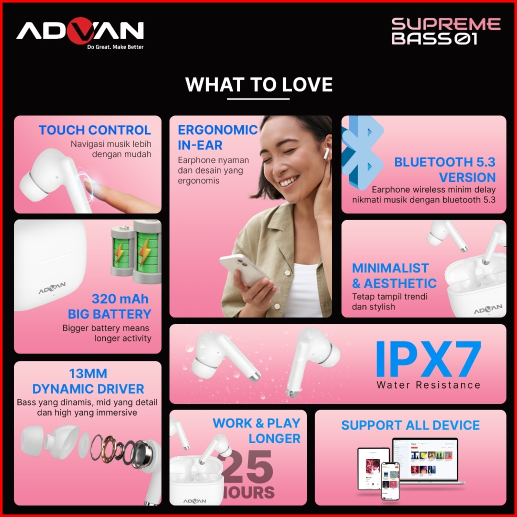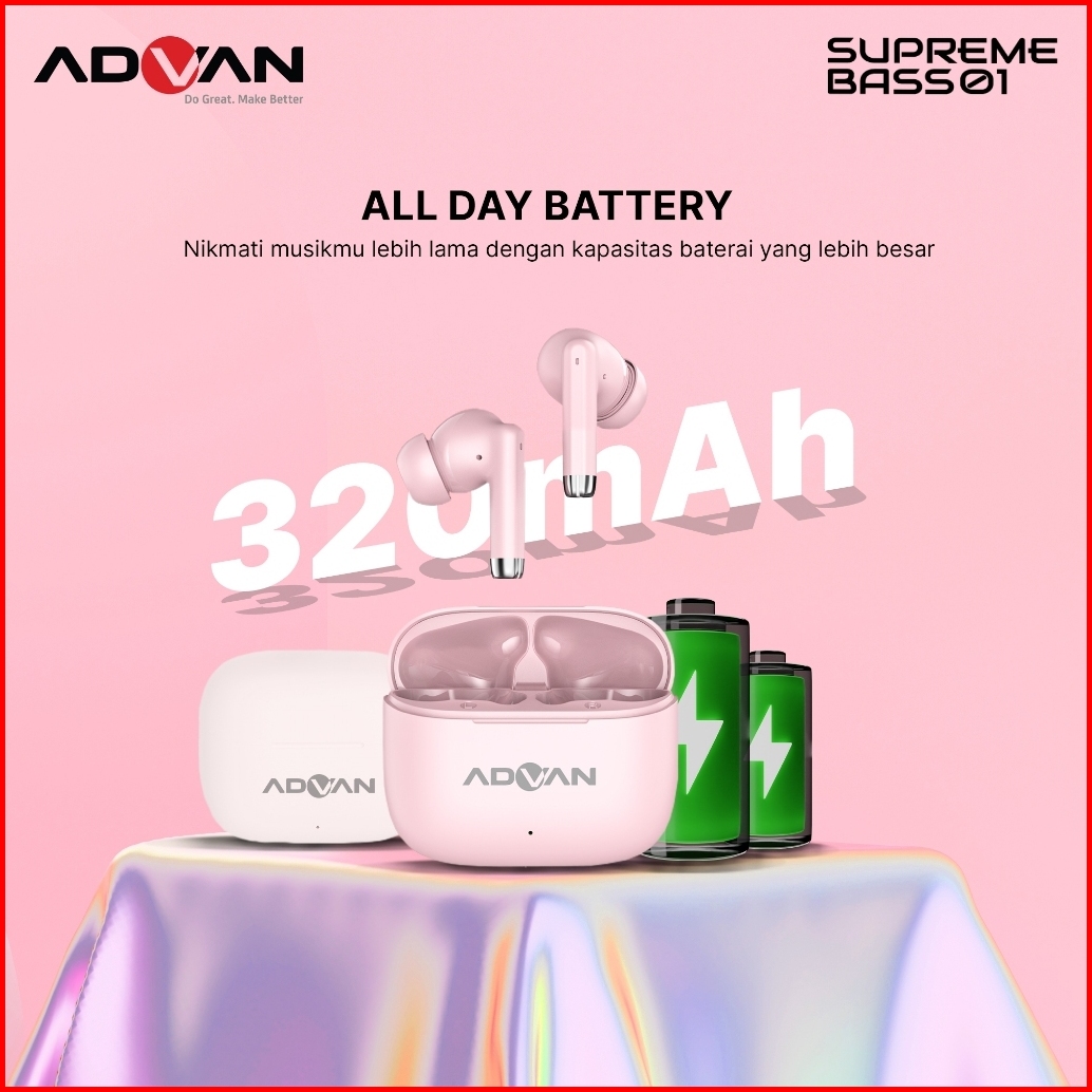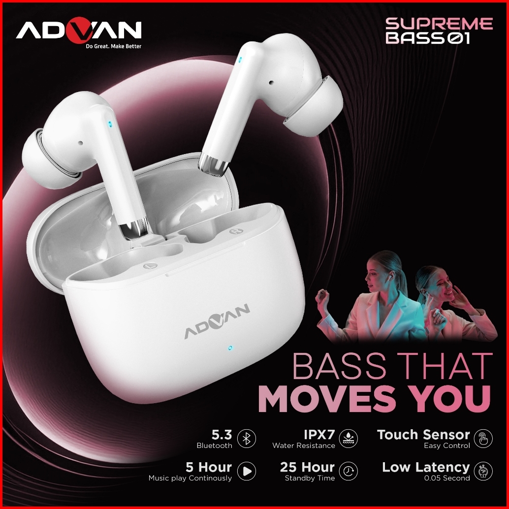 Advan True Wireless Earphone Tws Supreme Bass 01 Bluetooth 5.3 Earbuds Tws Ipx 7 Dynamic Driver 13mm - Garansi 1 Tahun