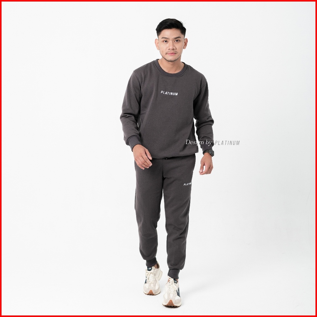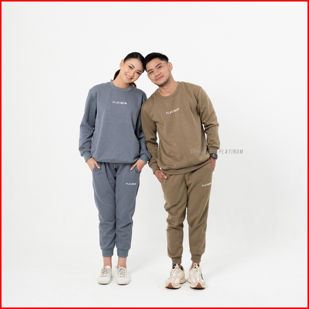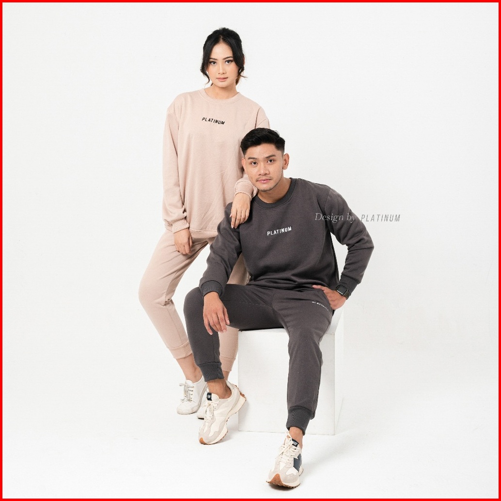 Platinum World Oneset Crewneck Celana Jooger Couple Unisex Pria - Wanita Ukuran Jumbo Oneset Kasual Sporty Olahraga Gym