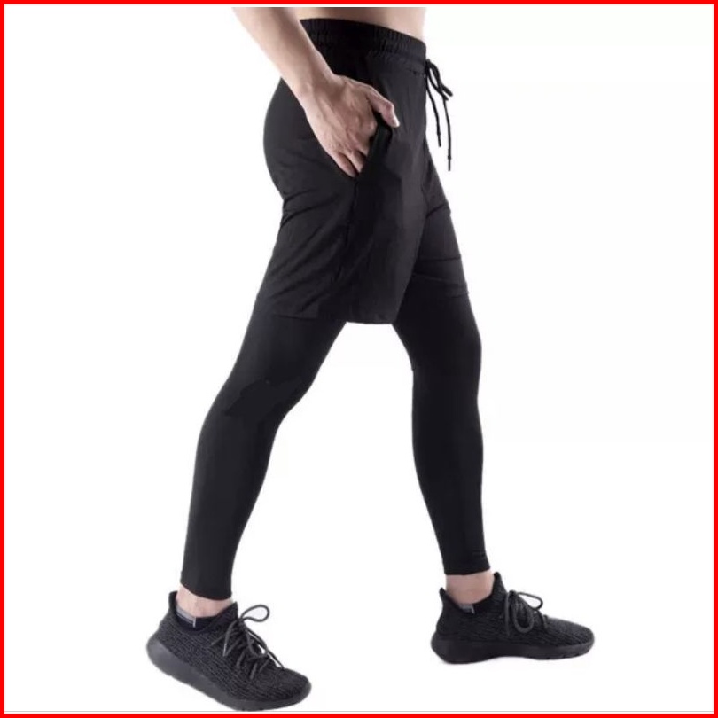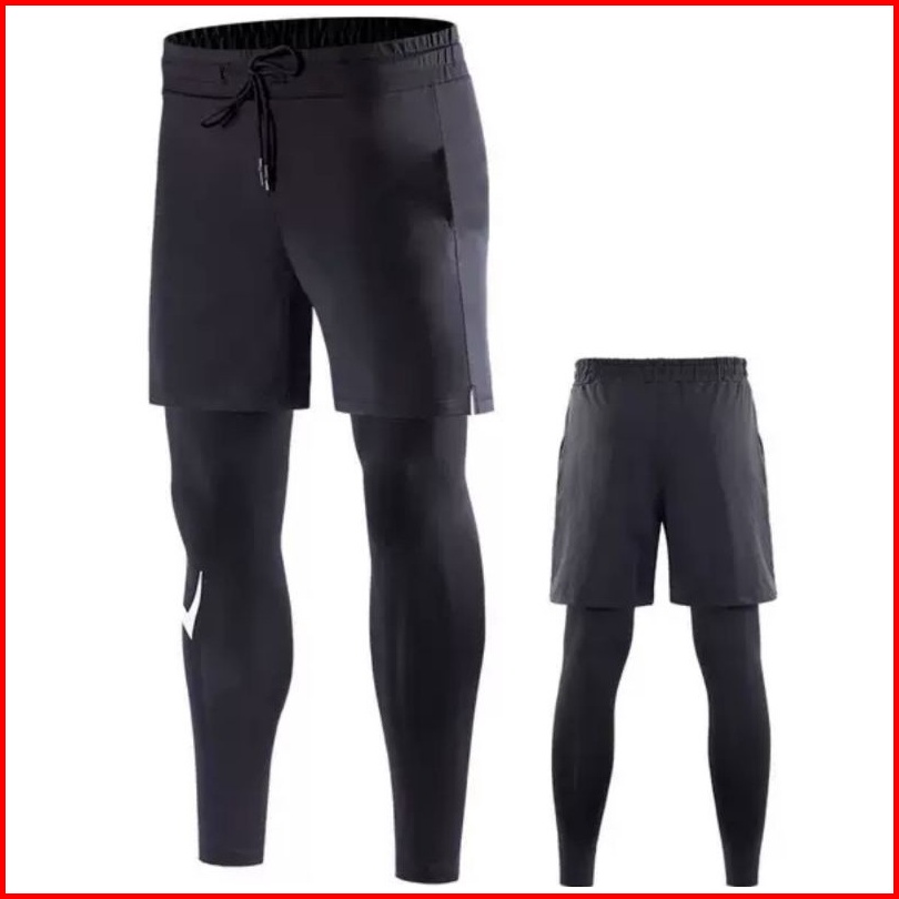 Celana Pendek 2 In 1 Pria Legging Panjang Olahraga Gym Fitness Lari Sepeda Man 2in1 Shorts Running