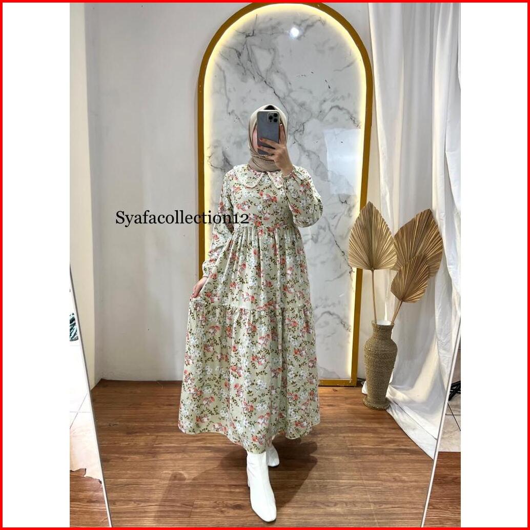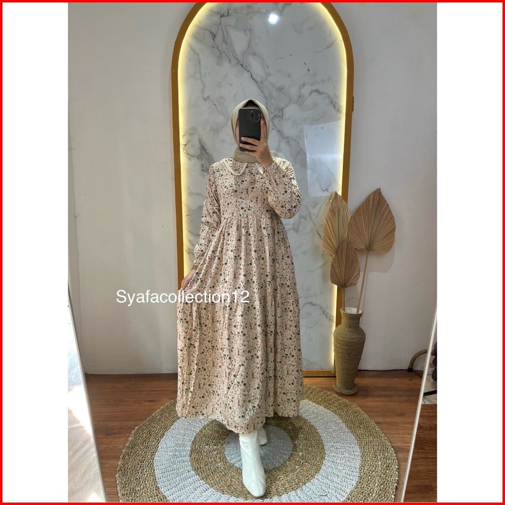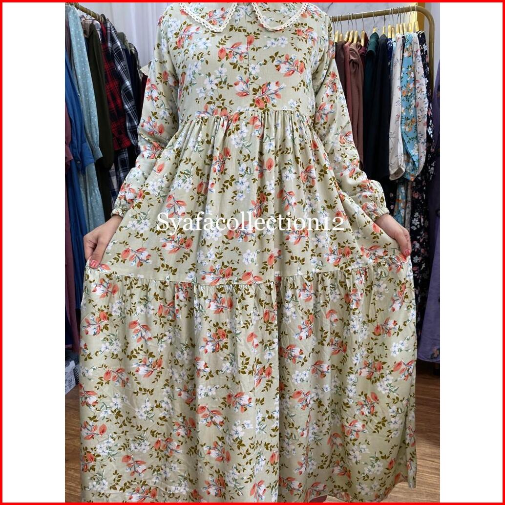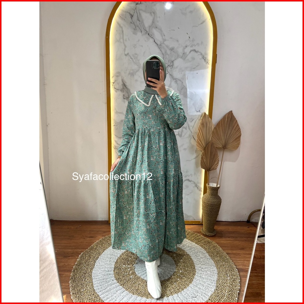 Syafacollection 032 Midi Dress Rayon Motif Bunga Jumbo Renda Busui Kantong Gamis Muslim Butik
