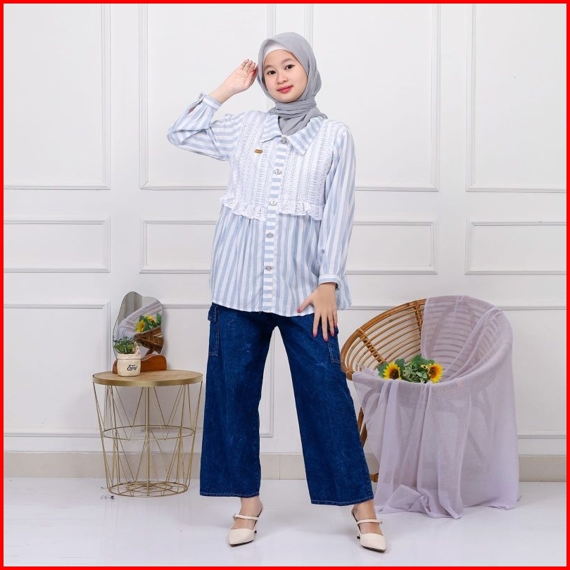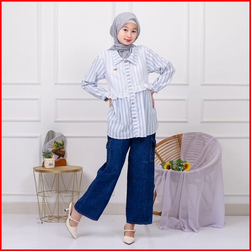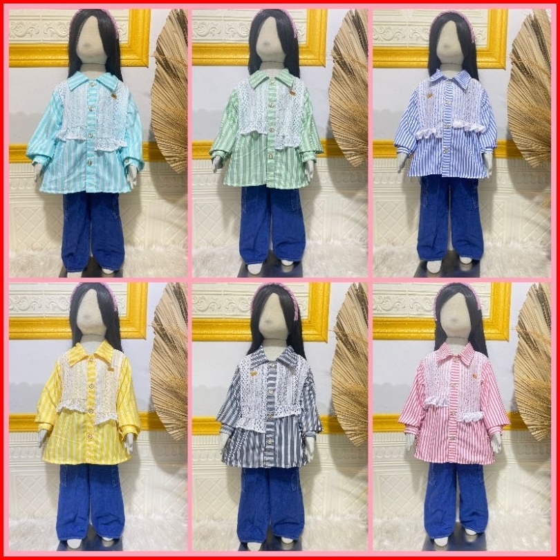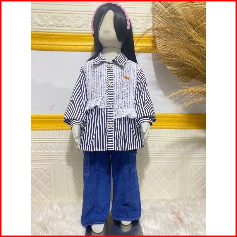Setelan Kemeja Salur Mix Brukat Malika Celana Jeans Anak Perempuan Usia 3 Tahun - 12 Tahun Baju Stelan Jeans Cargo Salur