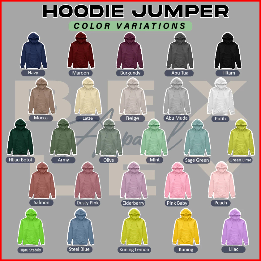 HITAM, PUTIH, NAVY, MAROON, ABU TUA, ABU MUDA, LATTE, BEIGE, COKLAT MOCCA, LILAC, HIJAU ARMY, HIJAU BOTOL, PEACH, SALMON, DUSTY PINK, BABY PINK, STEEL BLUE, OLIVE, MINT, SAGE GREEN, GREEN LIME, KUNING, ELDERBERRY, BURGUNDY, WARNA LAIN