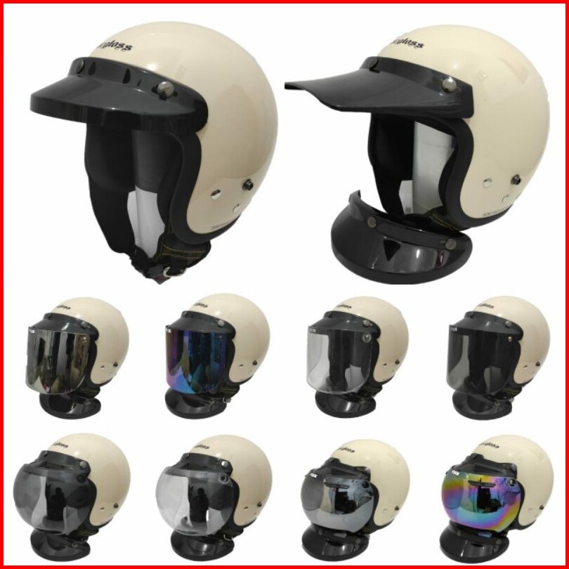 Pet pendek, +pet panjang, +Visor Flat pelangi, +Visor Flat Silver, +Visor Flat Hitam, +Visor Flat Bening, +Visor Cembung Hitam, +Visor Cembung Clear, +KC Cembung Silver